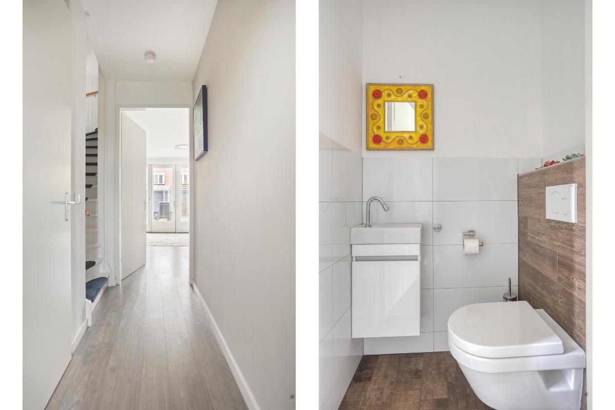 Entrance The hallway features a laminate floor, smooth plastered walls and ceiling, a meter cupboard, staircase, and a separate toilet. The toilet is partly tiled in a modern style and fitted with a wall-hung WC and hand basin.