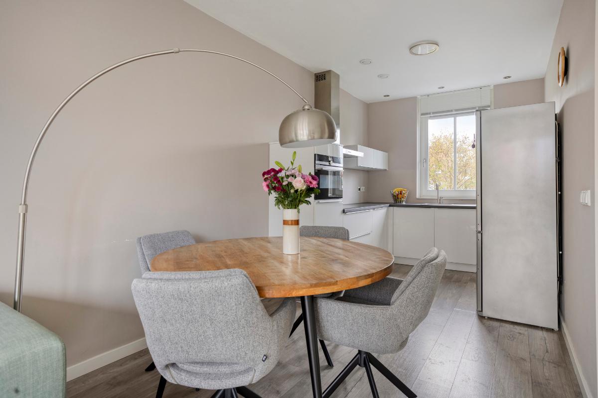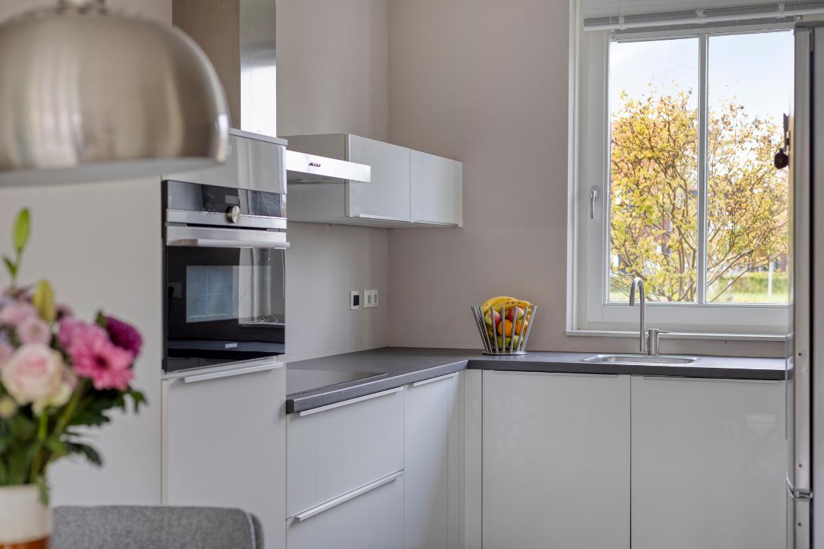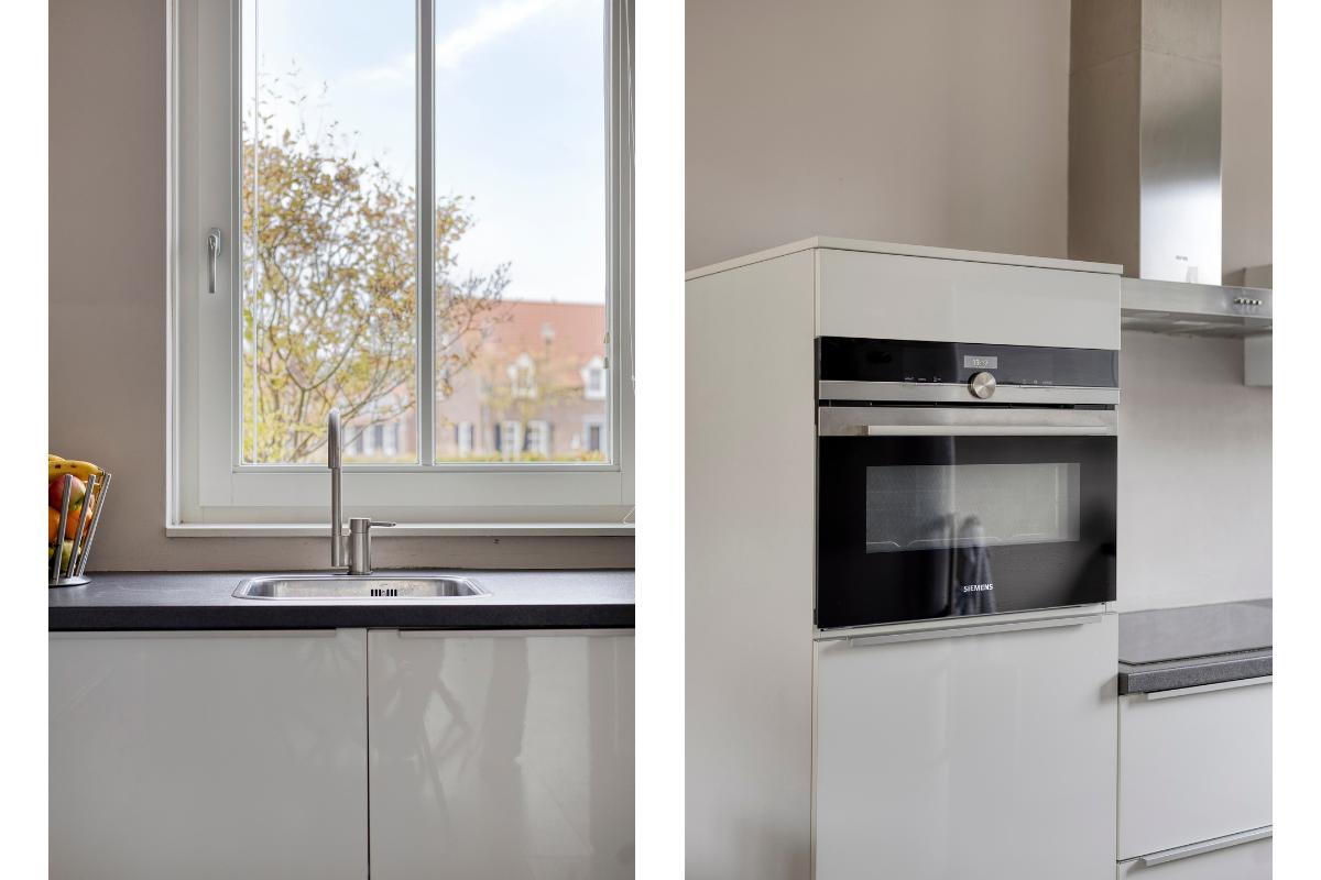 De moderne en complete keuken is gelegen aan de voorzijde van de woning en kijkt fraai uit over de groenvoorzieningen en speeltuintje aan de voorzijde. De keuken is voorzien van een inductiekookplaat, RVS afzuigkap (recirculatie), vaatwasser, inbouwkoelkast, close-in-boiler en combi-magnetron. Diverse kasten en lades zorgen voor extra opslag in de keuken.