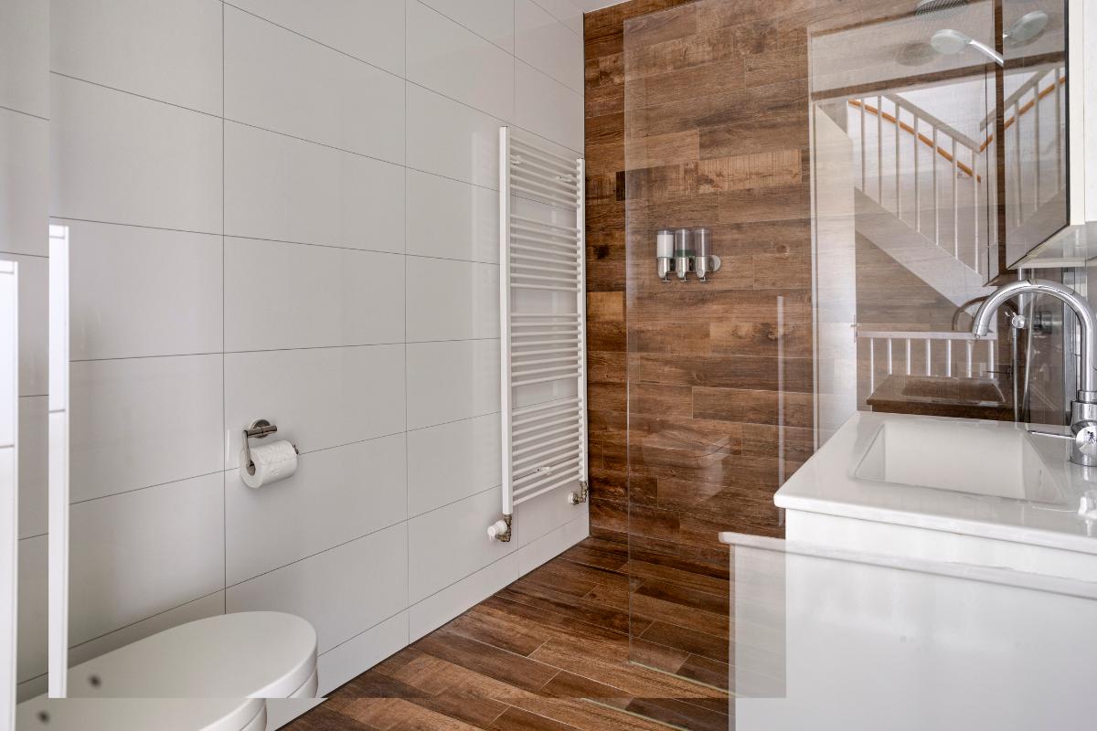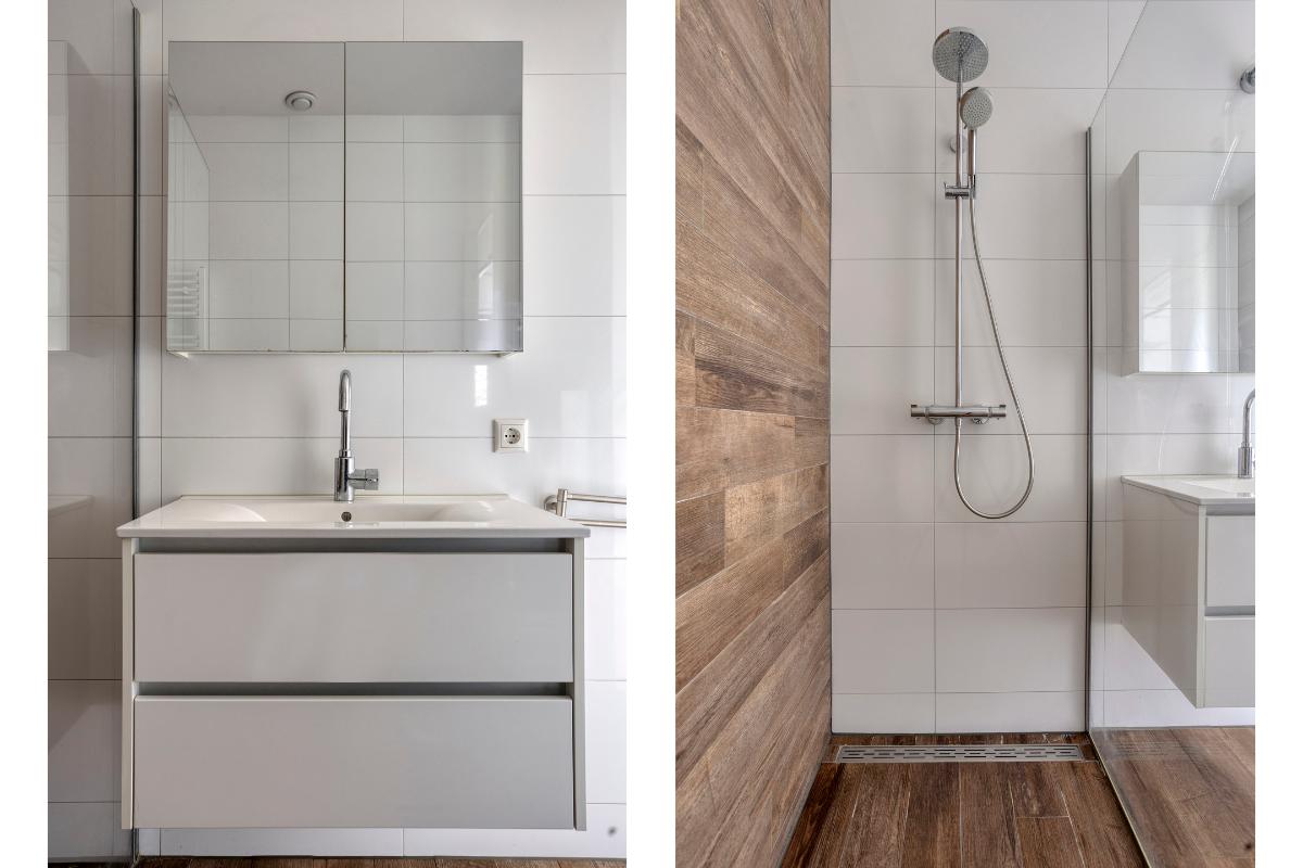 De moderne badkamer is geheel betegeld en beschikt over een inloopdouche met glazen douchewand, thermostaatkraan, een wandcloset, designradiator en brede wastafel met meubel en spiegelkast. De badkamer wordt via de mechanische ventilatie-unit geventileerd.