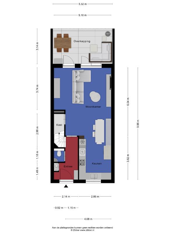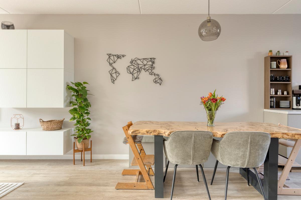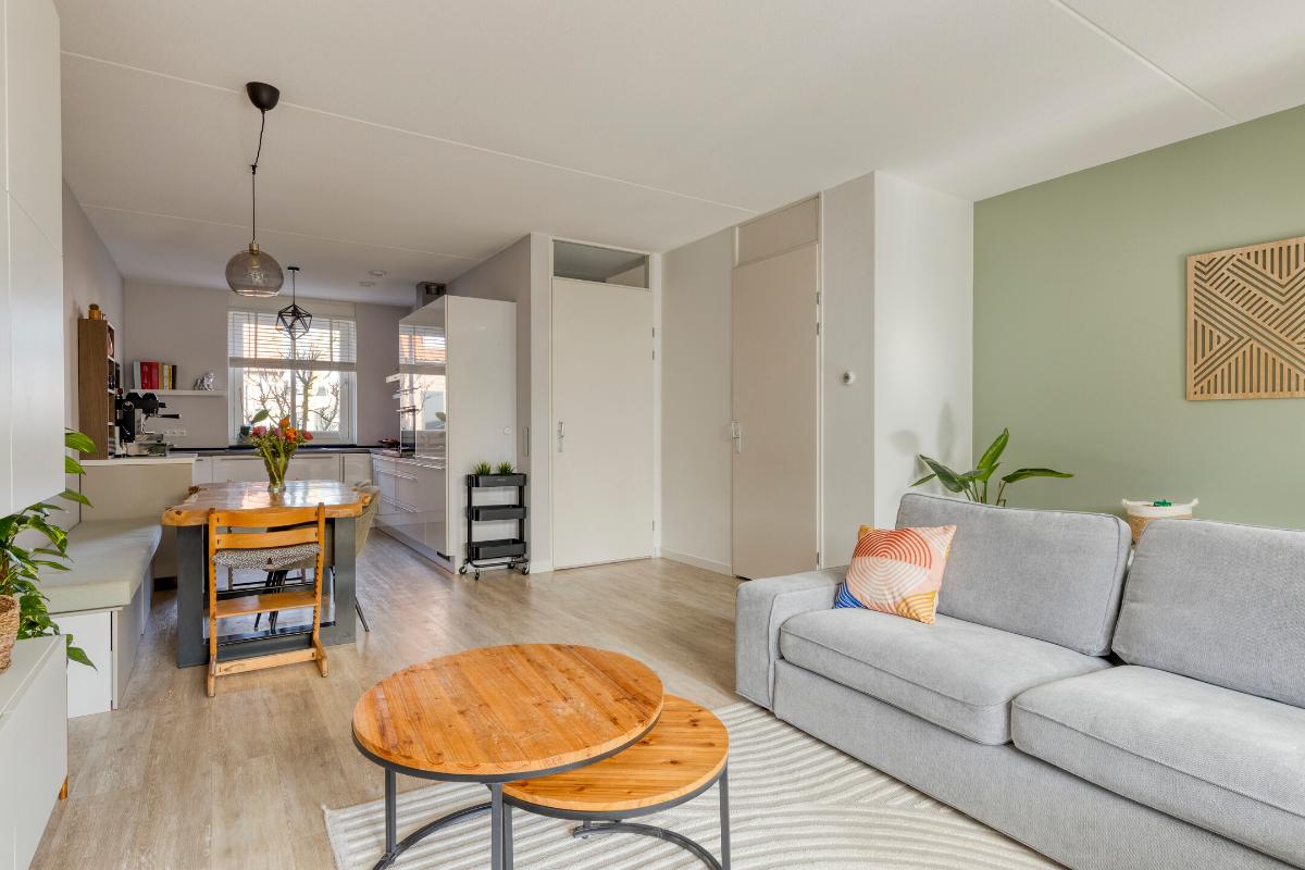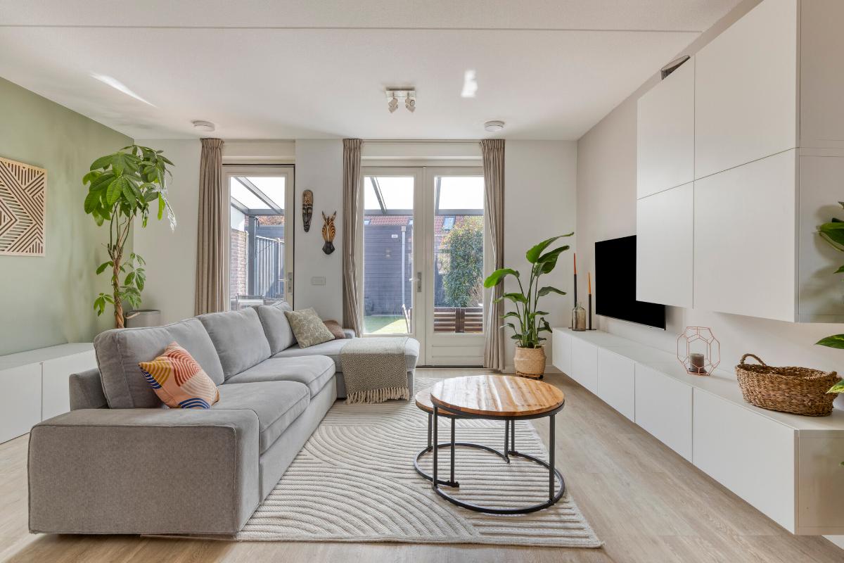 De ruime woonkamer is eveneens voorzien van een pvc-vloer met vloerverwarming en strak afgewerkte wanden. Dankzij de openslaande tuindeuren en de ligging op het zuiden geniet de woonkamer van een prettige lichtinval. Daarnaast beschikt de woonkamer over een praktische trapkast voor extra bergruimte.