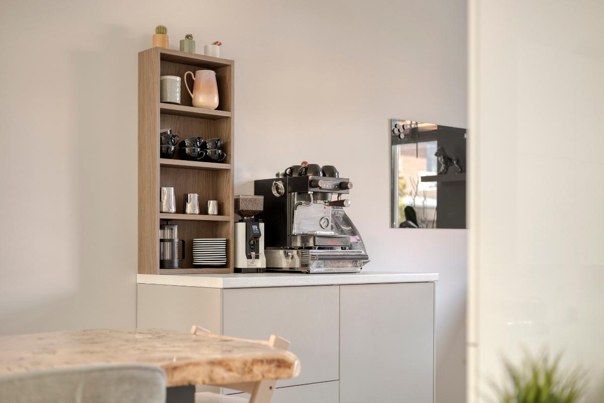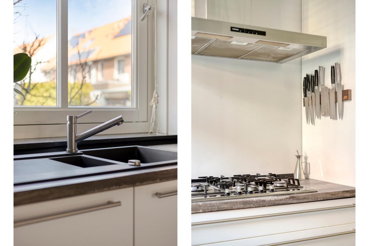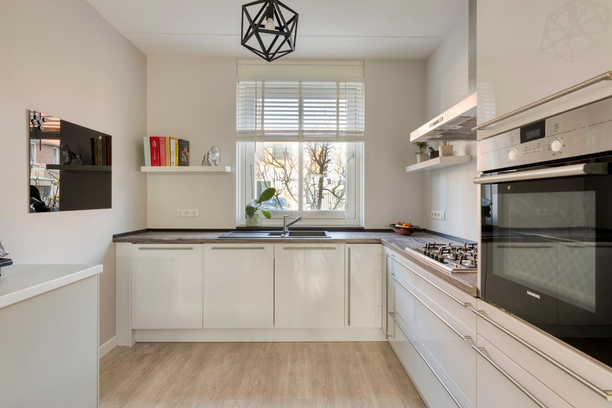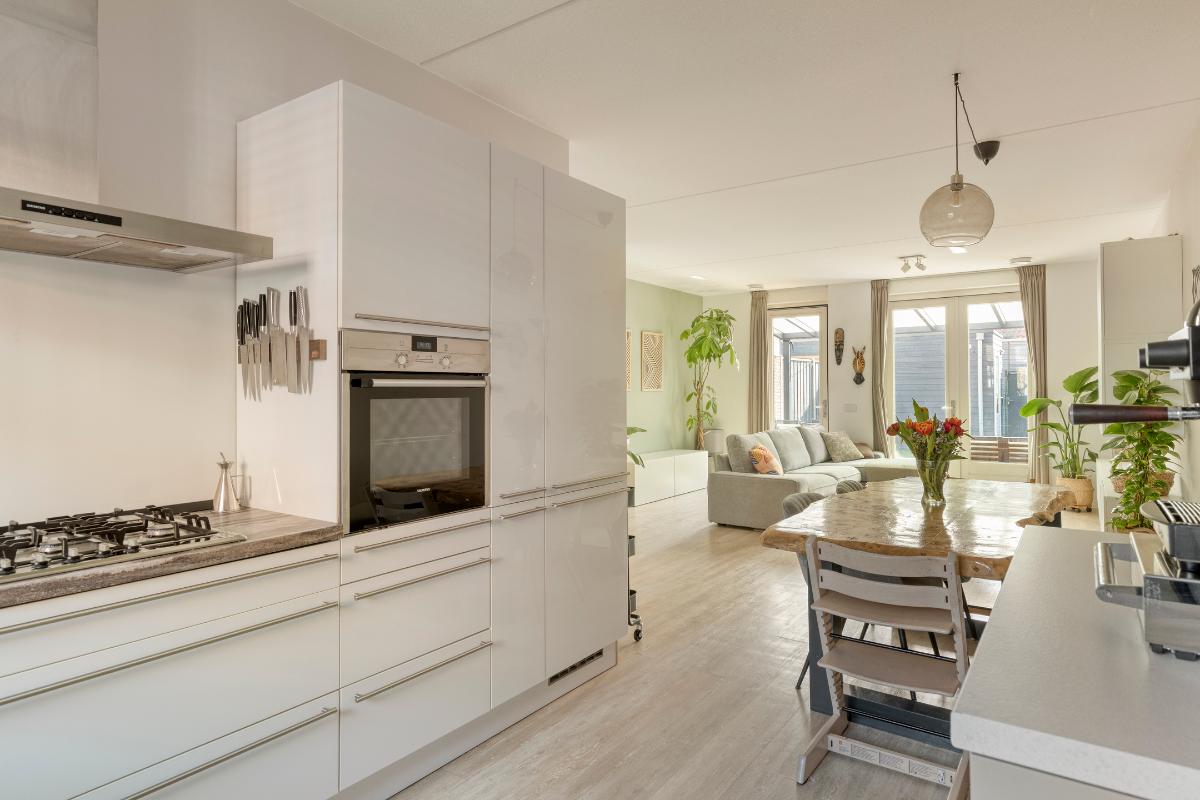 De open keuken bevindt zich aan de voorzijde van de woning en is uitgevoerd in een praktische hoekopstelling met veel werk- en bergruimte. De keuken is voorzien van diverse inbouwapparatuur (Siemens en Neff), waaronder een 5-pits gaskookplaat, afzuigkap, koelkast, vrieskast, oven en een geïntegreerde vaatwasser.