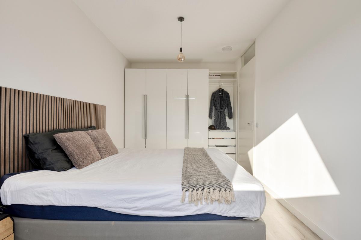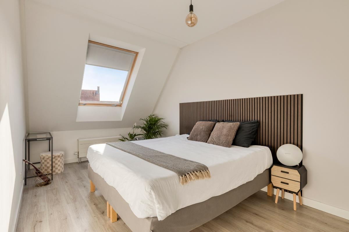 De ouderslaapkamer is gelegen aan de achterzijde van de woning en beschikt over een laminaatvloer en een groot dakraam voor een prettige lichtinval en natuurlijke ventilatie.