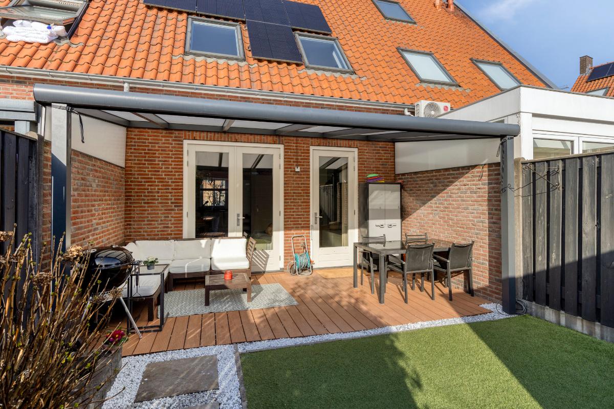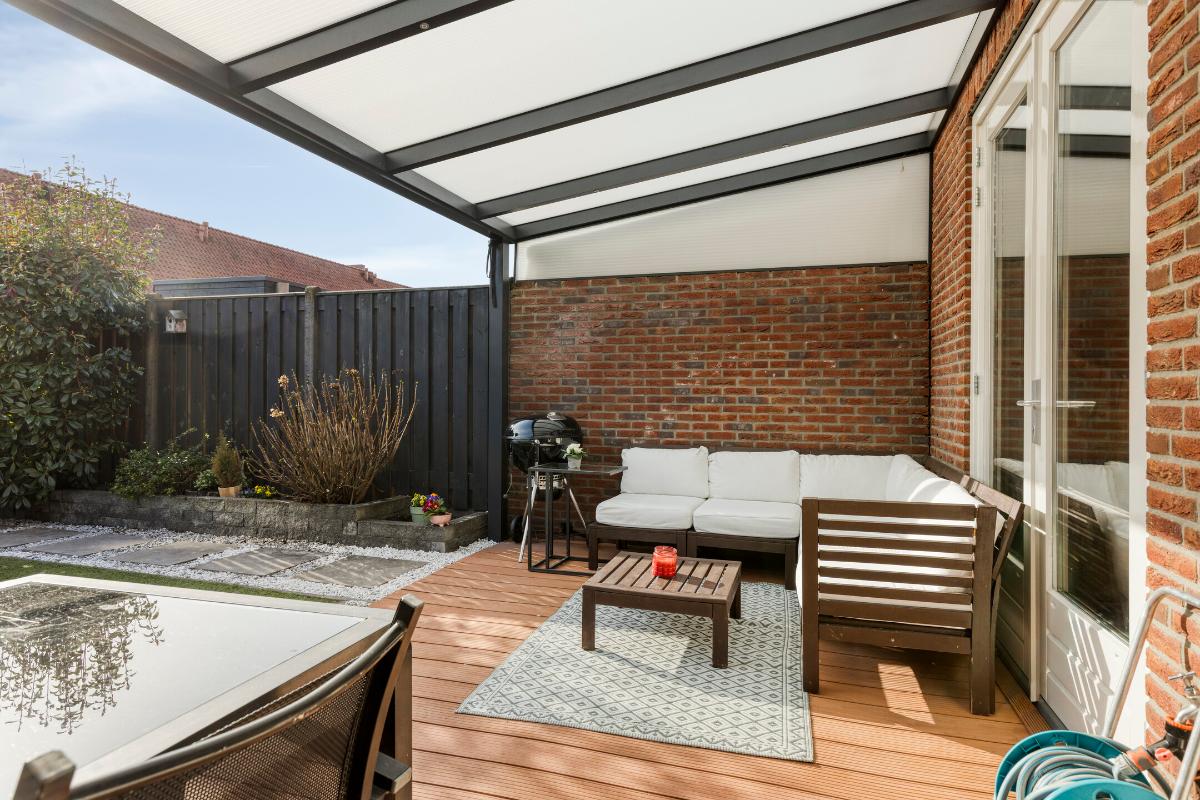 De verzorgd aangelegde achtertuin is gunstig gelegen op het zuiden en beschikt over een aluminium overkapping met verlichting, een vlonderterras, kunstgras en borders met beplanting.