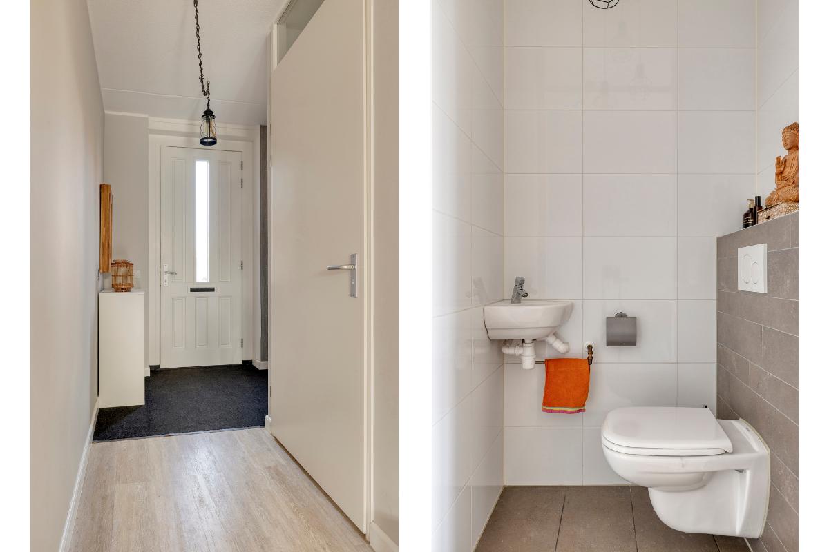 Via de verzorgde voortuin bereikt u de entree van de woning. In de hal bevinden zich de meterkast, de modern afgewerkte toiletruimte en de trapopgang naar de eerste verdieping. De hal is afgewerkt met een pvc-vloer met vloerverwarming.