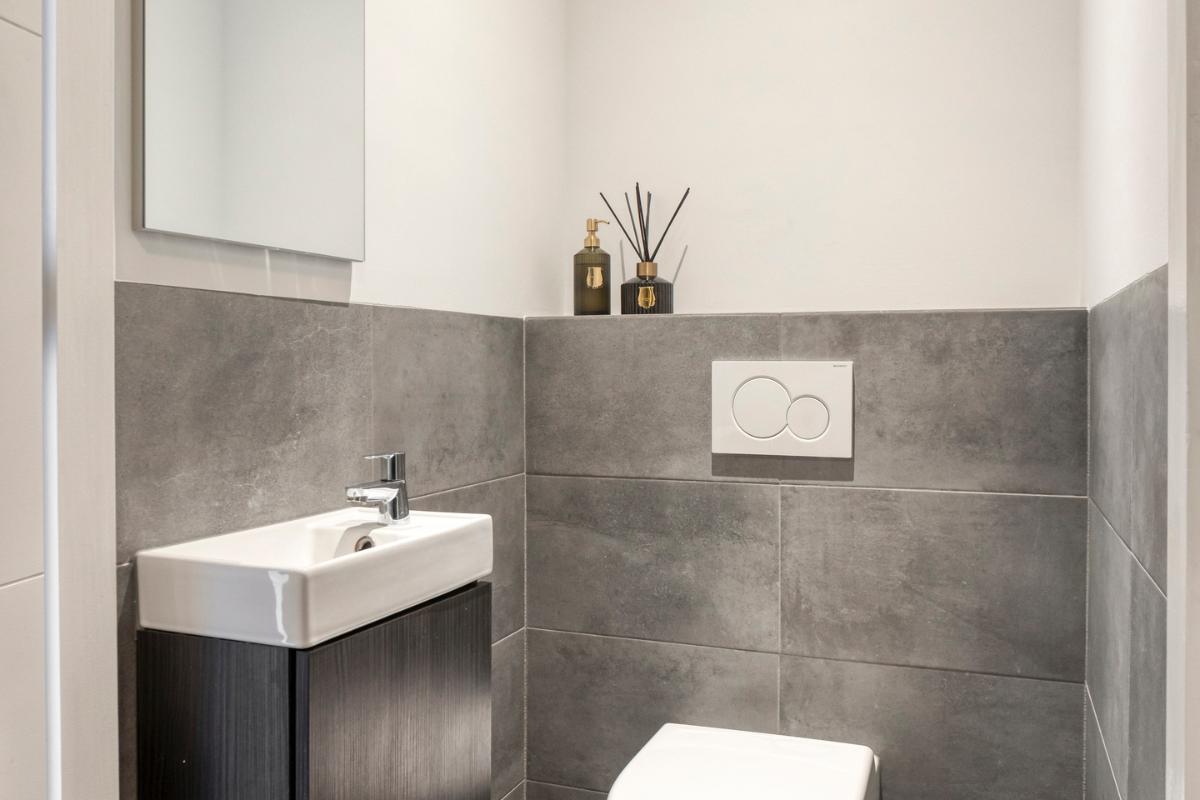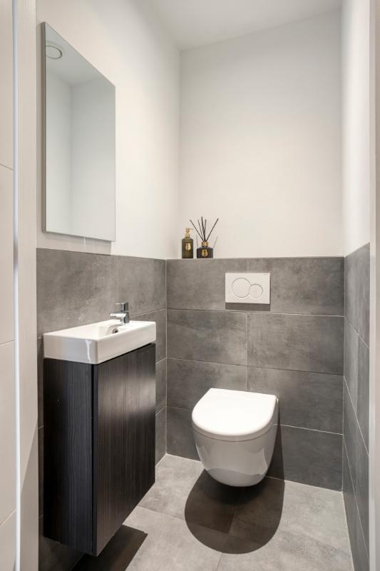 De toiletruimte is modern betegeld en voorzien van een wandcloset en fonteintje met meubel.