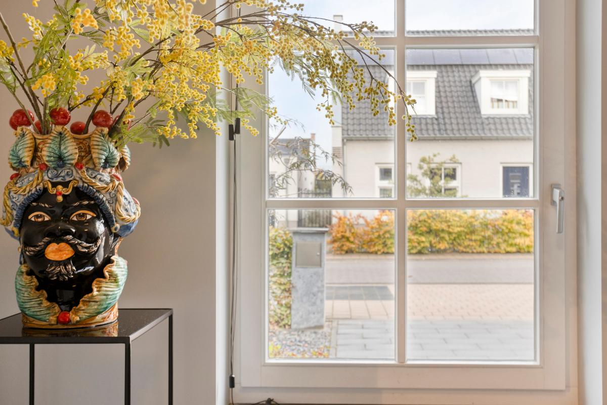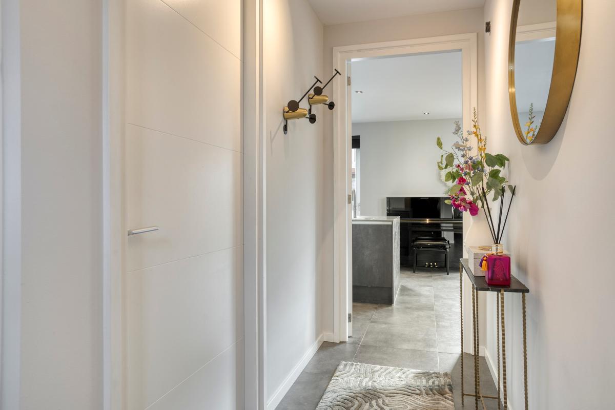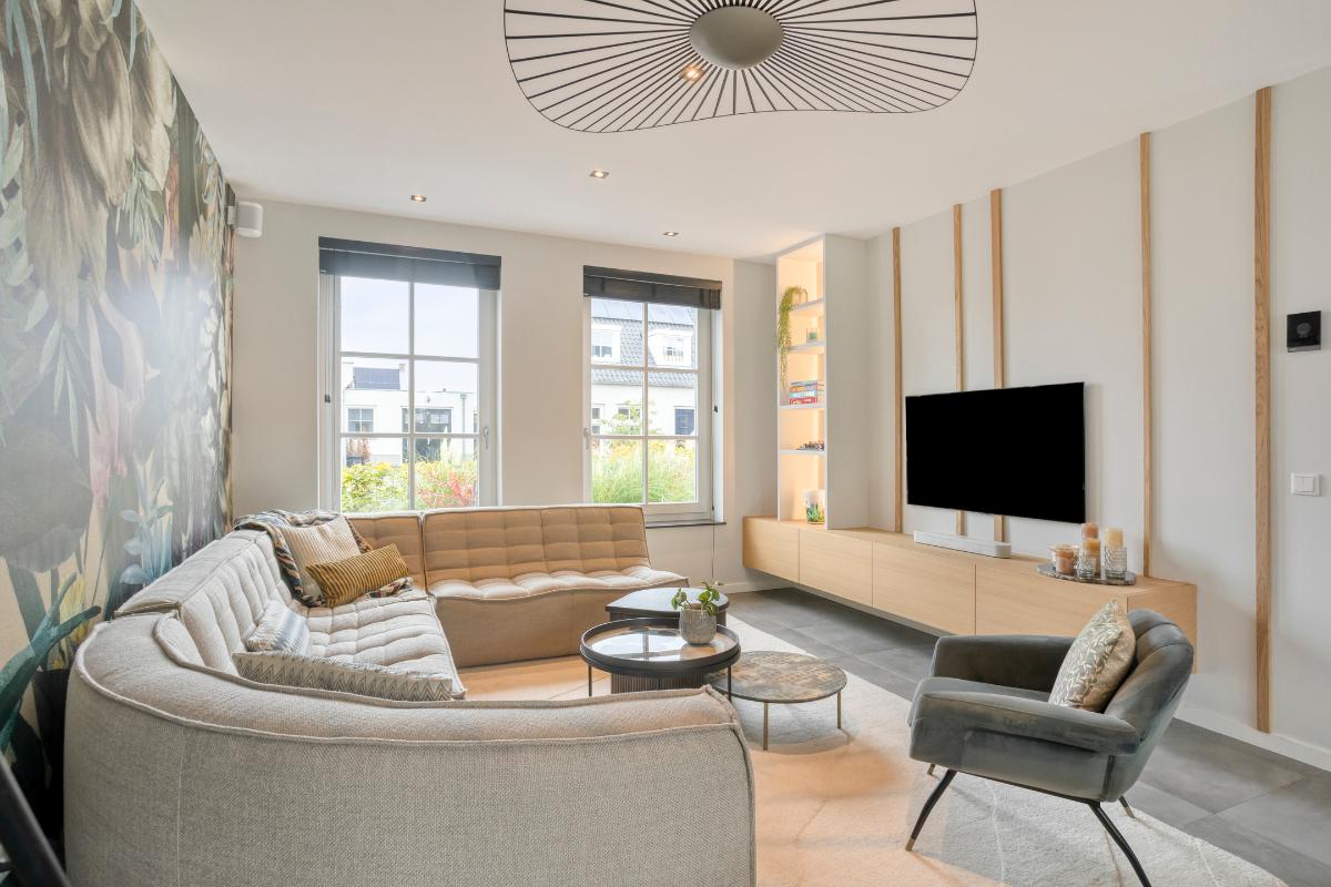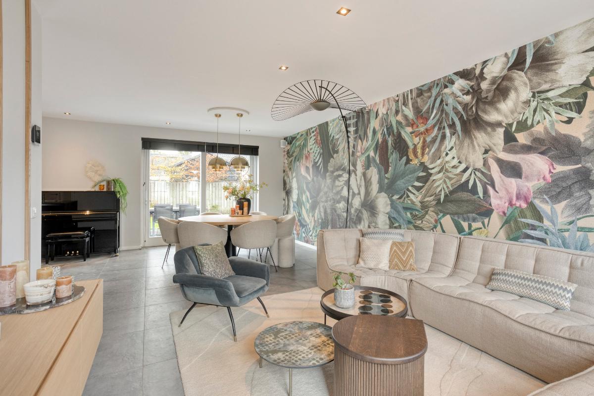 De royale L-vormige woonkamer geniet een prettige lichtinval dankzij de grote raampartijen en de schuifpui naar de achtertuin. De ruimte is afgewerkt met een nette tegelvloer voorzien van vloerverwarming en strak gestuukte wanden en plafonds. De airco-unit zorgt in de zomer voor verkoeling en in de winter voor extra warmte. Een praktische trapkast biedt extra bergruimte op de begane grond.