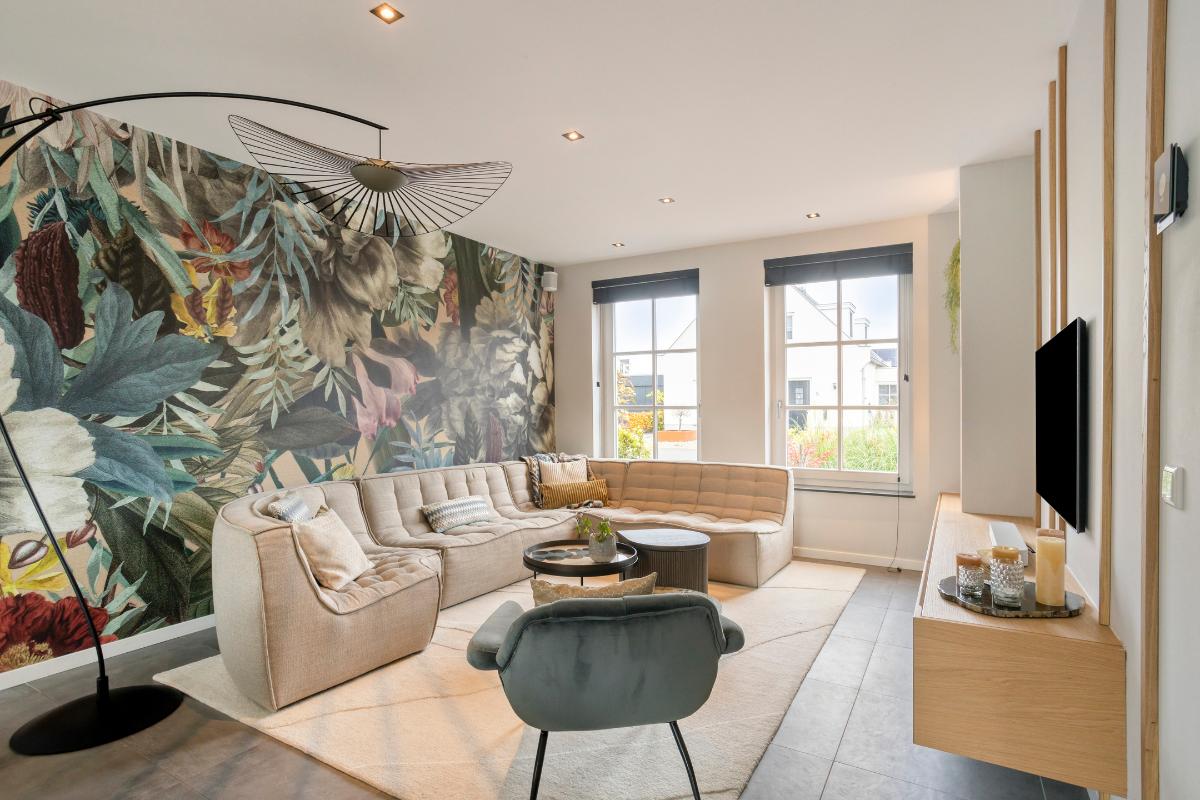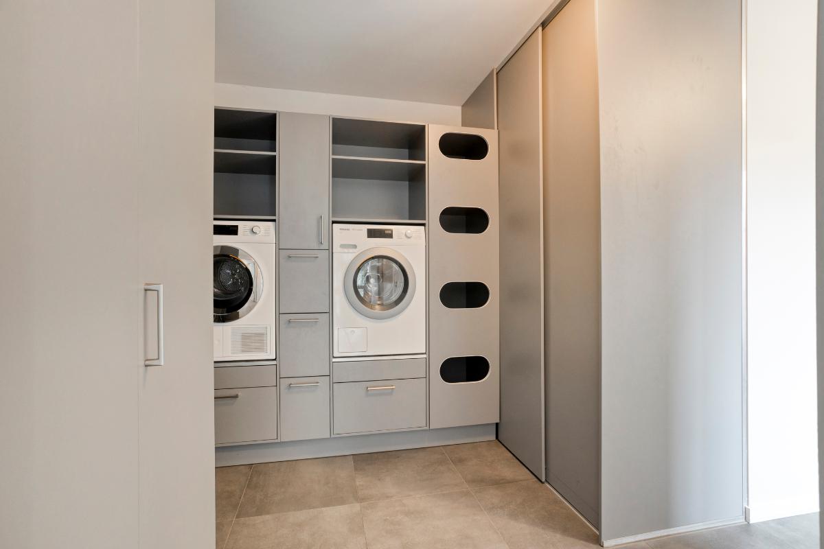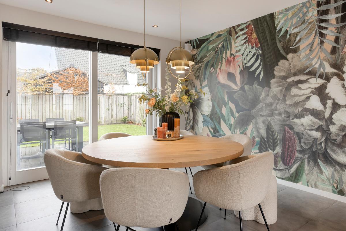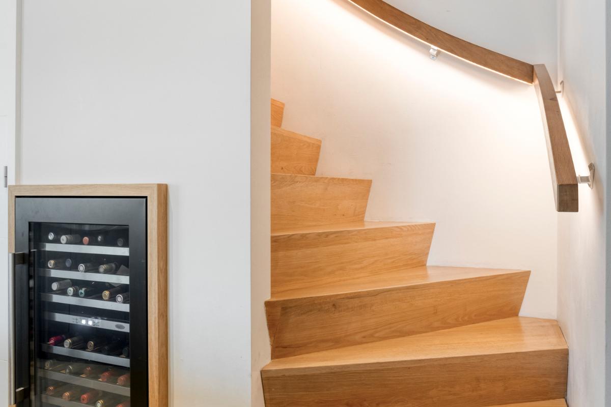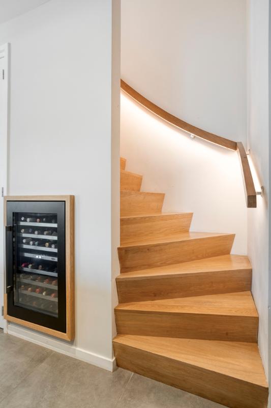 De royale L-vormige woonkamer geniet een prettige lichtinval dankzij de grote raampartijen en de schuifpui naar de achtertuin. De ruimte is afgewerkt met een nette tegelvloer voorzien van vloerverwarming en strak gestuukte wanden en plafonds. De airco-unit zorgt in de zomer voor verkoeling en in de winter voor extra warmte. Een praktische trapkast biedt extra bergruimte op de begane grond.