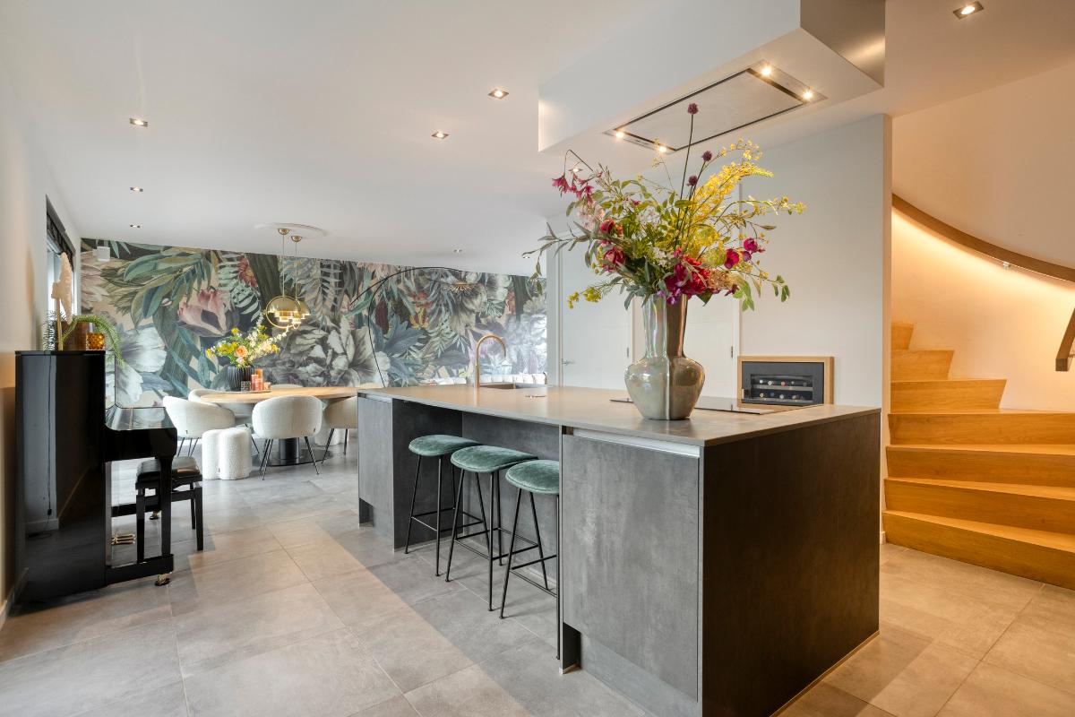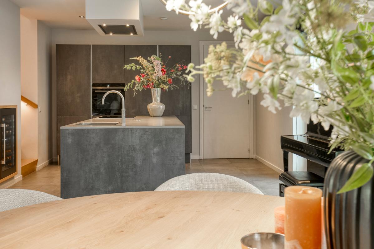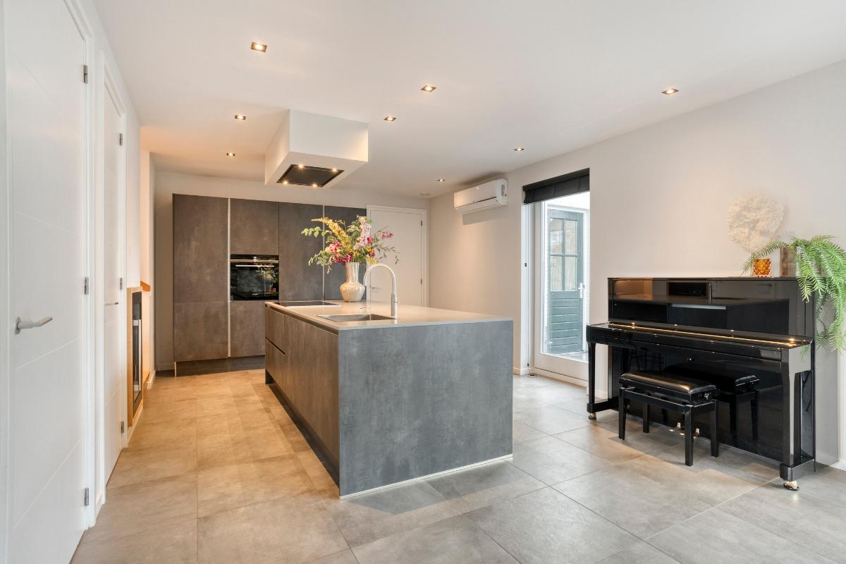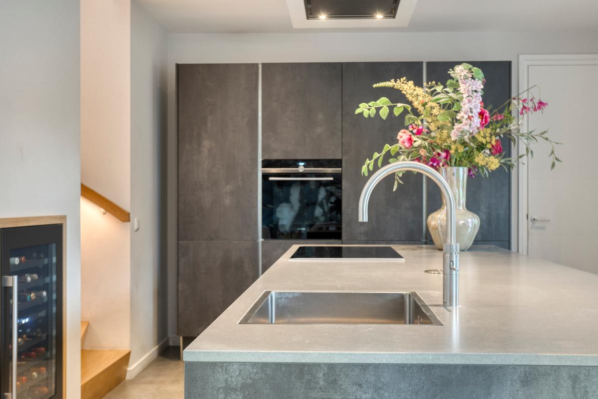 Aan de achterzijde bevindt zich de moderne en complete open woonkeuken met fraai uitzicht over de achtertuin. Het royale kookeiland vormt het hart van deze ruimte en is uitgerust met een 5-pits inductiekookplaat, RVS-afzuigkap, vaatwasser, inbouwkoelkast, wijnklimaatkast, oven en Quooker. Een praktisch en onderhoudsvriendelijk composieten aanrechtblad met geïntegreerde elektrapunten maken het comfort compleet. De vele kasten en lades bieden volop opbergruimte en maken dit een heerlijke plek voor kookliefhebbers.