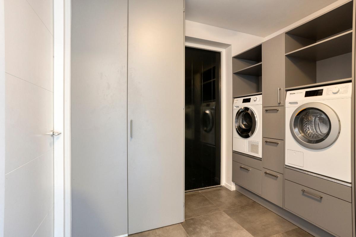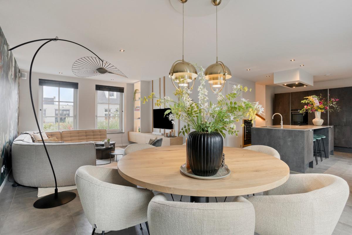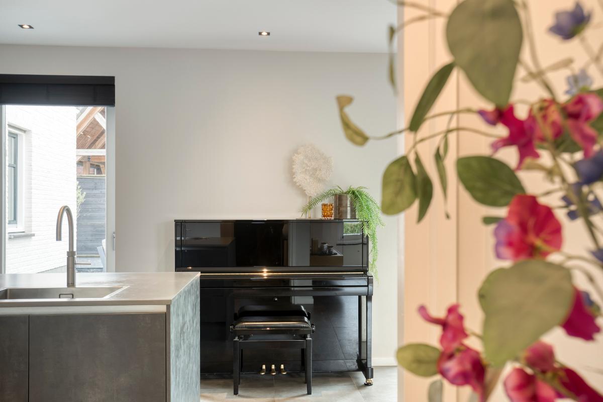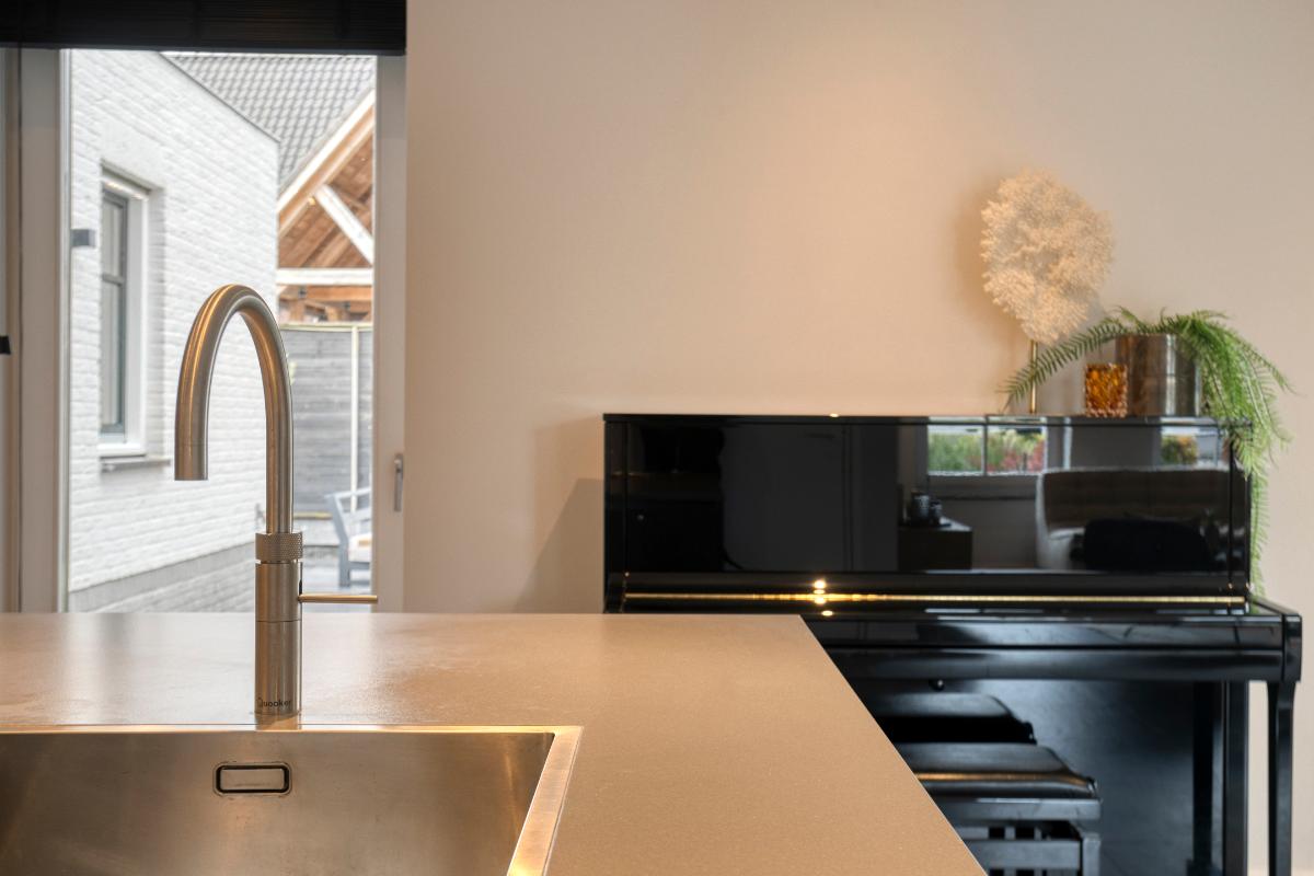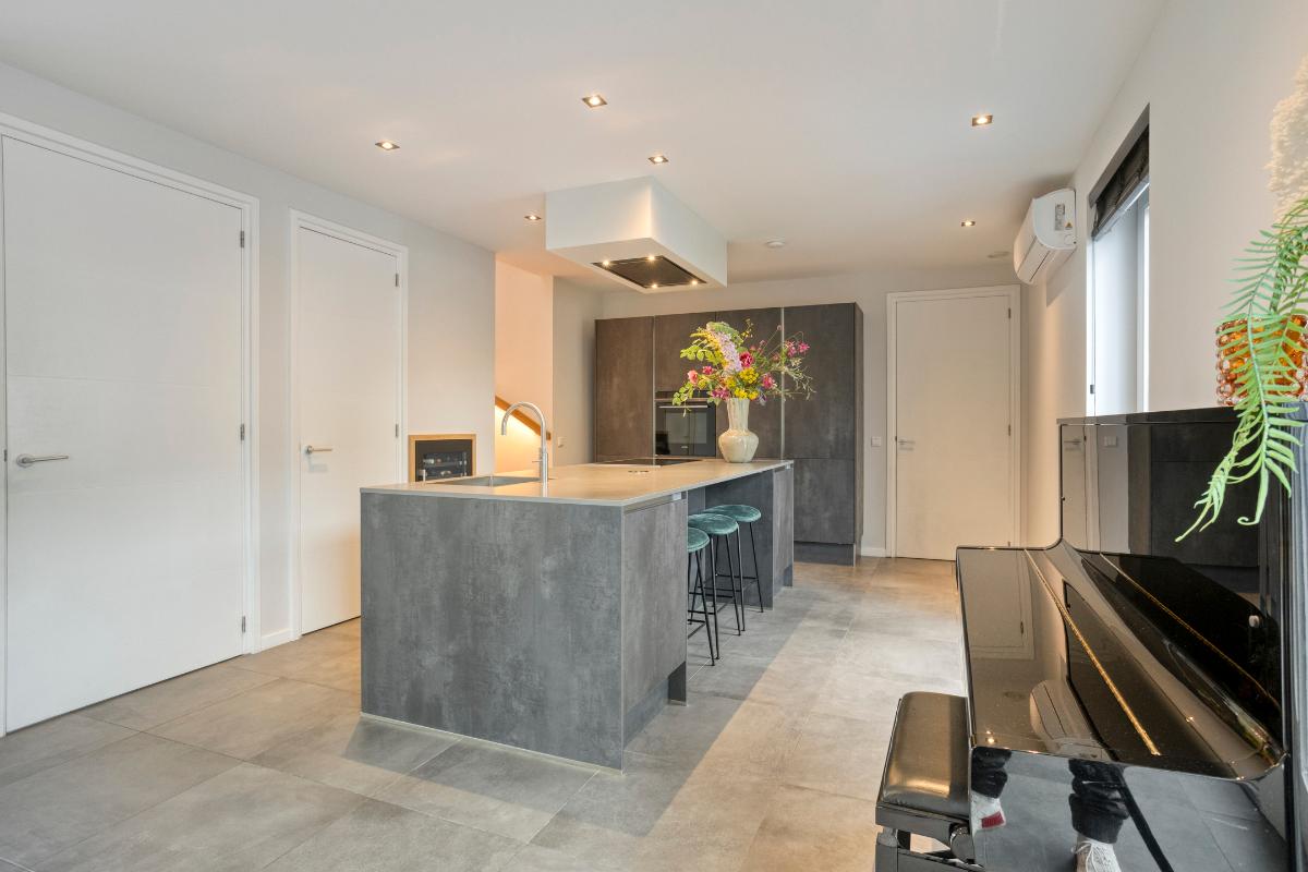Aan de achterzijde bevindt zich de moderne en complete open woonkeuken met fraai uitzicht over de achtertuin. Het royale kookeiland vormt het hart van deze ruimte en is uitgerust met een 5-pits inductiekookplaat, RVS-afzuigkap, vaatwasser, inbouwkoelkast, wijnklimaatkast, oven en Quooker. Een praktisch en onderhoudsvriendelijk composieten aanrechtblad met geïntegreerde elektrapunten maken het comfort compleet. De vele kasten en lades bieden volop opbergruimte en maken dit een heerlijke plek voor kookliefhebbers.