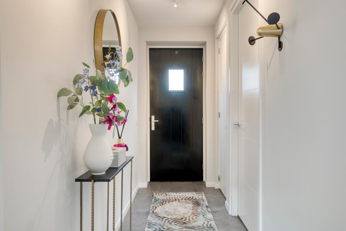 Via de entree bereikt u de lichte hal met tegelvloer, gestuukte wanden en plafond, meterkast en toegang tot het kantoor aan de voorzijde en de woonkamer/keuken.