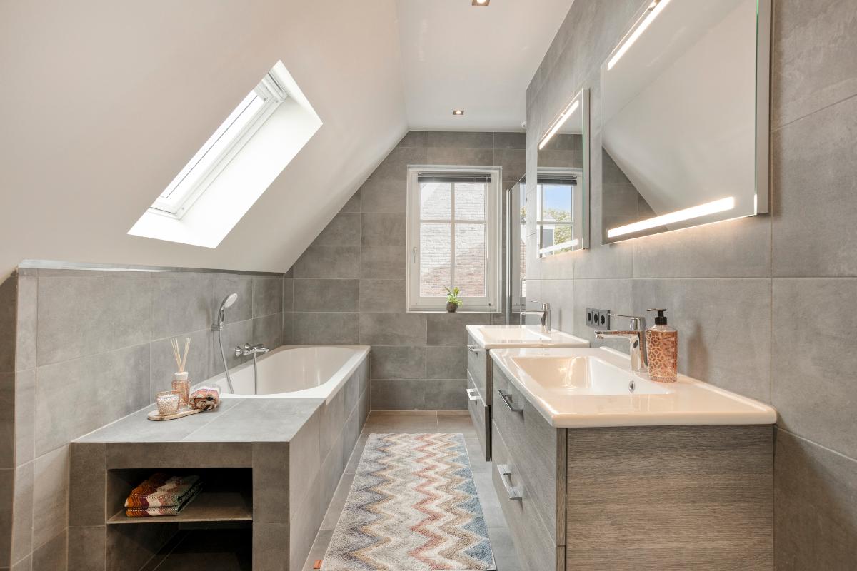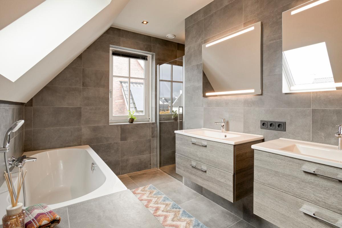 De moderne en royale badkamer is geheel betegeld en voorzien van een inloopdouche met glazen wand, ligbad, dubbele wastafel met meubel en spiegels, wandcloset en vloerverwarming. Ventilatie geschiedt via de mechanische ventilatie-unit maar door het dakraam kan deze ruimte ook natuurlijk worden geventileerd.
