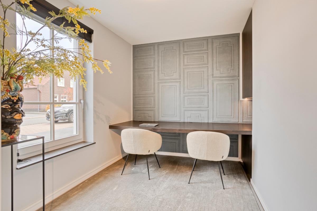 Aan de voorzijde van de woning bevindt zich een stijlvol thuiswerk-kantoor, direct bereikbaar vanuit de hal. Deze ruimte is voorzien van een maatwerk bureau en inbouwkasten, en biedt rust en privacy om comfortabel vanuit huis te werken. Daarnaast kan deze kamer ook heel goed als speelkamer of slaapkamer gebruikt worden.