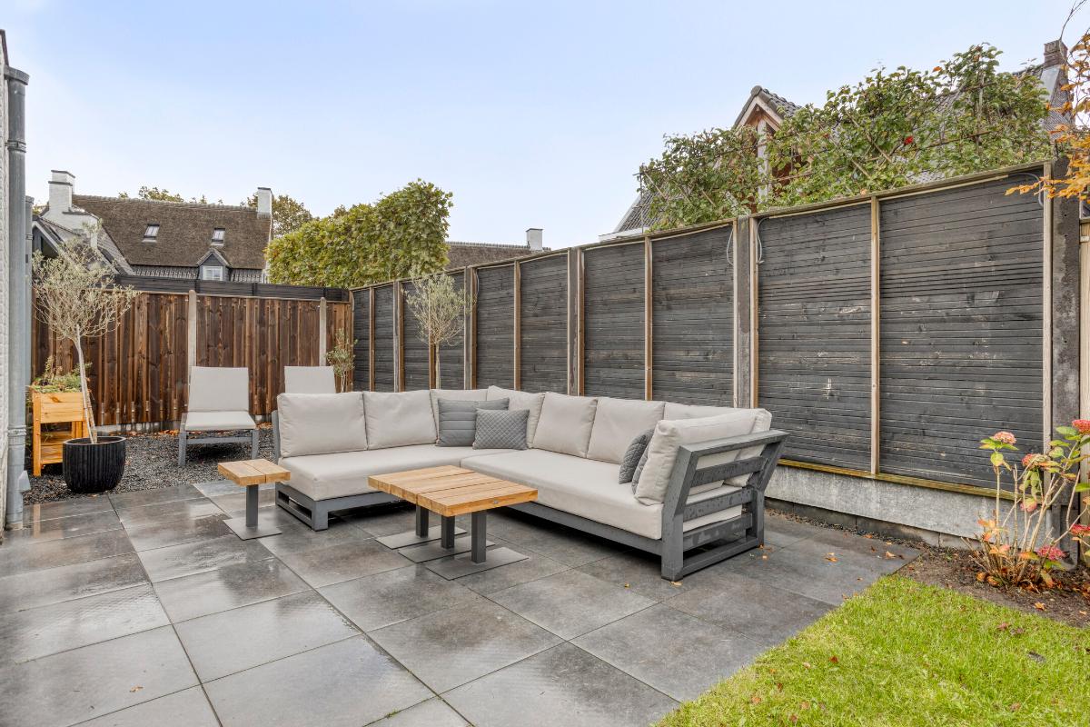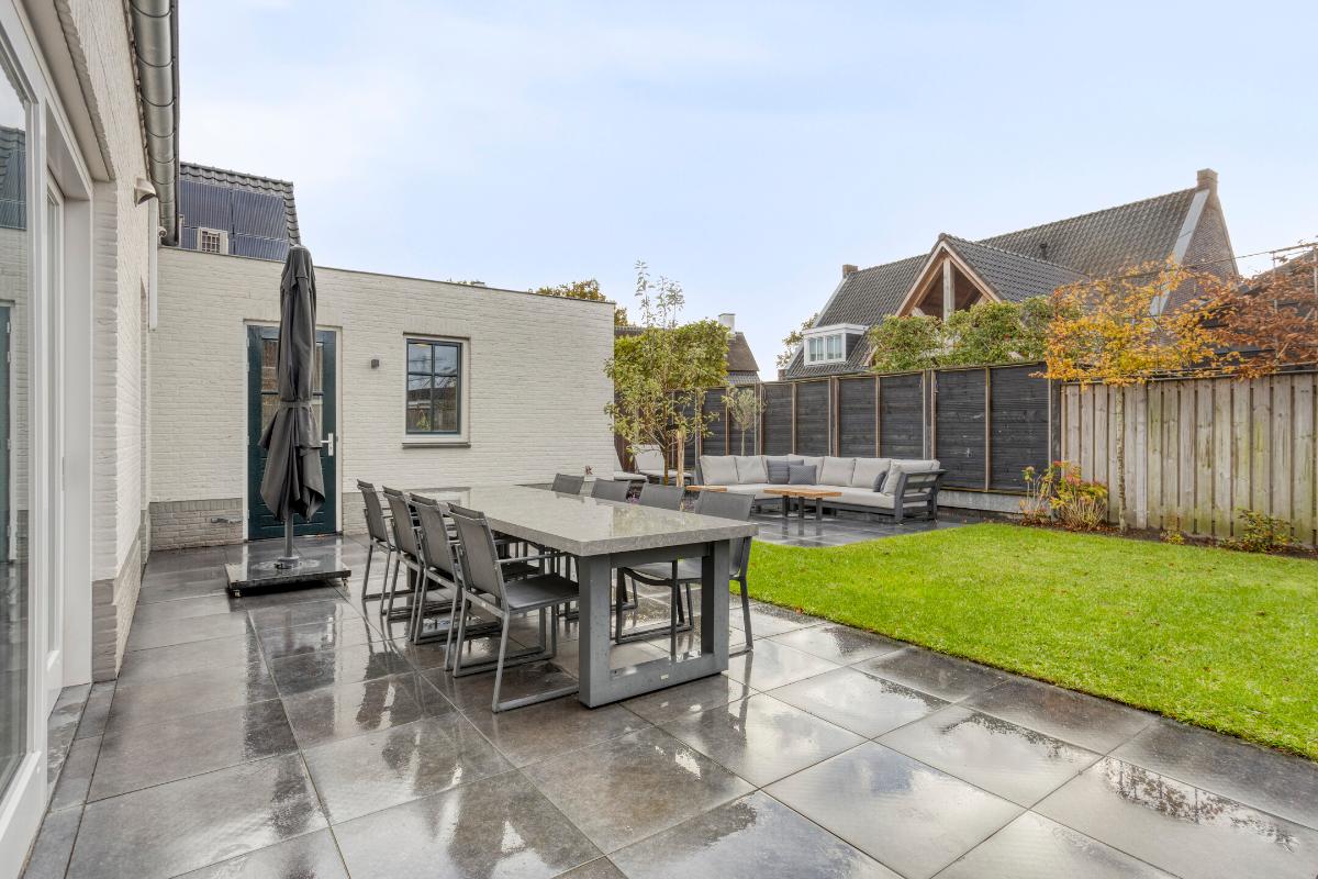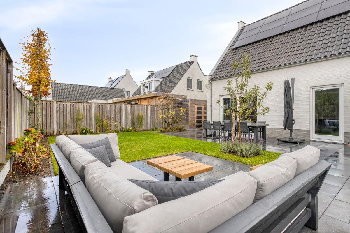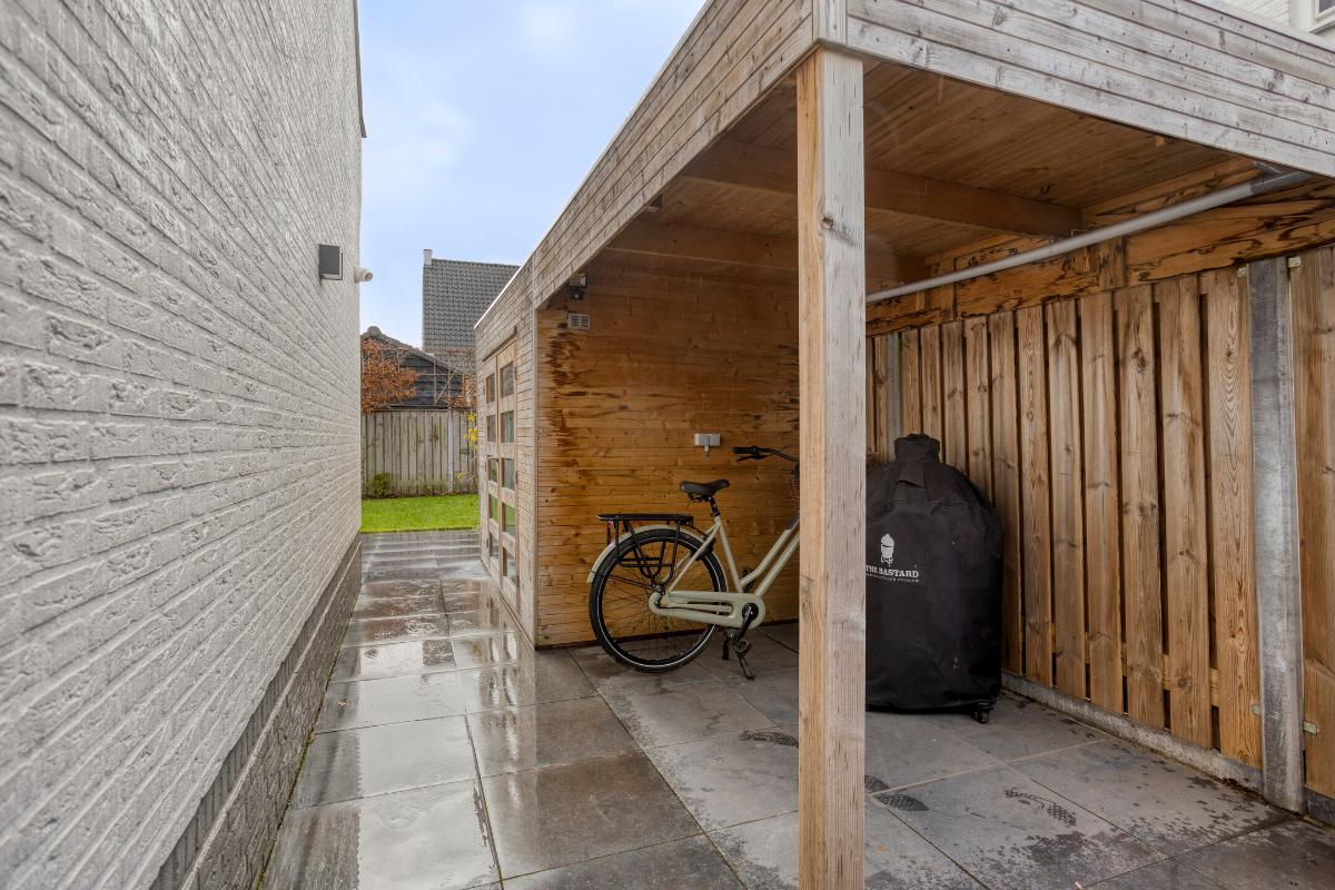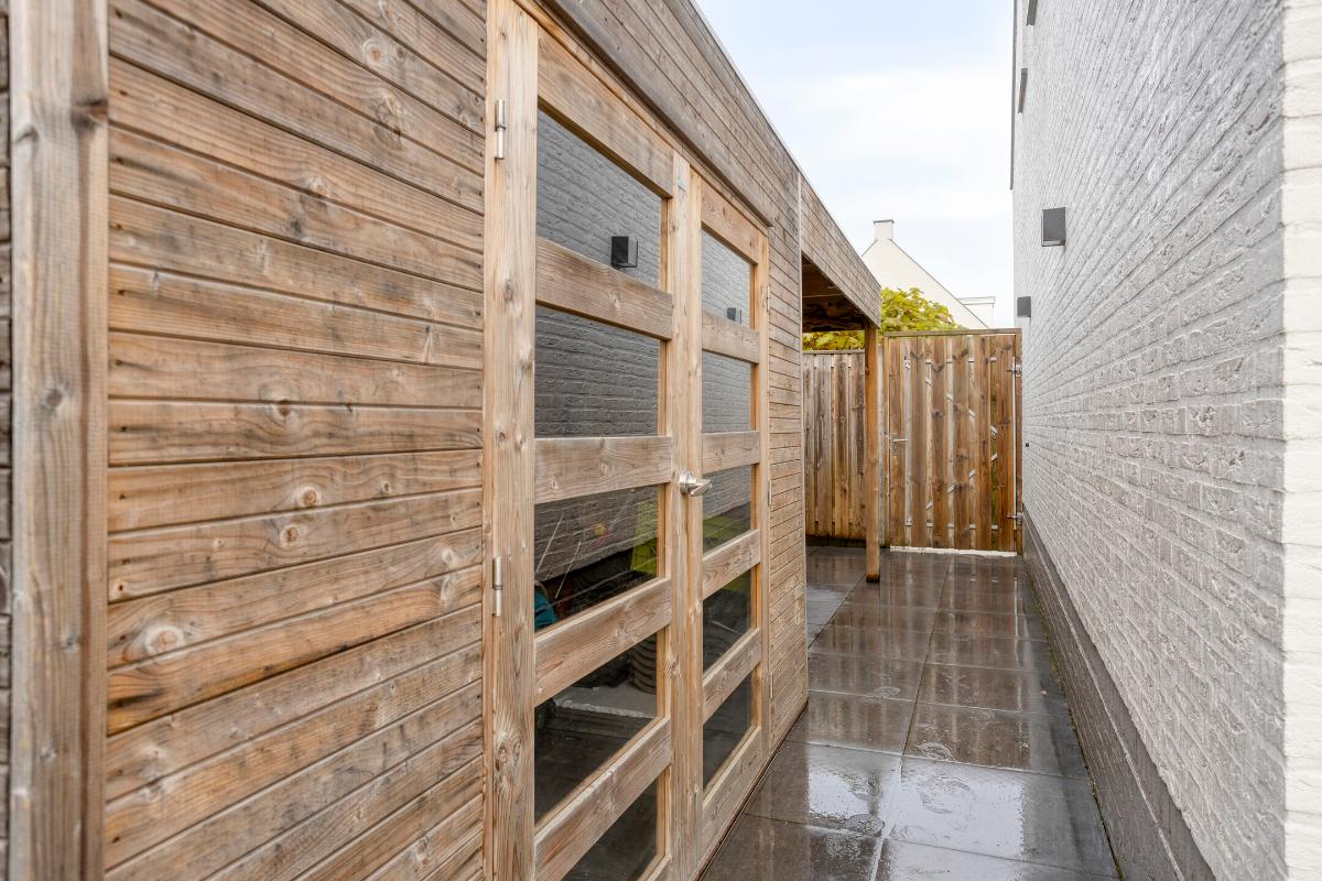 De zonnige achtertuin op het zuiden is verzorgd aangelegd met een gazon, borders met beplanting en meerdere terrassen waar u heerlijk kunt genieten van de zon. Verder beschikt de tuin over elektra, een achterom en een houten berging met overkapping — perfect voor fietsen, tuingereedschap of een gezellige loungehoek.