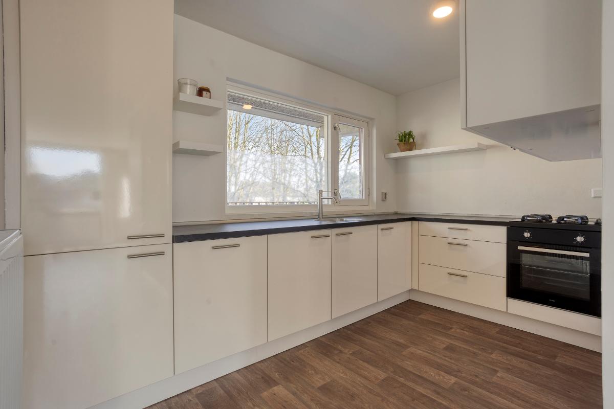 De keuken is gelegen aan de voorzijde in de half open keuken. De keuken is geplaatst in een L-opstelling en beschikt over een 4-pits gaskookplaat, koelkast, vrieskast, oven en een vaatwasser. De diverse kasten en lades zorgen voor extra bergruimte. Tevens is de praktische trapkast bereikbaar vanuit de keuken voor extra opslag.