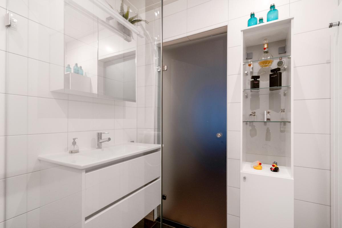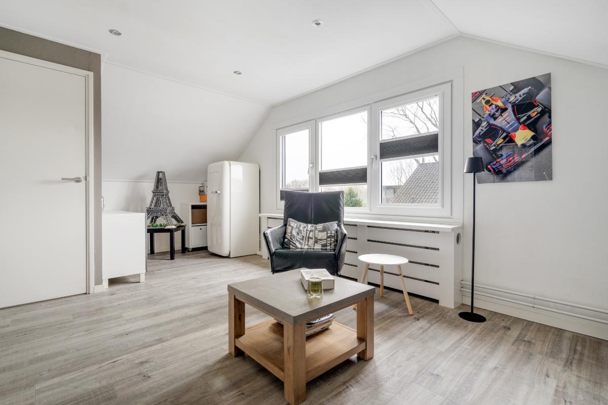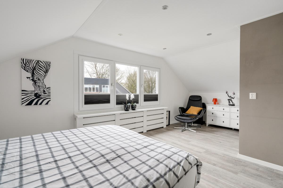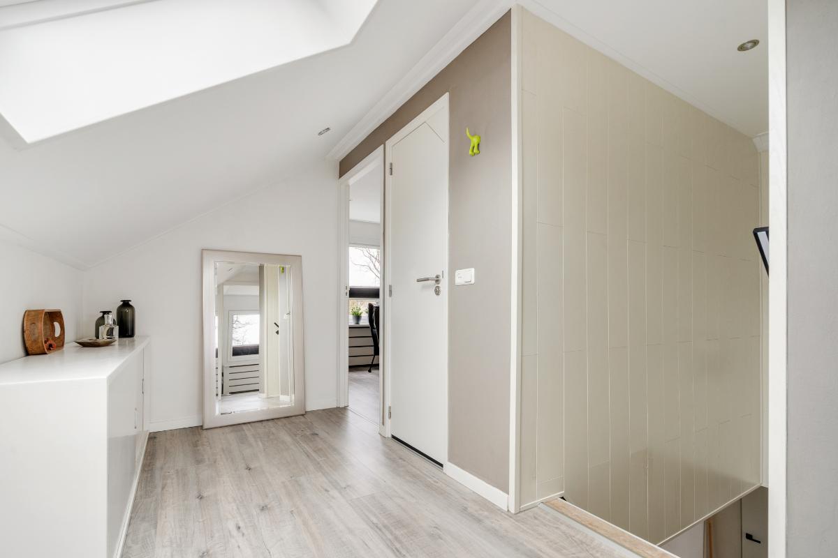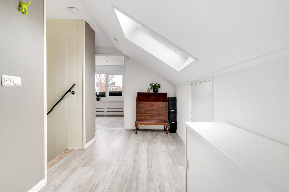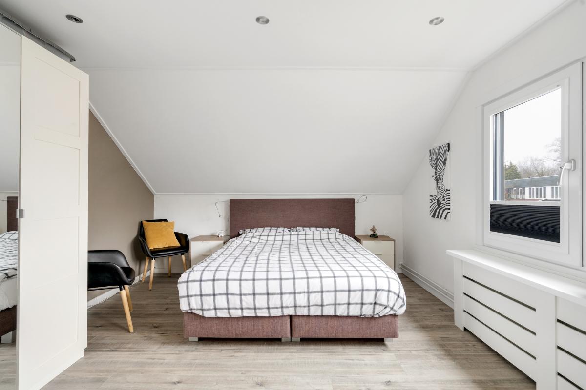 1e verdieping: Via de open trap in de hal kom je op de lichte overloop van de eerste verdieping. Het grote dakraam zorgt hier voor veel daglicht en ruimtelijk gevoel. Vanaf de overloop heb je toegang tot twee slaapkamers, de tweede badkamer en praktische bergruimte achter de knieschotten en in de separate berging. Aan de voorzijde ligt een royale slaapkamer met fijne ramen en een doorlopende vloerafwerking, waardoor de kamer ruim en rustig oogt. Er is volop plaats voor een groot bed, kasten en een bureau. Aan de achterzijde bevindt zich de tweede slaapkamer, eveneens van goed formaat en met een groot raam met uitzicht op de achterzijde. Deze kamer is bijvoorbeeld ideaal als logeerkamer, hobbyruimte of extra werkplek. Tussen de slaapkamers in ligt de tweede badkamer van de woning. Deze is volledig betegeld en ingericht met een inloopdouche met glazen wand, wastafelmeubel, spiegelkast, toilet en designradiator. Hiermee beschikt de verdieping over een volwaardige eigen sanitaire voorziening, wat het huis extra comfortabel maakt.