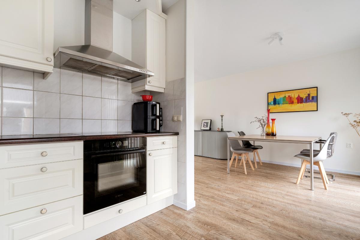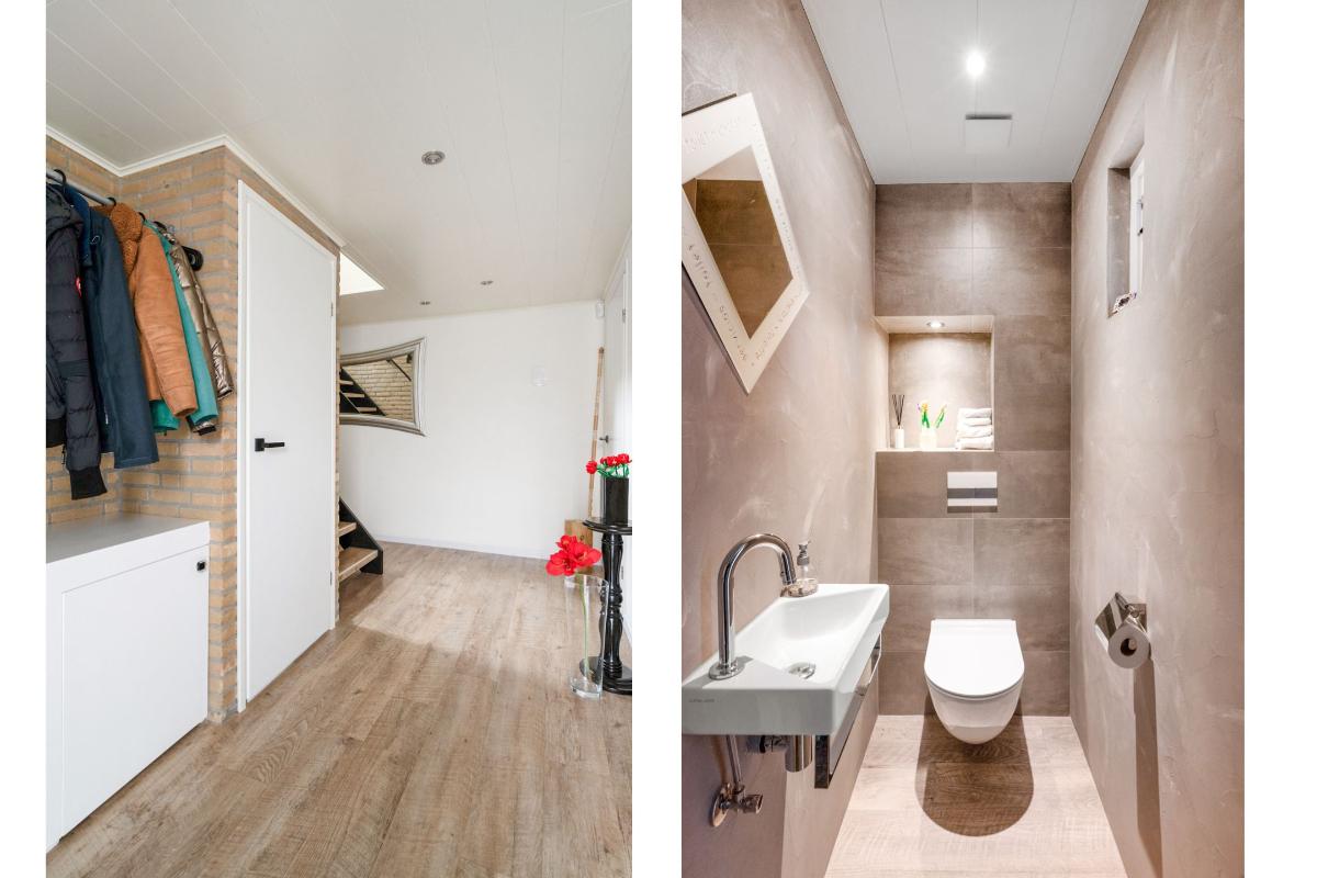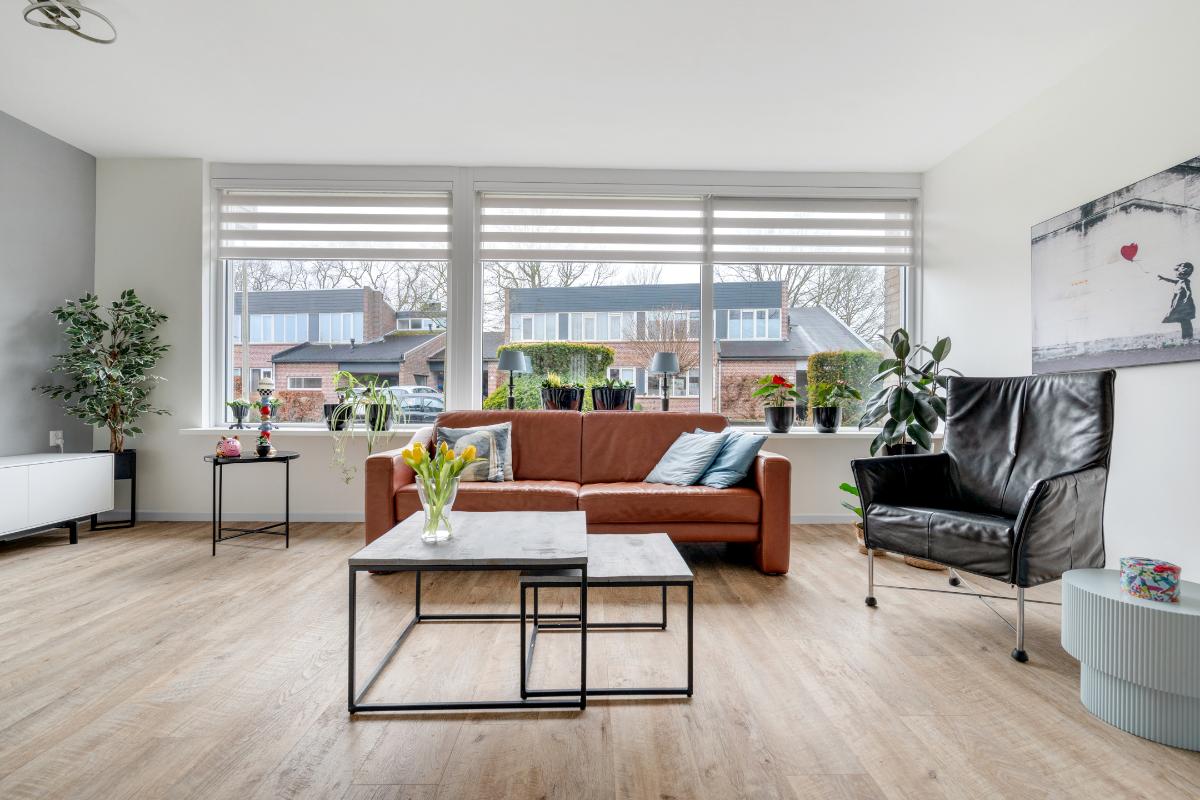 Begane grond: Aan de voorzijde word je ontvangen door een verzorgde voortuin met groen en een betegeld pad naar de voordeur. Daarnaast kun je de auto royaal kwijt op de oprit onder de carport, aan de zijkant van de woning. Via de entree kom je binnen in een ruime hal met plek voor jassen en schoenen. In de hal bevinden zich het toilet, een handige inbouwkast, de meterkast en de trap naar boven. Een glazen deur geeft toegang tot de woonkamer en zorgt meteen voor een lichte doorkijk naar de rest van het huis. De woonkamer heeft grote raampartijen, waardoor het hier de hele dag prettig licht is. De doorlopende vloer en de open verbinding met het eetgedeelte aan de achterzijde zorgen voor een ruimtelijk gevoel. Aan de tuinzijde geven schuifdeuren direct toegang tot het terras, waardoor je in de warme maanden zo van binnen naar buiten loopt. De open keuken in hoekopstelling heeft veel kastruimte en werkblad. De keuken is voorzien van diverse inbouwapparatuur, waaronder een koelkast met vrieslades, inductie kookplaat, afzuigschouw, vaatwasser en combi oven-magnetron. Ook is de begane grond voorzien van een slaapkamer en badkamer, wat helemaal past bij de semi-bungalow-indeling. De slaapkamer aan de tuinzijde is royaal van formaat en heeft een schuifpui naar het terras, zodat je direct zicht en toegang hebt tot de achtertuin. Langs één zijde is een brede vaste kastenwand geplaatst, wat veel bergruimte geeft. Direct naast de slaapkamer ligt de volledig betegelde badkamer met een ruime inloopdouche, design radiator en wastafelmeubel. Dankzij deze indeling kun je in deze woning comfortabel en volledig gelijkvloers wonen.