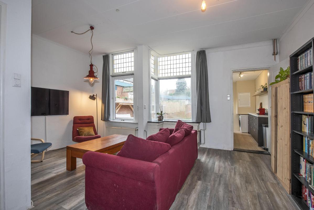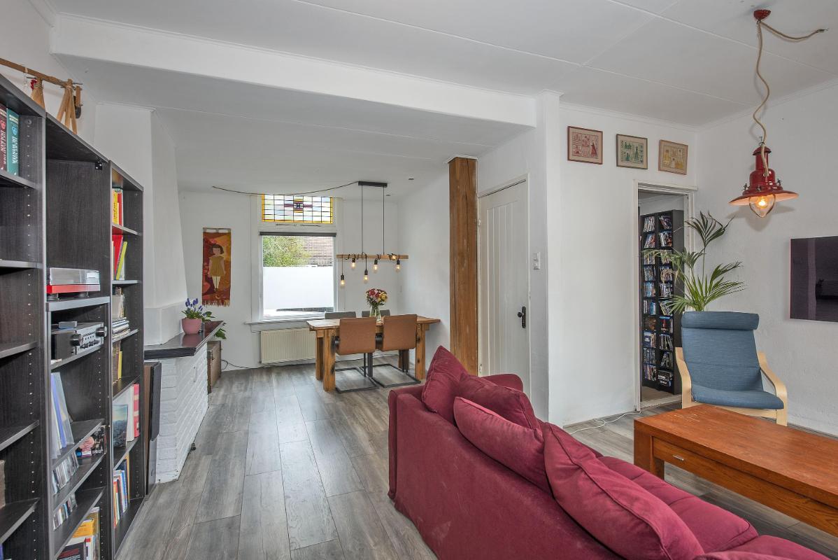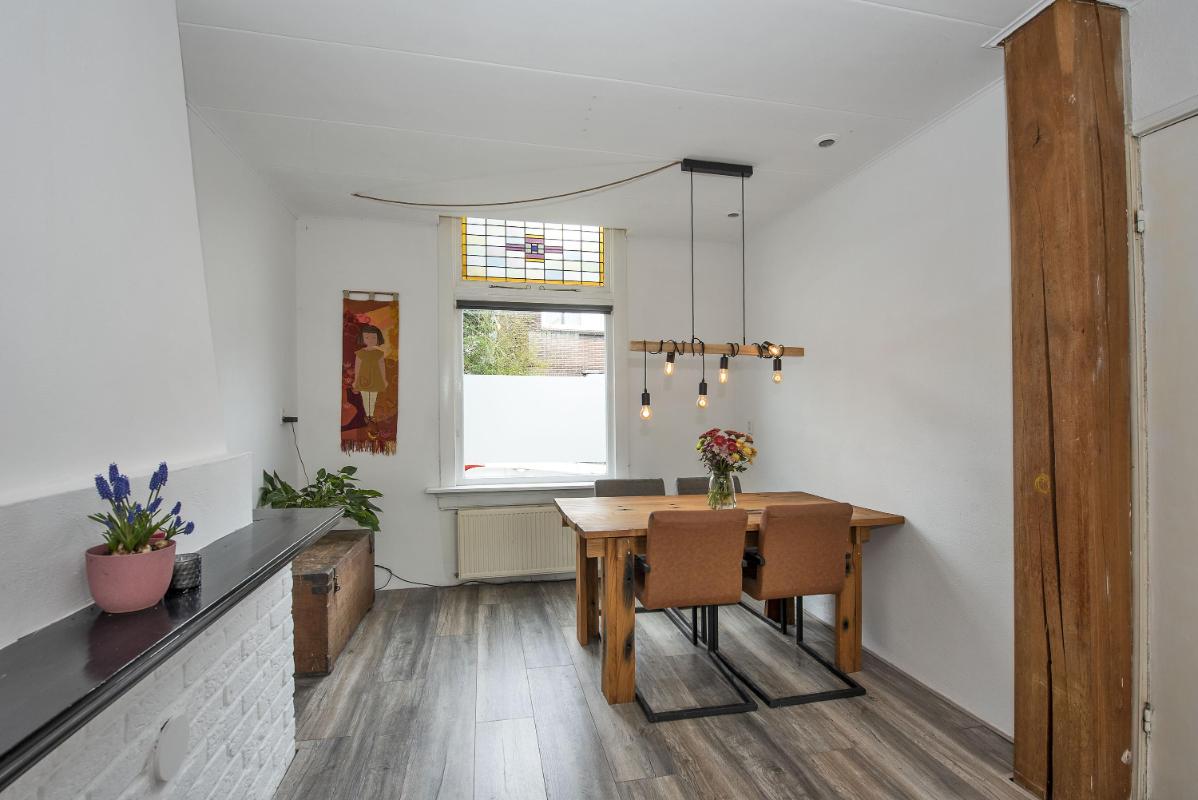 Een woning met potentie De woonkamer vormt het centrale gedeelte van de woning en biedt voldoende ruimte voor zowel een zit- als eethoek. Dankzij de hoge glas-in-lood ramen komt er veel daglicht binnen, waardoor de ruimte licht en aangenaam aanvoelt.