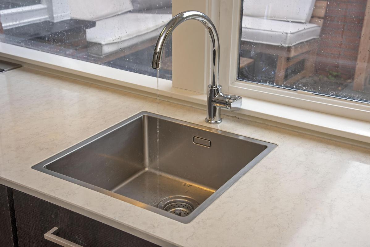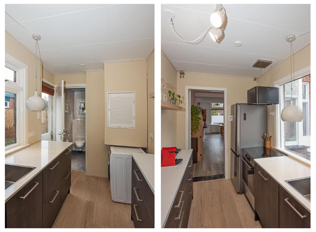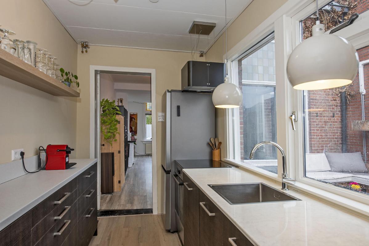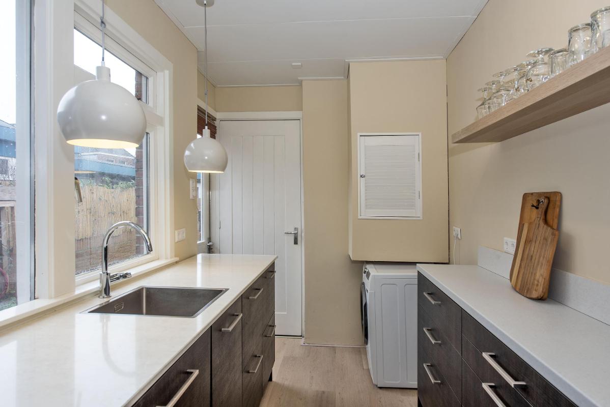 Aan de achterzijde van de woning bevindt zich de keuken. Deze is voorzien van diverse inbouwapparatuur en beschikt daarnaast over de wasmachineaansluiting en de cv-installatie. Vanuit de keuken is er directe toegang tot de achtertuin.
