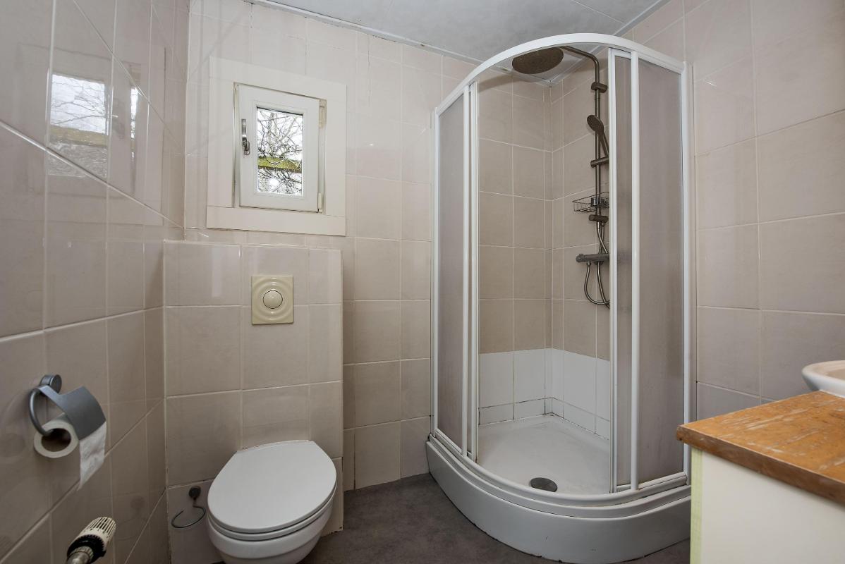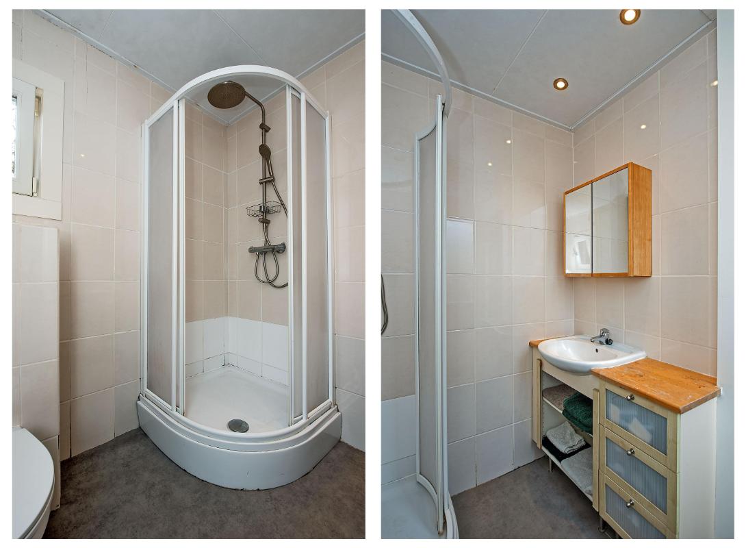 De badkamer bevindt zich eveneens op de begane grond en is voorzien van een toilet, douche en wastafel.