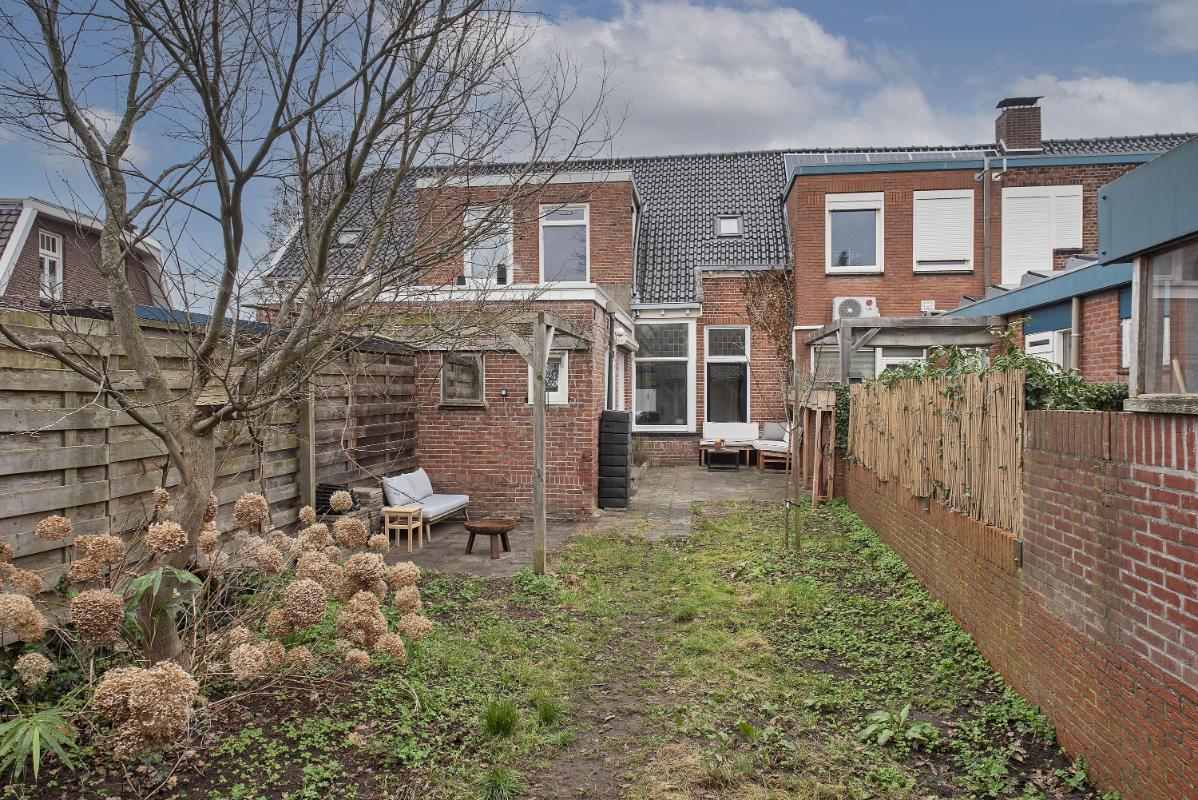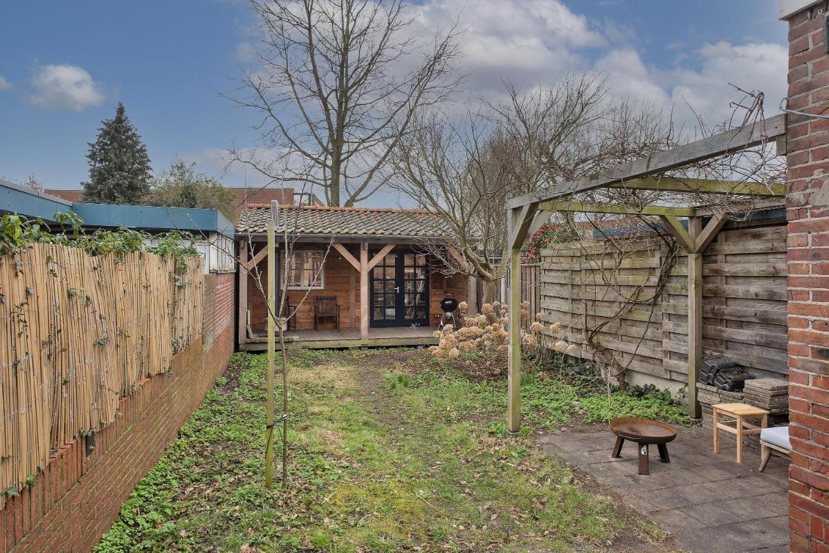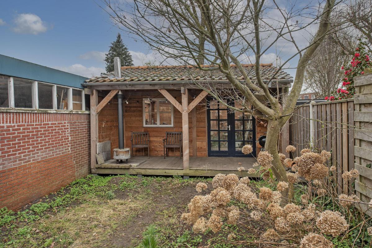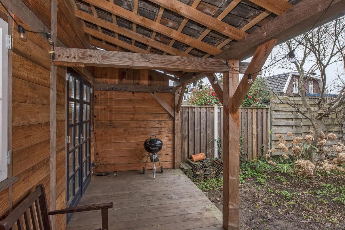 Tuin met overkapping en berging De diepe en zonnige achtertuin biedt een fijne plek hebt om te ontspannen. Recent is er een royale schuur met overkapping en veranda geplaatst, waardoor je hier een comfortabele plek hebt om beschut buiten te zitten. De schuur biedt ruimte voor een fijne werkplaats of kan gebruikt worden als opslag voor (tuin)gereedschap. Vanuit de schuur kom je uit op het achterpad, waardoor je de tuin ook achterom kunt bereiken met de fiets.
