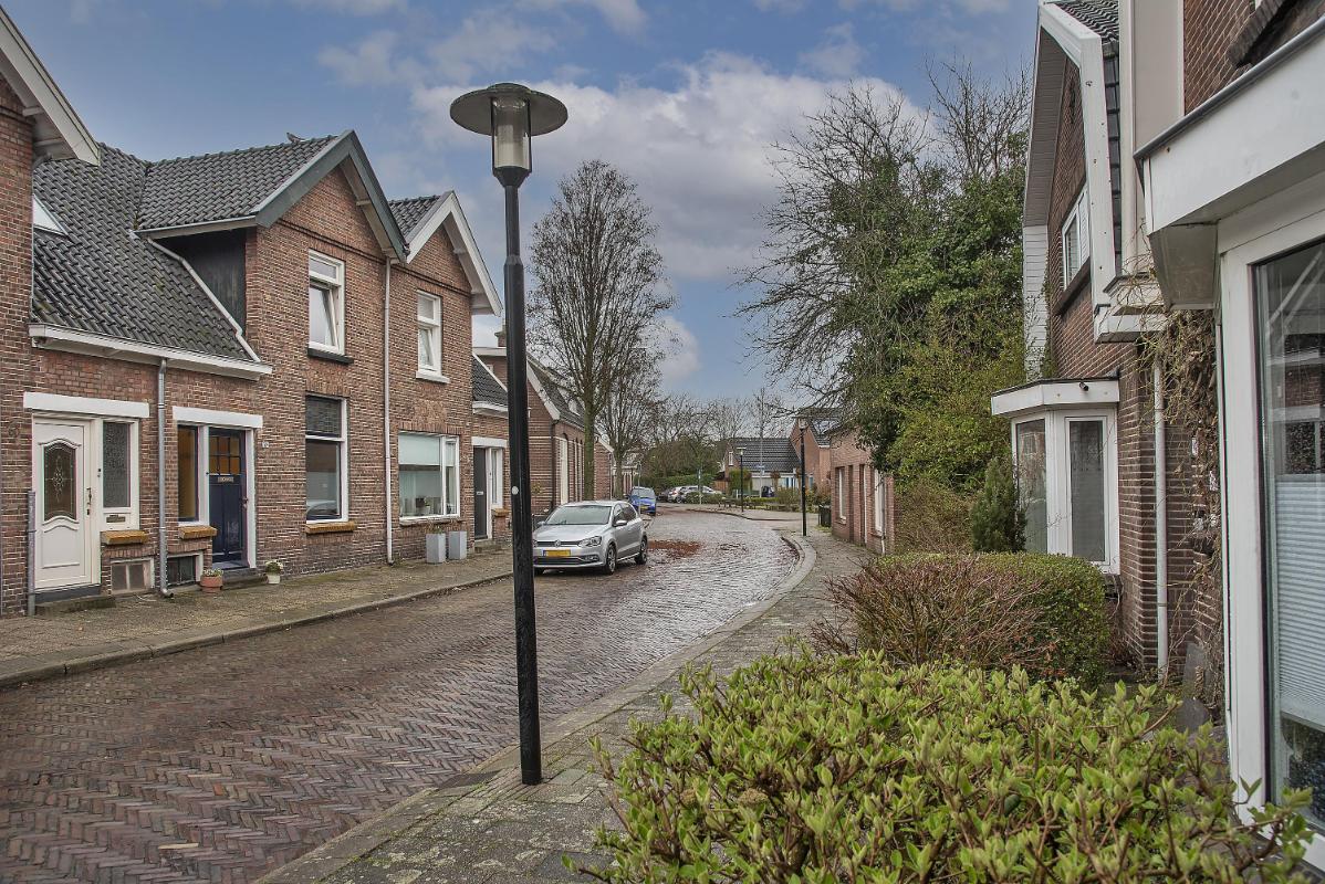 Indeling Begane grond: entree/hal, trapopgang, kelder- en meterkast, en toegang tot de woonkamer. De woonkamer biedt ruimte voor de zit- en eethoek. De keuken is gelegen in de uitbouw aan de achterzijde en voorzien van inductiekookplaat, afzuigkap, oven, vaatwasser en wasmachineaansluiting. Ook is hier de cv-ketelopstelling. Vanuit de keuken toegang tot de tuin en badkamer. Badkamer voorzien van toilet, douche en wastafel. Eerste verdieping: overloop voorzien van afgetimmerde bergingen, twee slaapkamers en vliering-vide. Tuin: achtertuin gelegen op het zuiden, voorzien van veranda en vrijstaande houten berging.