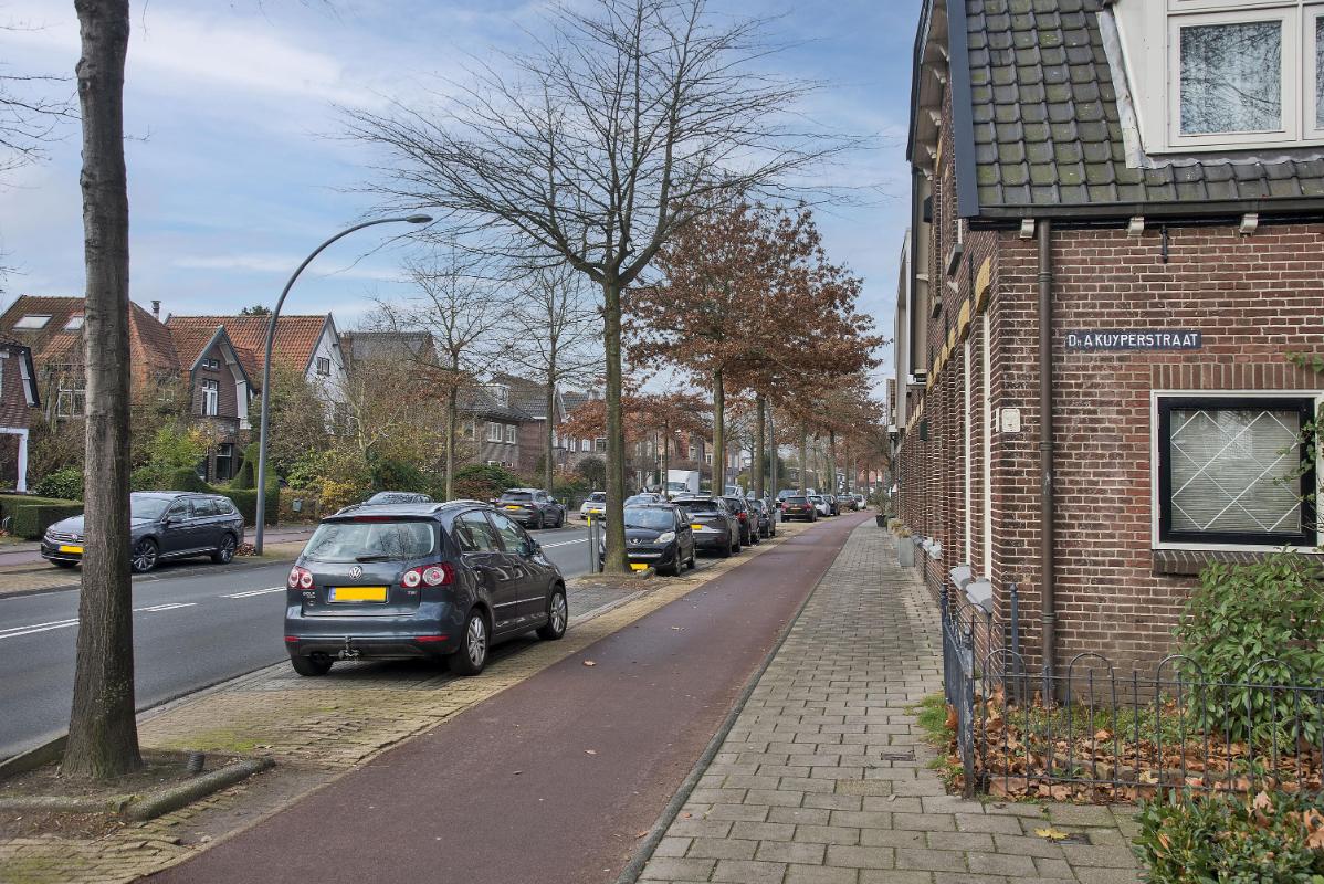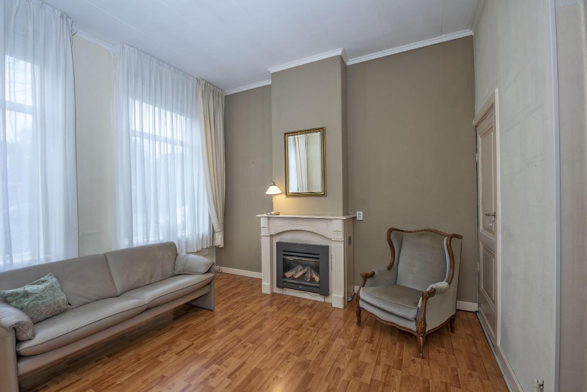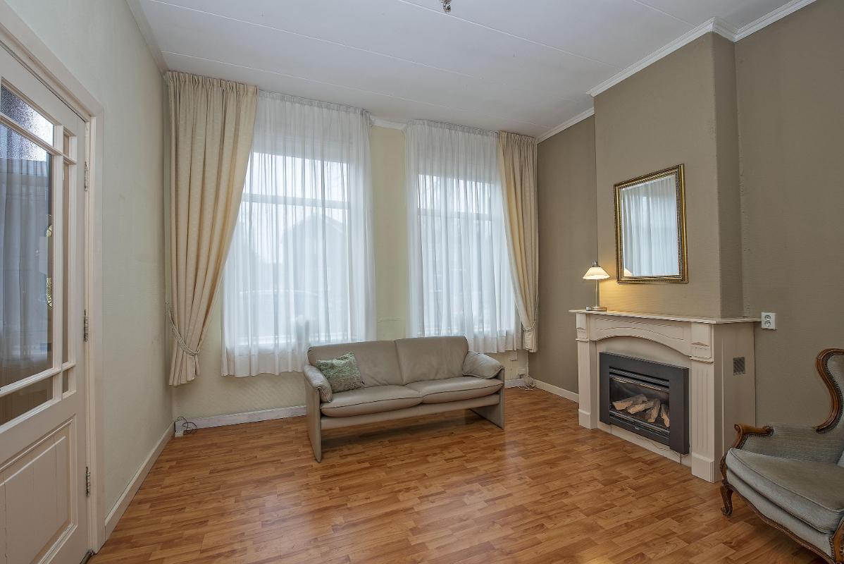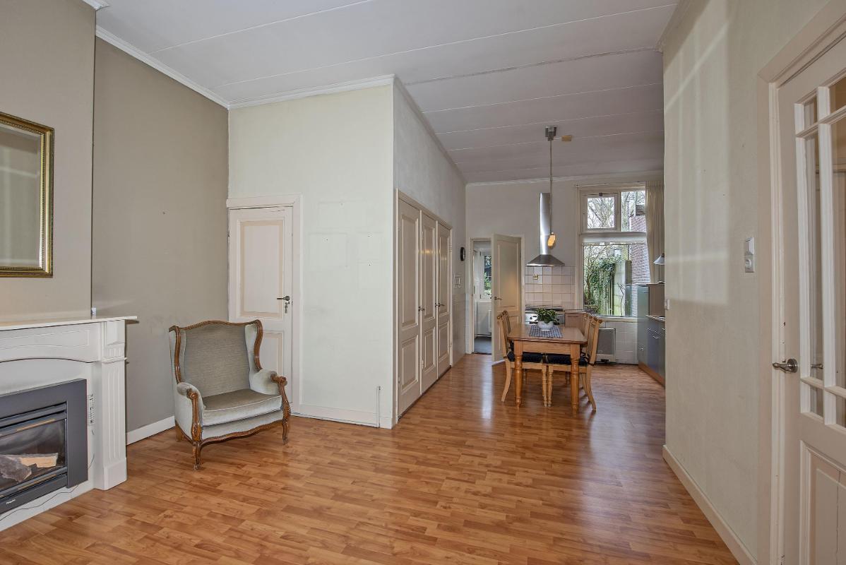 Lichte en fijne woonkamer De woonkamer heeft twee grote ramen waardoor het licht volop binnenvalt. De hoge plafonds versterken het gevoel van ruimte en licht, terwijl de haard de kamer een warme en sfeervolle uitstraling geeft. In de hoek van de woonkamer bevindt zich een deur naar een handige voorraadkast onder de trap, ideaal voor extra opbergruimte. De open verbinding richting de keuken zorgt voor een natuurlijke overgang tussen de leefruimtes.