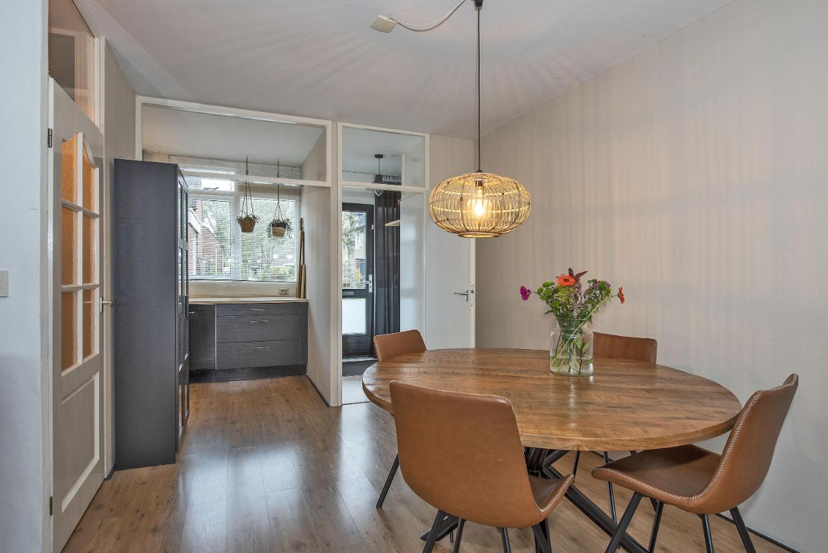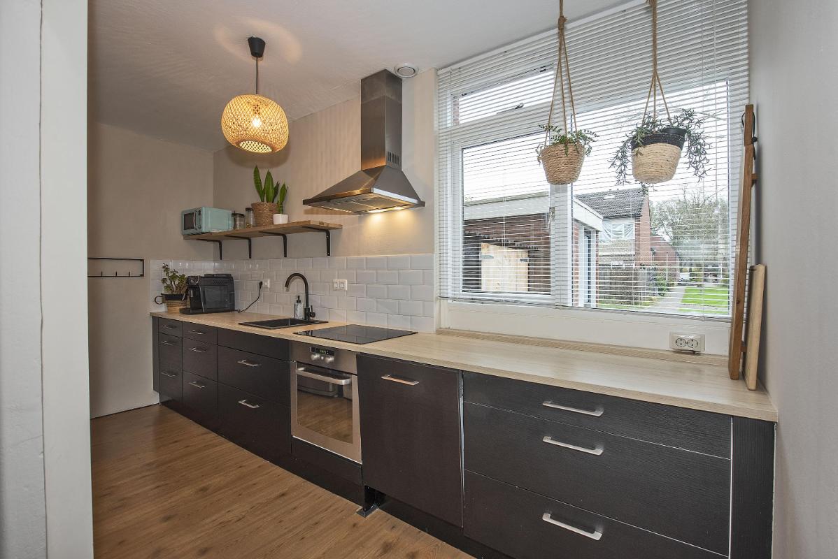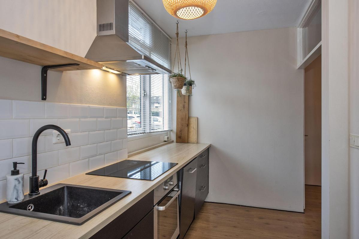 Indeling van de woning: Begane grond: hal/entree, meterkast, keuken aan voorzijde voorzien van vaatwasser, inductiekookplaat, oven, koel/vriescombinatie en provisiekast, tussenhal met toilet en trapopgang, ruime woonkamer aan de achterzijde met grote raampartijen en een achter-entree. Eerste verdieping: overloop, 3 slaapkamers waarvan 1 met dubbele vaste kast, nette badkamer voorzien van wandcloset, douche, wastafel en radiator. Tweede verdieping: via vaste trap bereikbare voorzolder met cv-opstelling en wasmachineaansluiting, vierde slaapkamer met riante dakkapel. Tuin: zonnige achtertuin met groen uitzicht, privacy, houten overkapping met poort. Aan de voorzijde een overkapping voor het stallen van de fiets of scooter en een stenen berging.