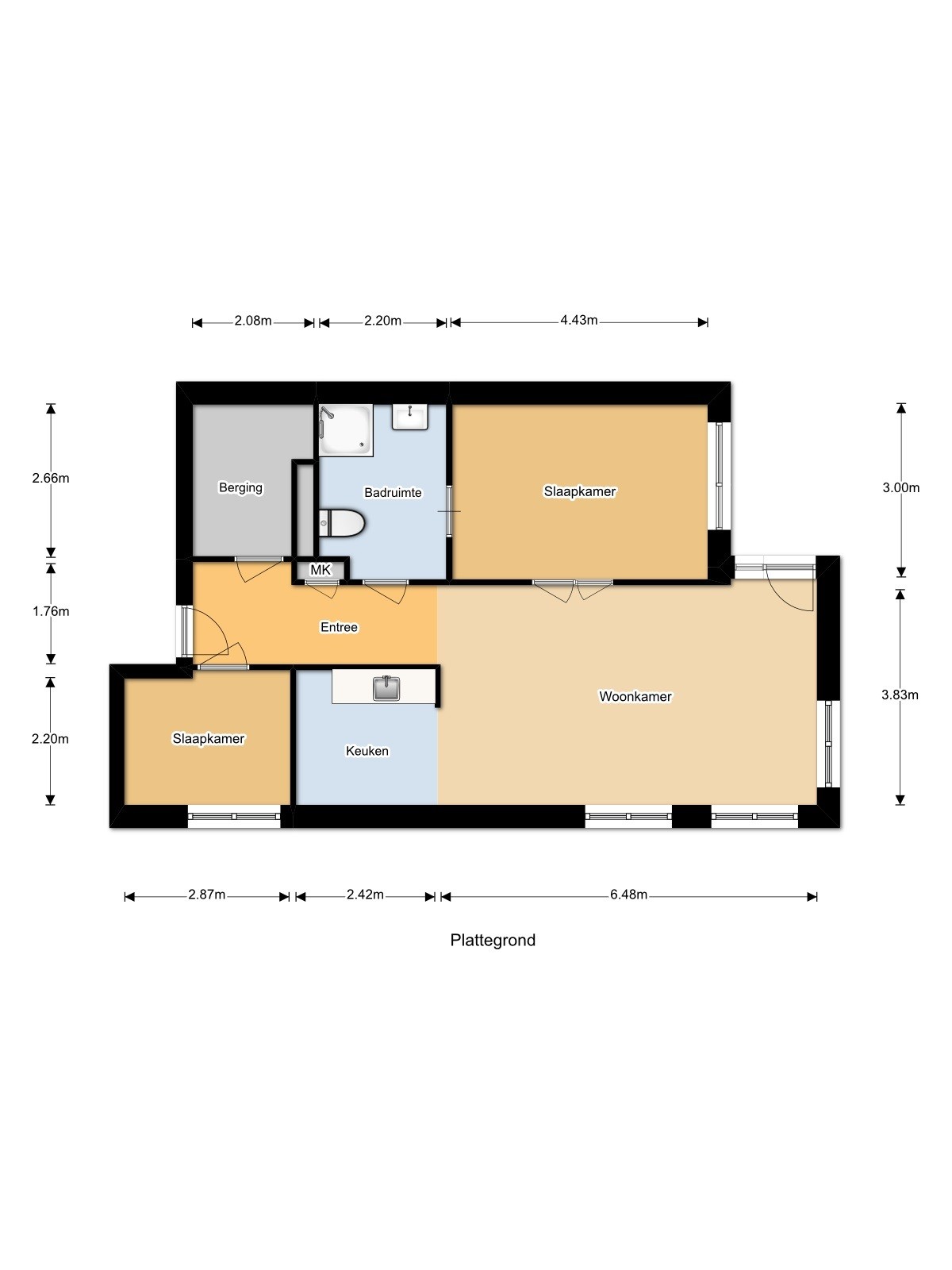 Indeling: Appartement: entree met hal en meterkast. Vanuit de hal toegang tot de berging, badkamer, slaapkamer en woonkamer. Woonkamer met open keuken, voorzien van kookplaat, afzuigkap, combi oven, koelkast en vaatwasser. Vanuit de woonkamer toegang tot de tweede slaapkamer en de loggia.