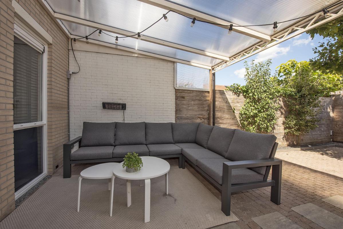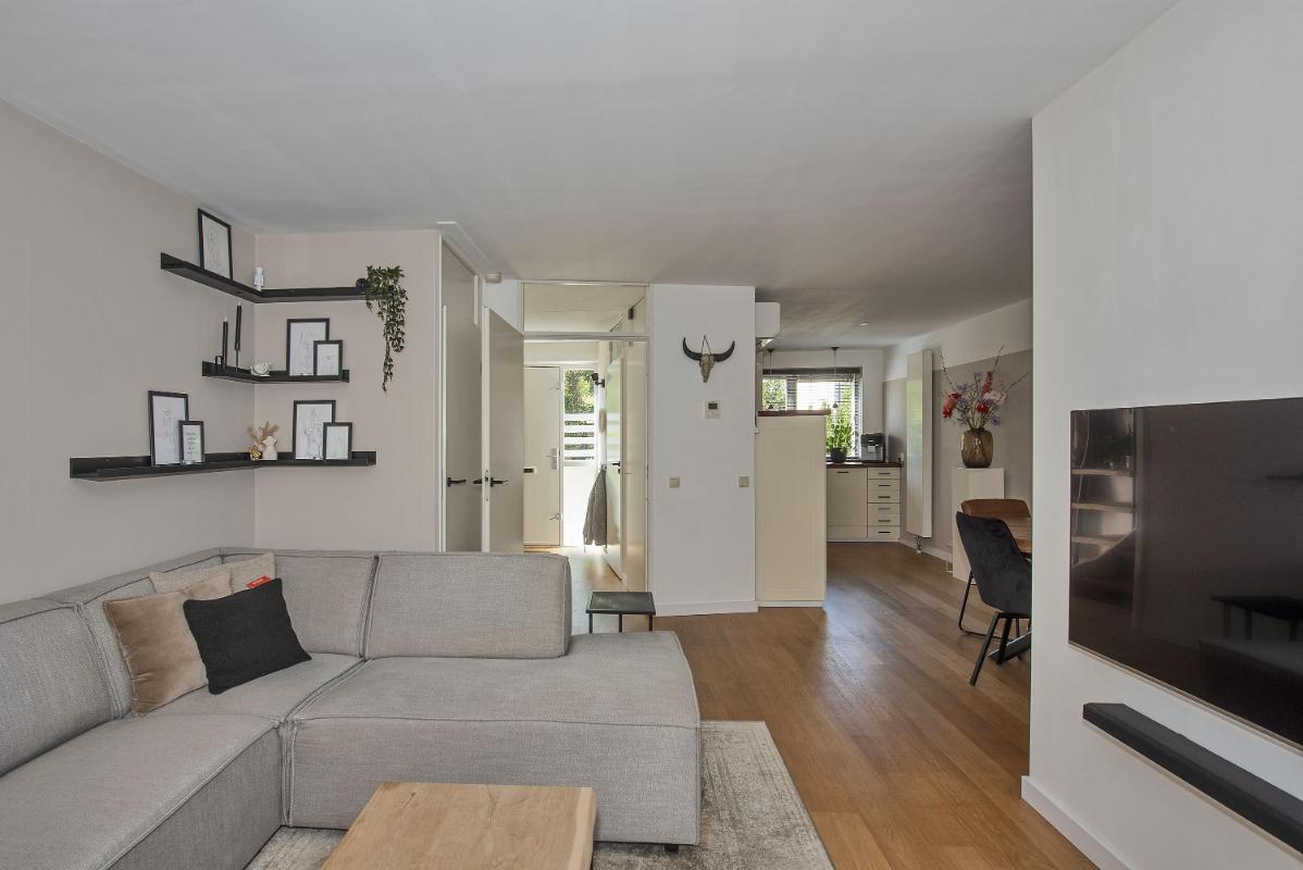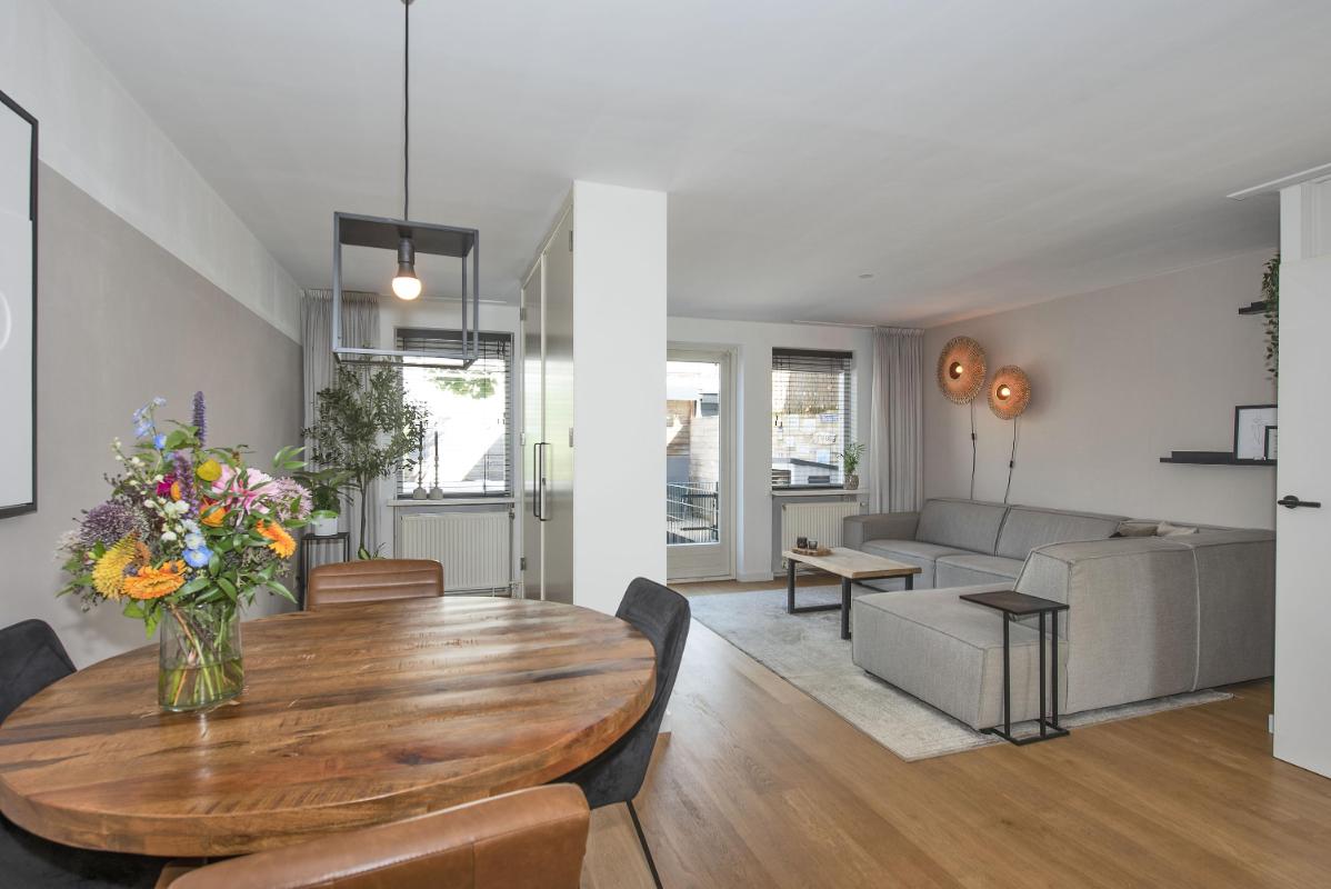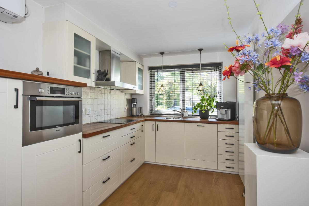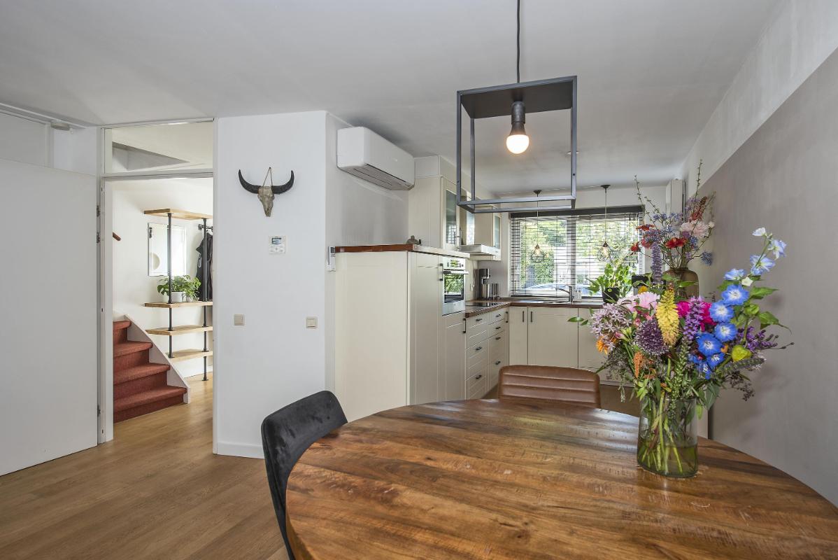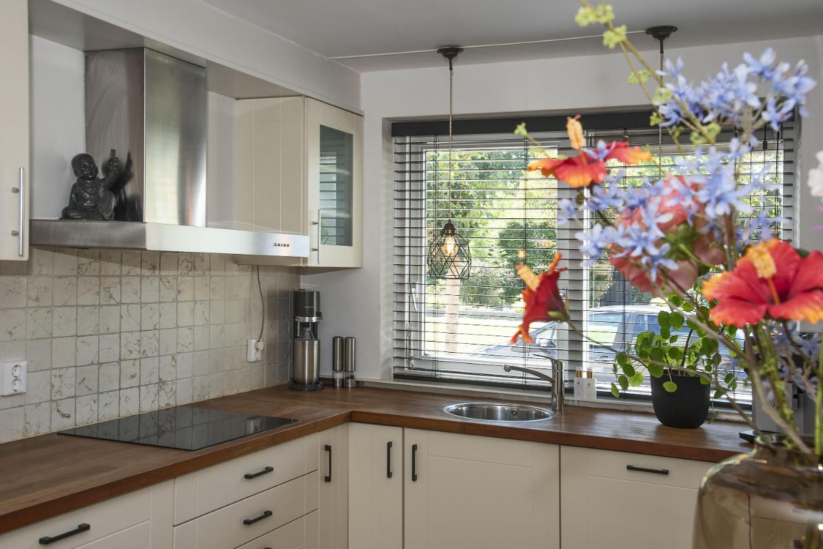 De woonkamer is tuingericht en licht, met openslaande deuren naar een diepe tuin mèt overdekte veranda. Hier geniet je elk seizoen van het buitenleven, of het nu gaat om een zomerse barbecue of een knusse avond in het najaar. De keuken ligt aan de straatzijde en vormt samen met de woonkamer een fijne balans tussen gezelligheid en praktisch gemak.