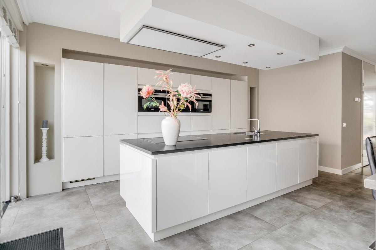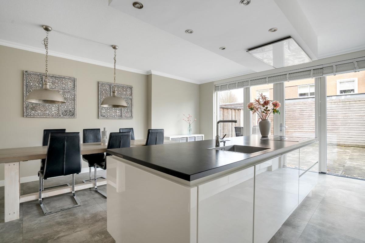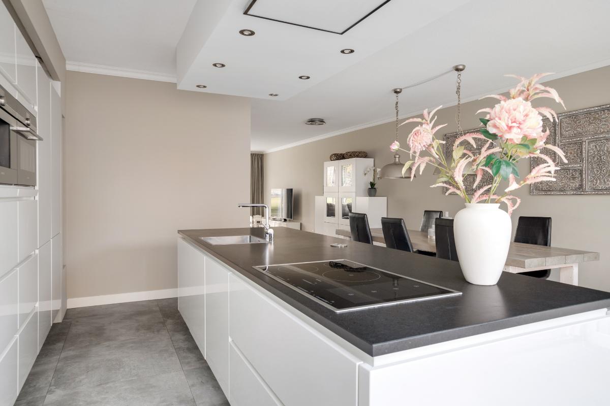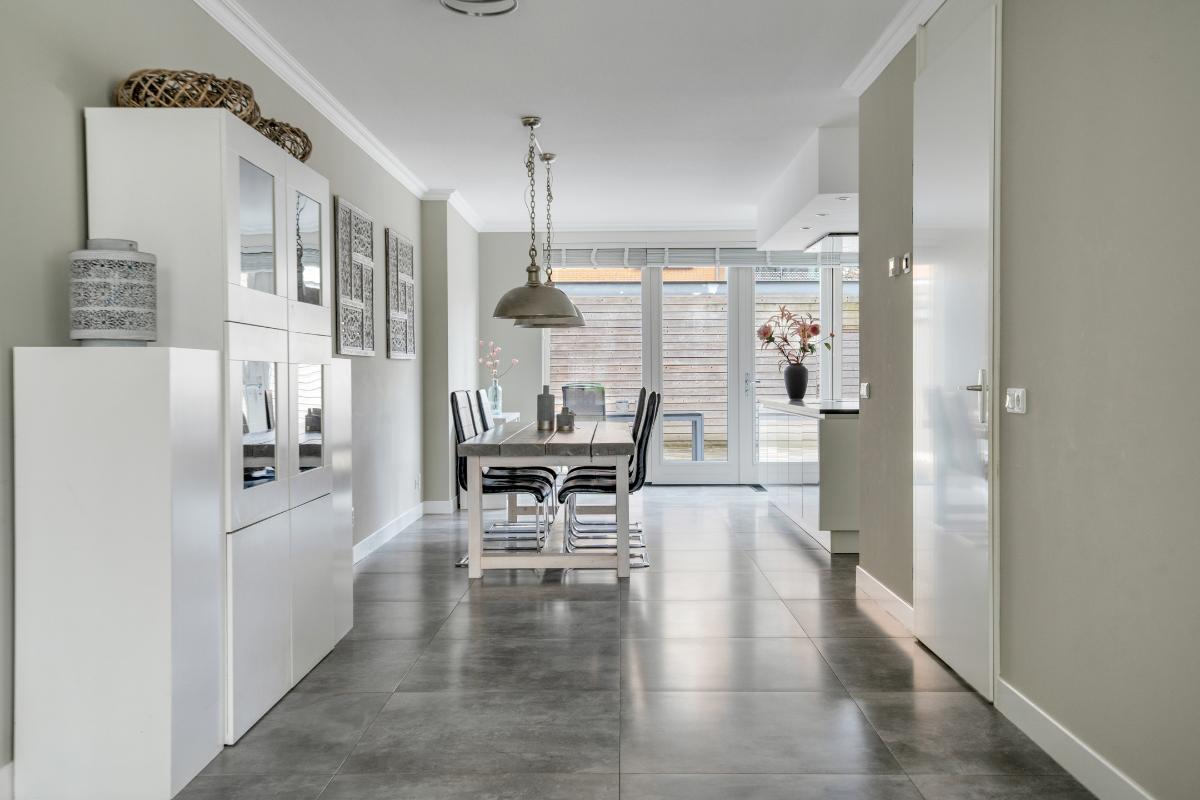 Ruimte, licht en leefgemak Je komt binnen in de hal, vanuit hier stap je de woonkamer in, die zich door de breedte van het huis uitstrekt en een heerlijk open sfeer heeft. Grote ramen zorgen voor veel licht en dankzij de open verbinding met de keuken voelt alles als één geheel. Aan de achterzijde ligt de moderne keuken met een royaal kookeiland met kookplaat en spoelbak. Dit is zo’n plek waar je samen kookt, kletst, lacht en leeft. De openslaande deuren naar de tuin maken het helemaal af: op mooie dagen stap je zo het terras op voor een ontbijtje in de zon.