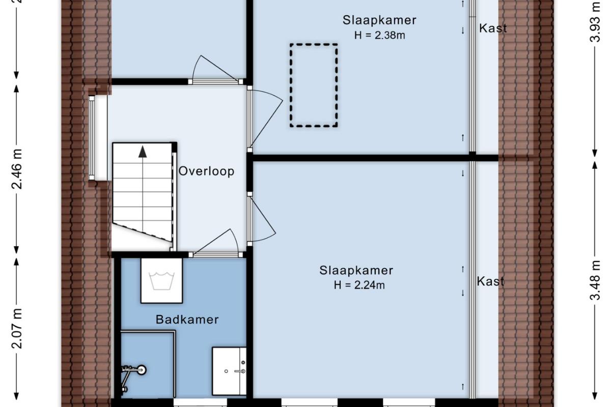 1e etage Vanaf de overloop, voorzien van een dakvenster, zijn de drie slaapkamers op deze verdieping bereikbaar. Aan de voorzijde bevindt zich een ruime slaapkamer met vaste schuifdeurkast. Aan de achterzijde liggen twee slaapkamers, waaronder een ruime kamer met eveneens een vaste schuifdeurkast. Op de vloer van deze etage ligt een fraaie laminaatvloer en de kamers zijn verder voorzien van sfeervolle paneeldeuren, wat bijdraagt aan de karakteristieke uitstraling van de woning. De badkamer bevindt zich aan de voorzijde en is uitgevoerd in een lichte kleurstelling met grijstinten, voorzien van een originele granitovloer, douchecabine, wastafelmeubel en aansluiting voor de wasmachine.