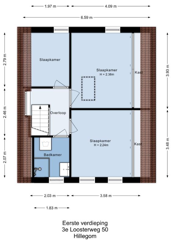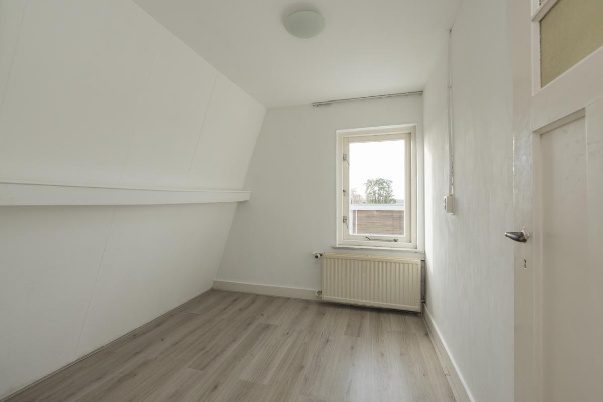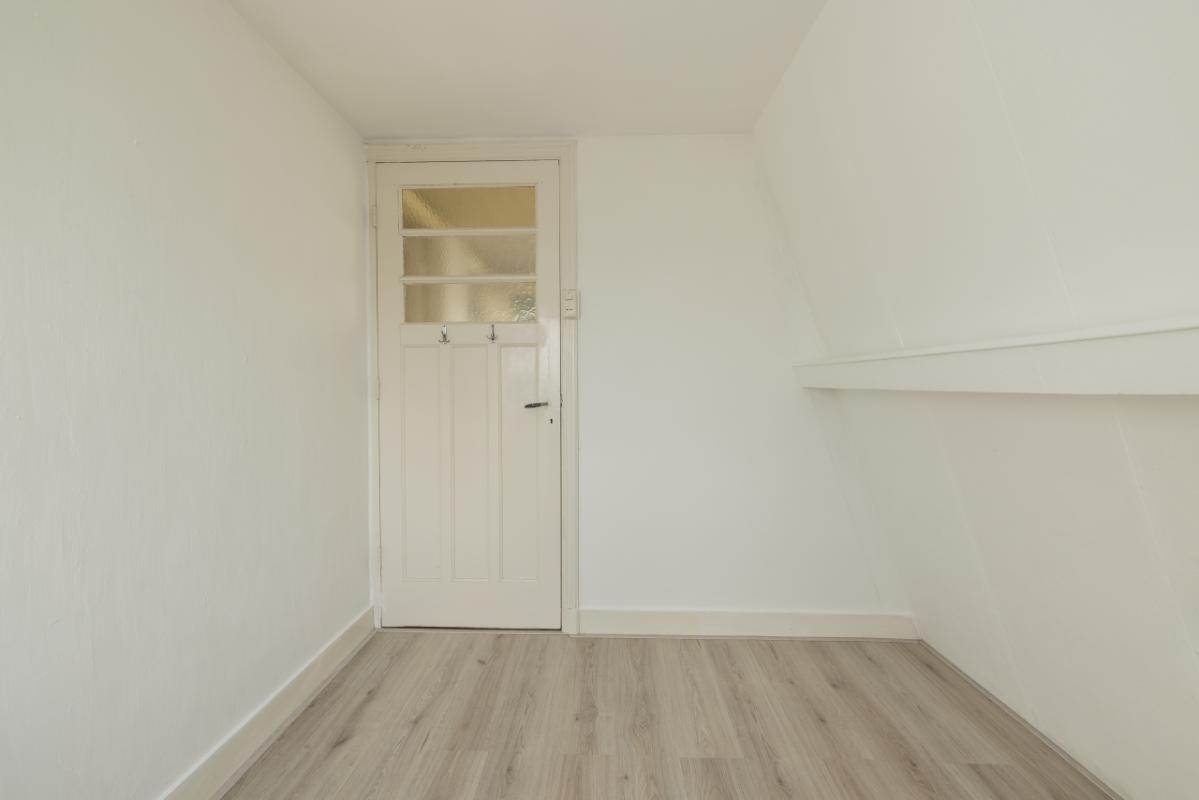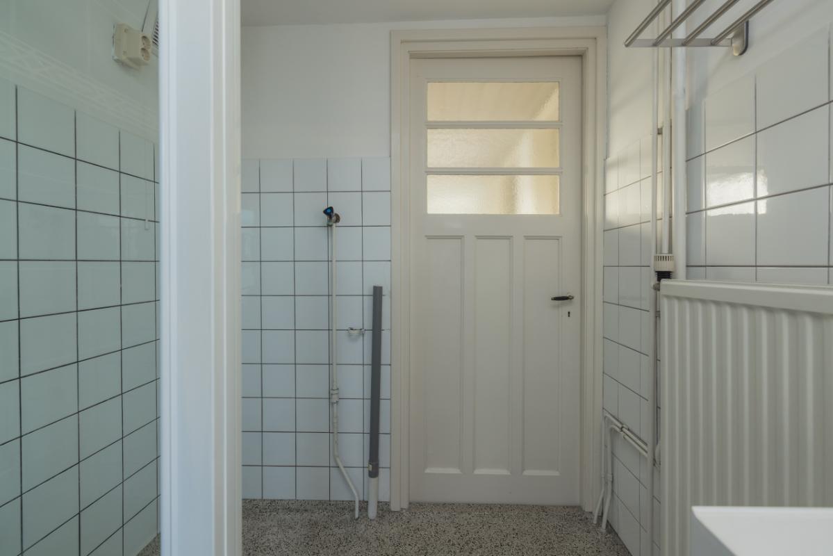 1e Etage Vanaf de overloop, voorzien van een dakvenster, zijn de drie slaapkamers op deze verdieping bereikbaar. Aan de voorzijde bevindt zich een ruime slaapkamer met vaste schuifdeurkast. Aan de achterzijde liggen twee slaapkamers, waaronder een ruime kamer met eveneens een vaste schuifdeurkast. Op de vloer van deze etage ligt een fraaie laminaatvloer en de kamers zijn verder voorzien van sfeervolle paneeldeuren, wat bijdraagt aan de karakteristieke uitstraling van de woning. De badkamer bevindt zich aan de voorzijde en is uitgevoerd in een lichte kleurstelling met grijstinten, voorzien van een originele granitovloer, douchecabine, wastafelmeubel en aansluiting voor de wasmachine.