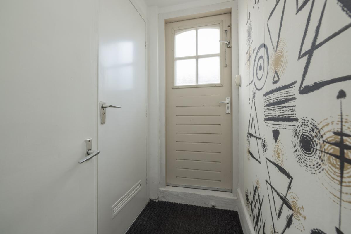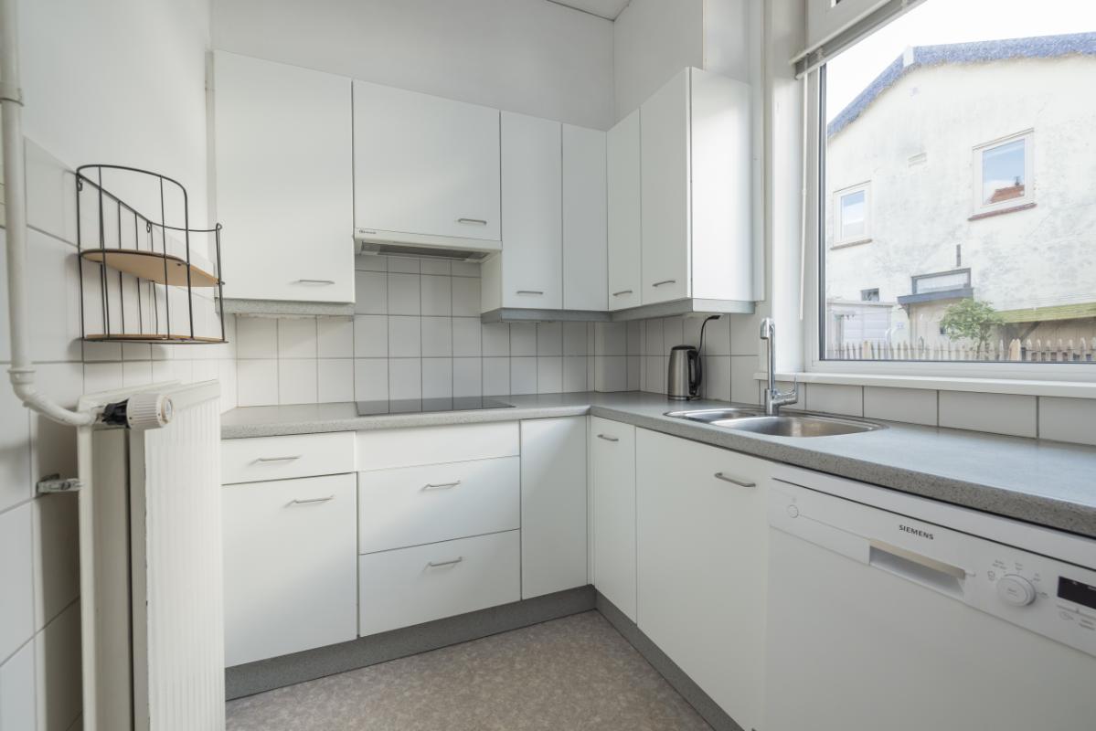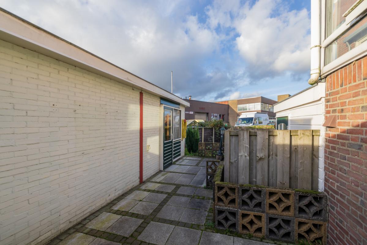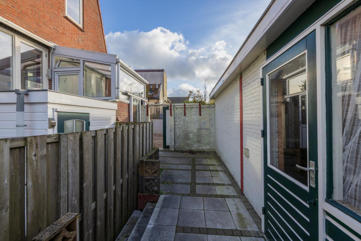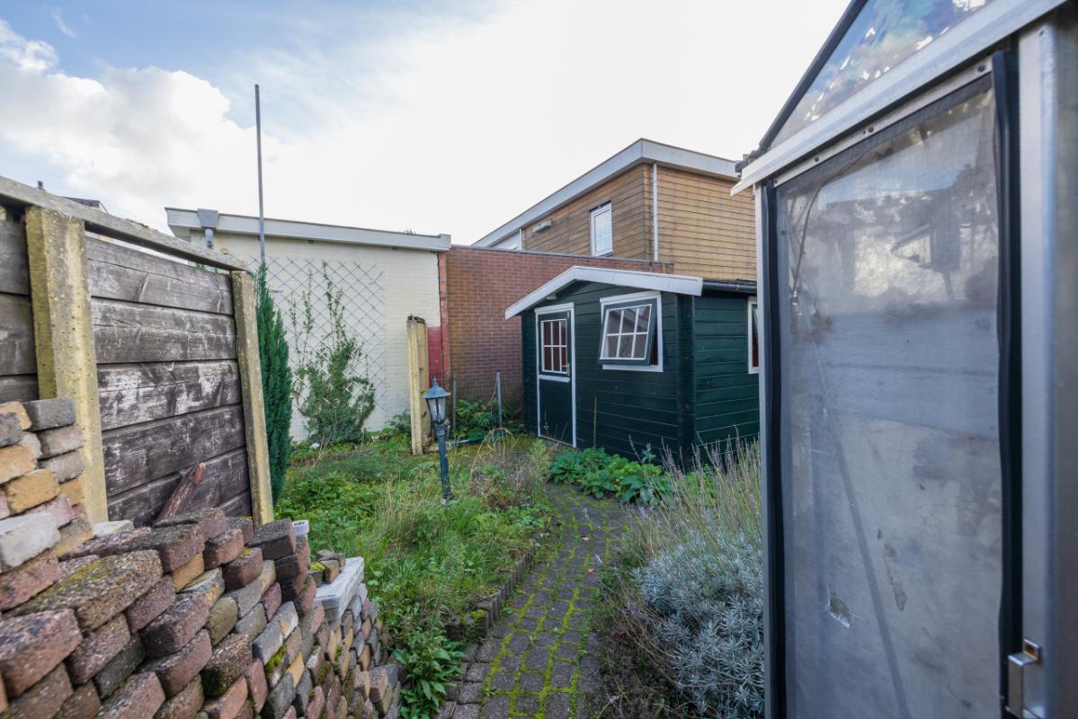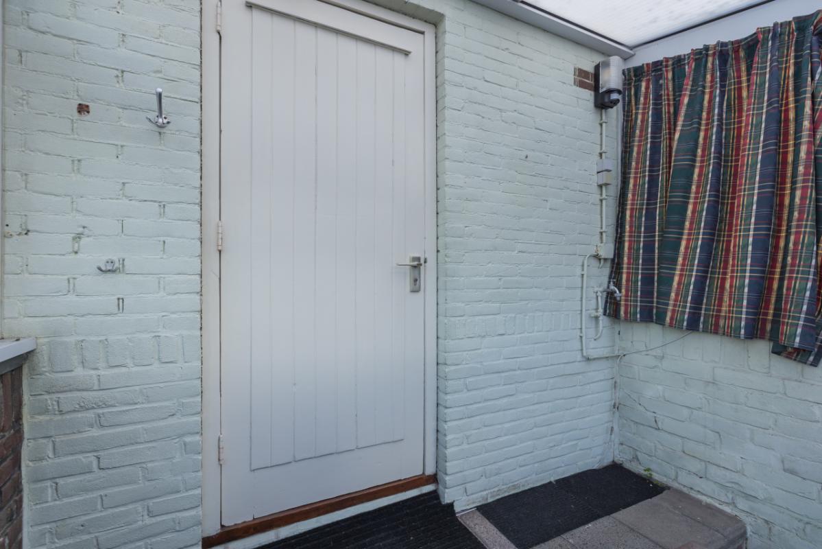 Indeling De entree bevindt zich aan de achterzijde en is bereikbaar via de zijtuin. Vanuit de hal is er toegang tot de badkamer, uitgevoerd in zwart-wit kleurstelling en voorzien van een inloopdouche en toilet. De lichte woonkamer (circa 17 m²) heeft een groot raam met een uitzicht op de eigen zijtuin, wat zorgt voor veel natuurlijk lichtinval. Aansluitend bevindt zich een aparte, eenvoudige keukenruimte met daarachter een ruime bijkeuken/berging, waar tevens de cv-combiketel (Remeha, ca. 2021) is opgesteld. De ruime slaapkamer (circa 11 m²) ligt aan de voorzijde van de woning en is bereikbaar via de woonkamer. Zowel de woonkamer als de slaapkamer zijn voorzien van kunststof kozijnen met dubbel glas.