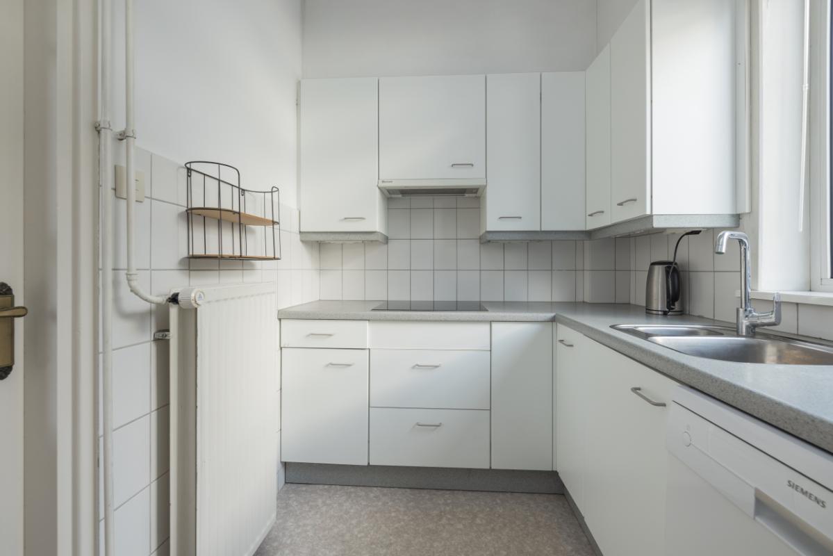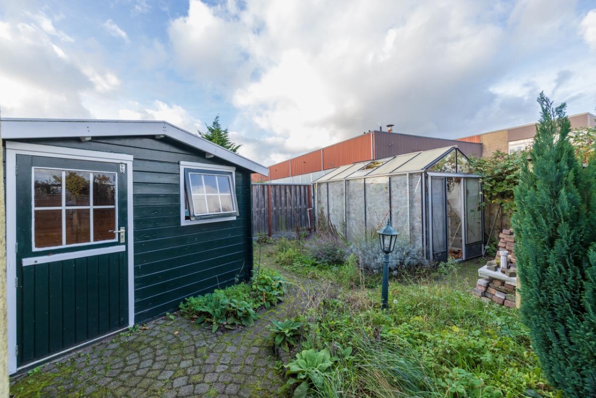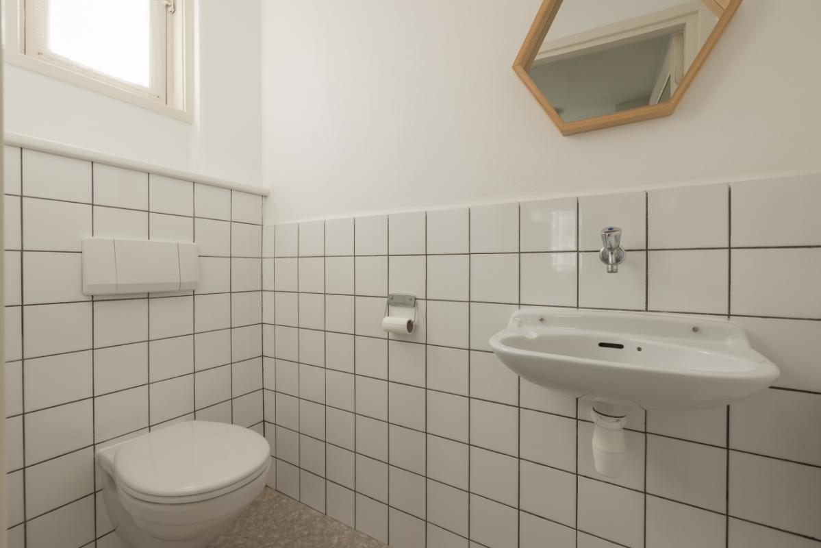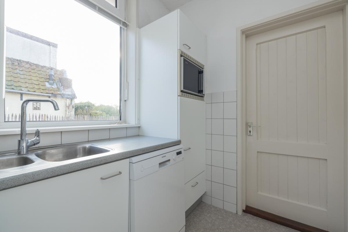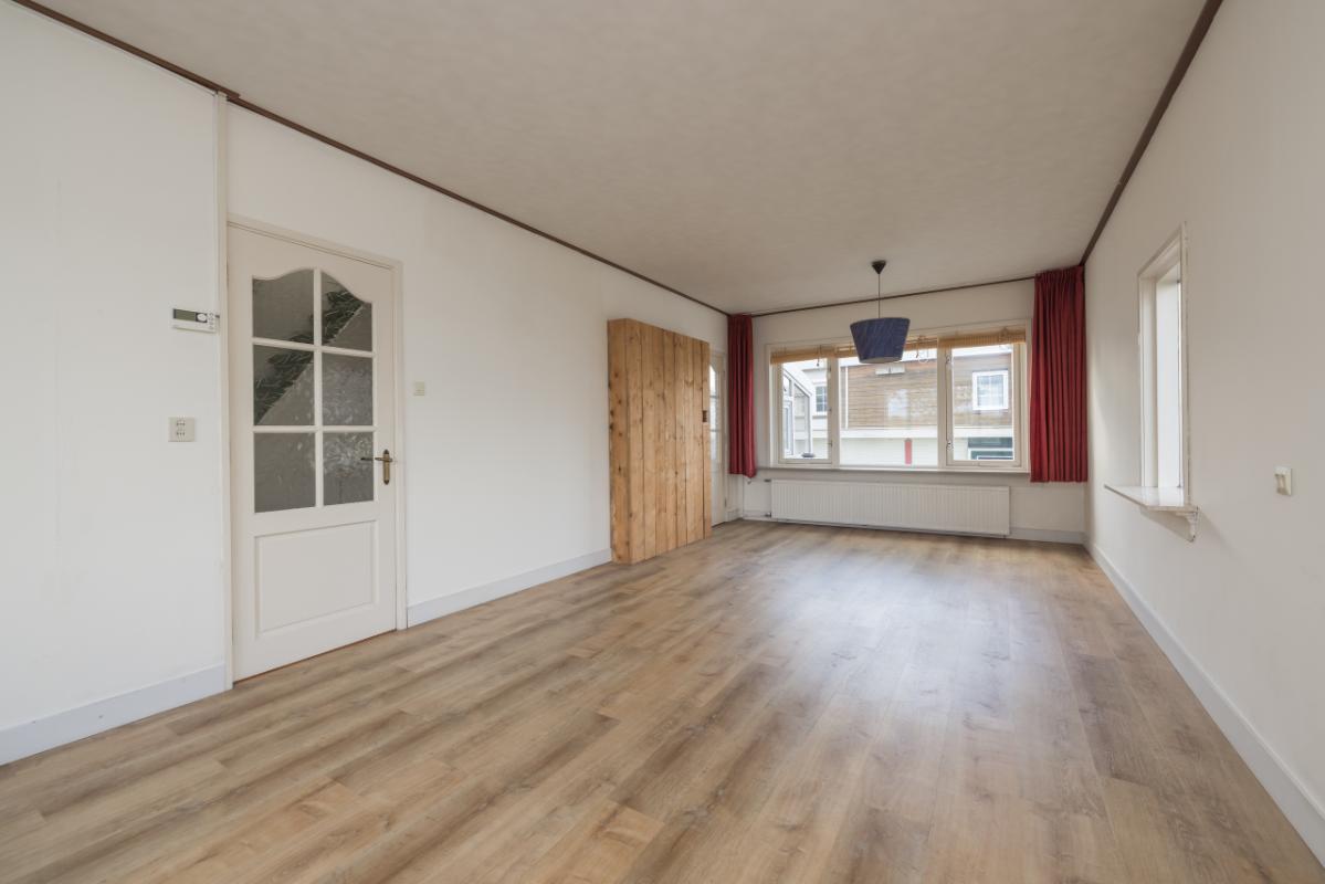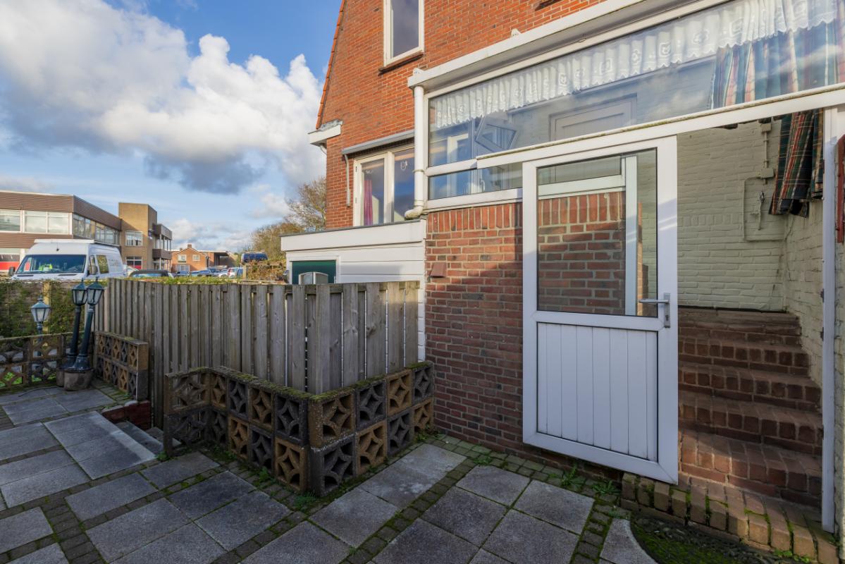 Indeling De entree bevindt zich aan de achterzijde en is bereikbaar via de zijtuin. Vanuit de hal is er toegang tot de badkamer, uitgevoerd in zwart-wit kleurstelling en voorzien van een inloopdouche en toilet. De lichte woonkamer (circa 17 m²) heeft een groot raam met een uitzicht op de eigen zijtuin, wat zorgt voor veel natuurlijk lichtinval. Aansluitend bevindt zich een aparte, eenvoudige keukenruimte met daarachter een ruime bijkeuken/berging, waar tevens de cv-combiketel (Remeha, ca. 2021) is opgesteld. De ruime slaapkamer (circa 11 m²) ligt aan de voorzijde van de woning en is bereikbaar via de woonkamer. Zowel de woonkamer als de slaapkamer zijn voorzien van kunststof kozijnen met dubbel glas.