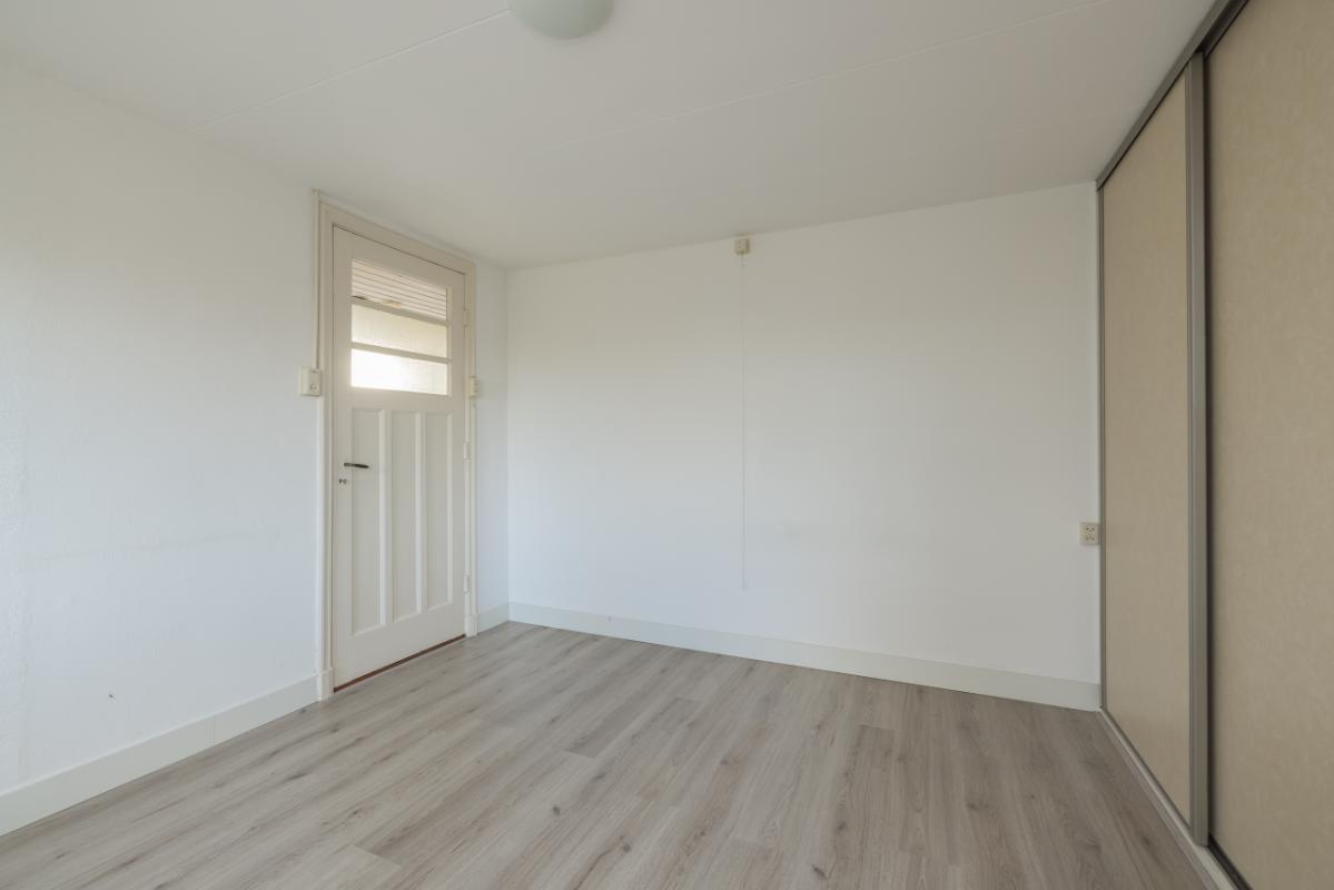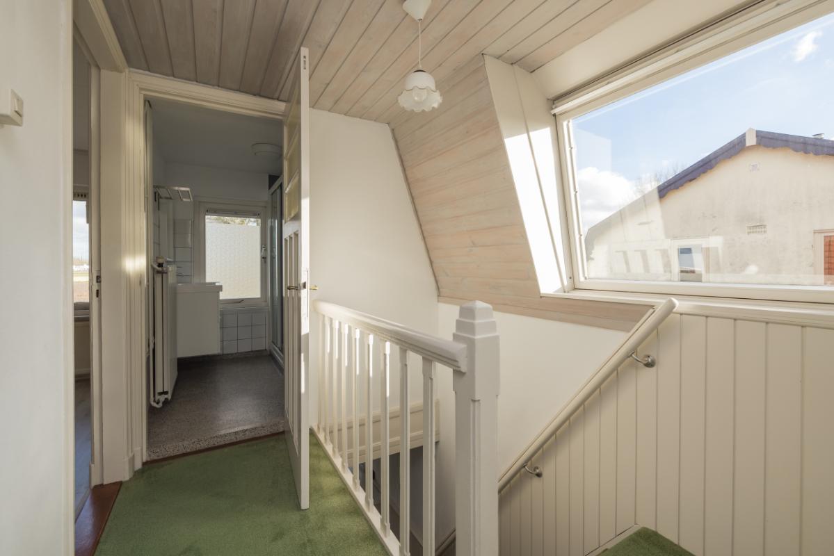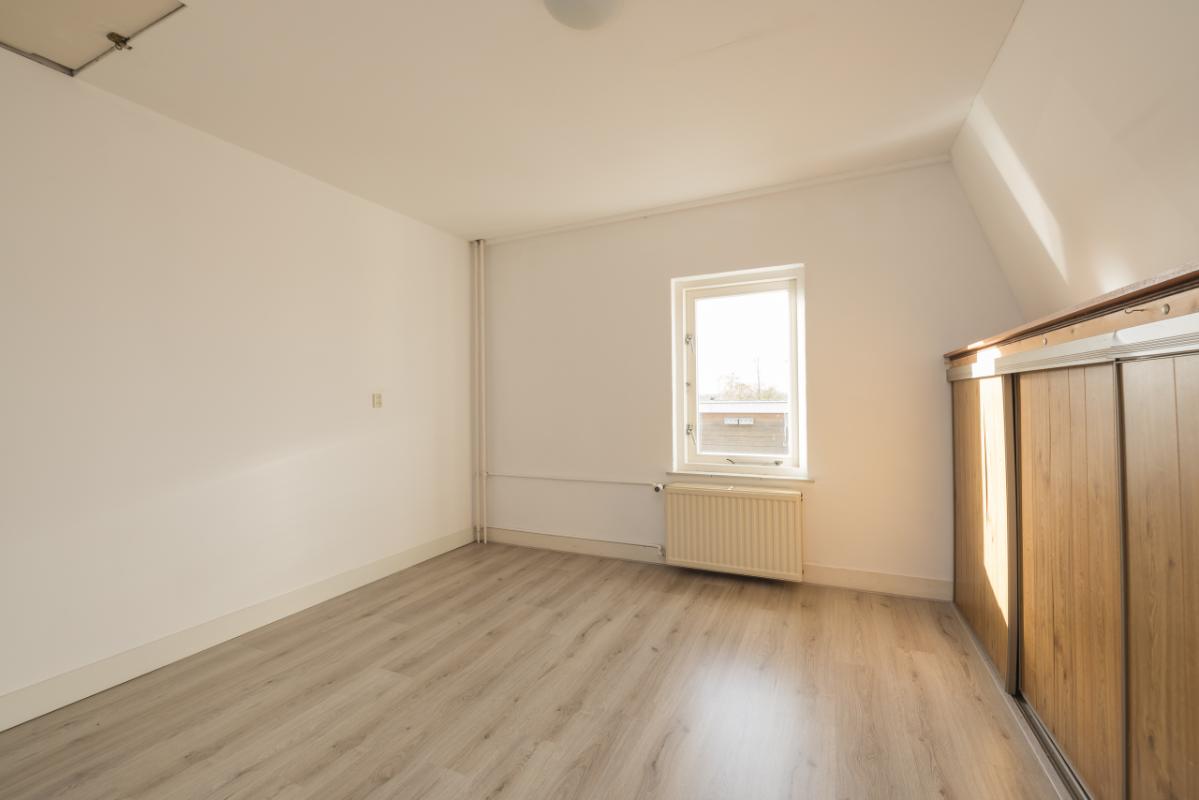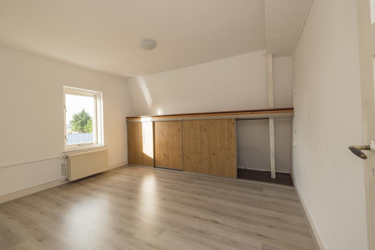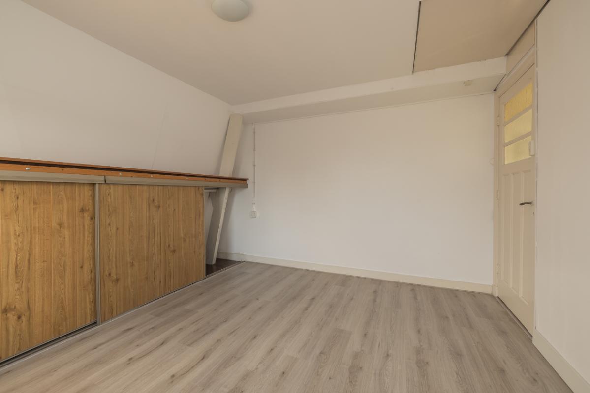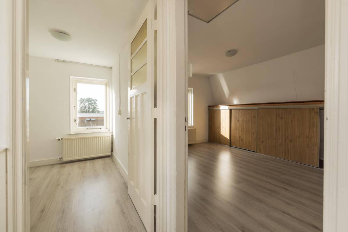 1e Etage (3e woonlaag) Vanaf de overloop, voorzien van een dakvenster, zijn de drie slaapkamers op deze verdieping bereikbaar. Aan de voorzijde bevindt zich een ruime slaapkamer met vaste schuifdeurkast. Aan de achterzijde liggen twee slaapkamers, waaronder een ruime kamer met eveneens een vaste schuifdeurkast. Op de vloer van deze etage ligt een fraaie laminaatvloer en de kamers zijn verder voorzien van sfeervolle paneeldeuren, wat bijdraagt aan de karakteristieke uitstraling van de woning.