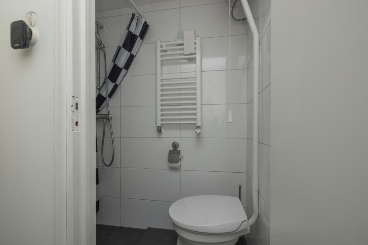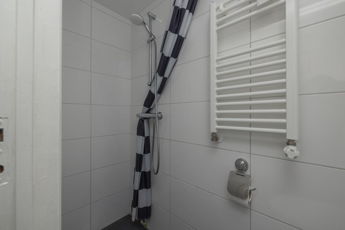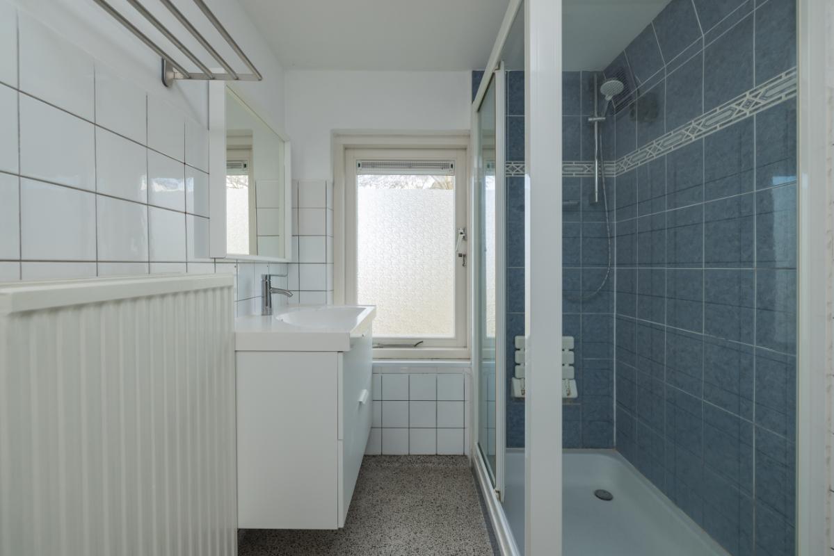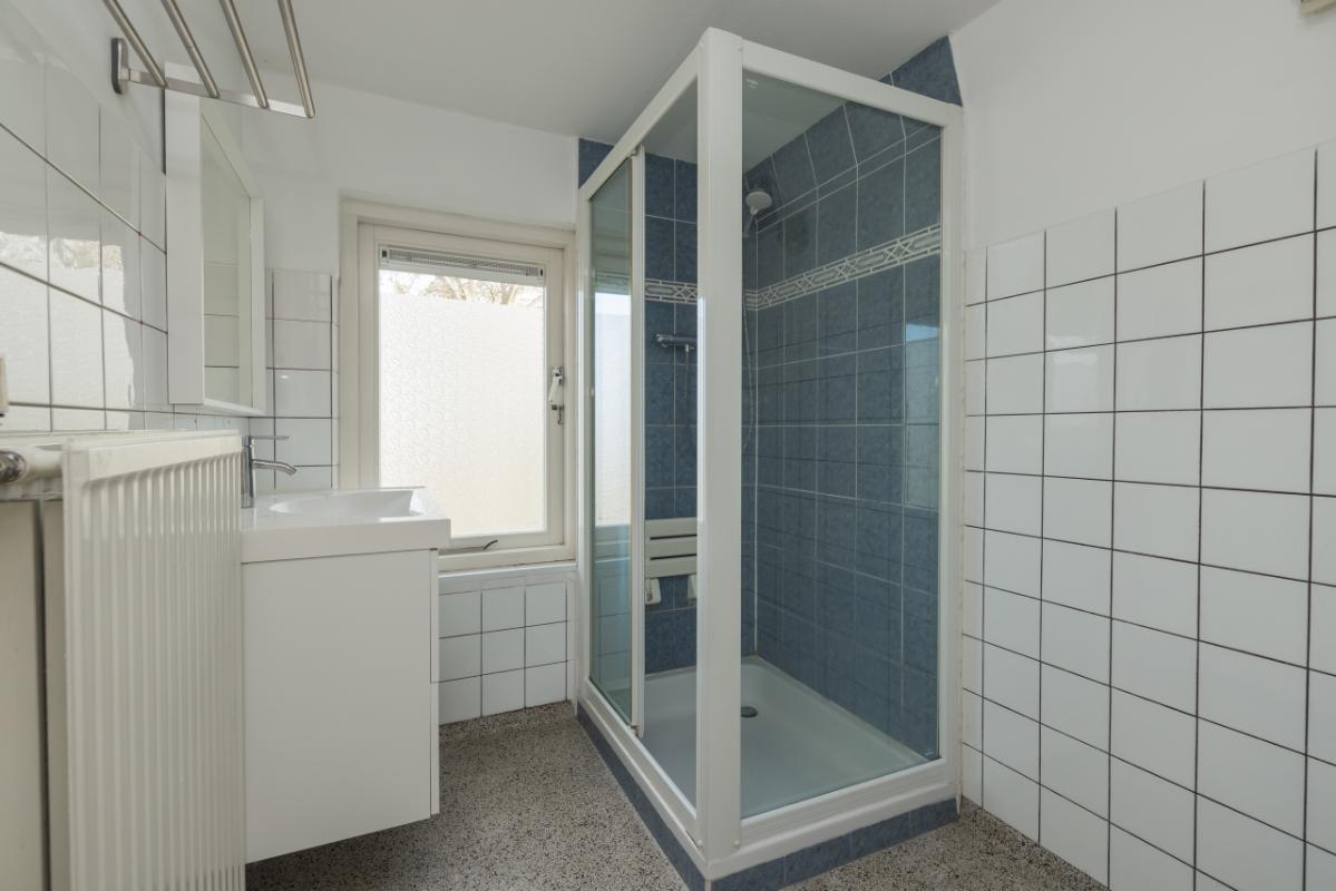 De badkamer bevindt zich aan de voorzijde en is uitgevoerd in een lichte kleurstelling met grijstinten, voorzien van een originele granitovloer, douchecabine, wastafelmeubel en aansluiting voor de wasmachine.