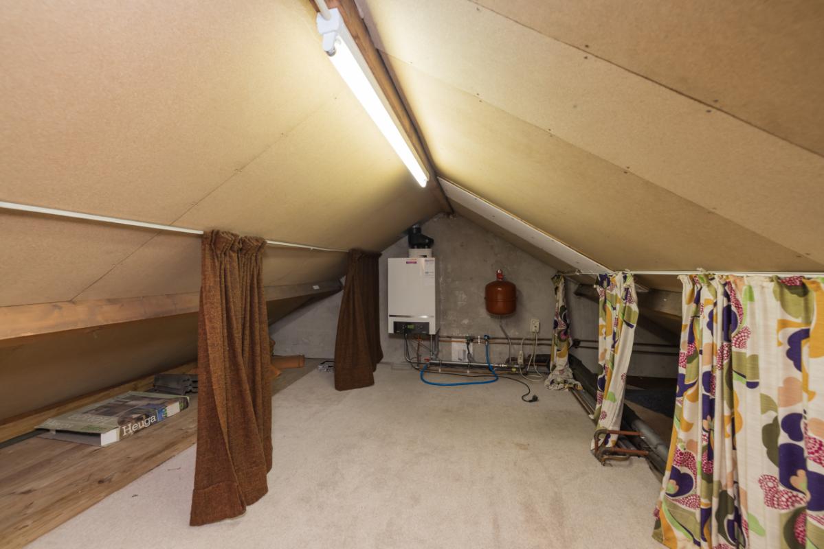 Zolder Via een luik met vlizotrap in de achterslaapkamer is de bergvliering bereikbaar. Op de zolder bevindt zich de opstelling van de cv-combiketel (Nefit HR Topline, 2012) en is er voldoende bergruimte aanwezig.