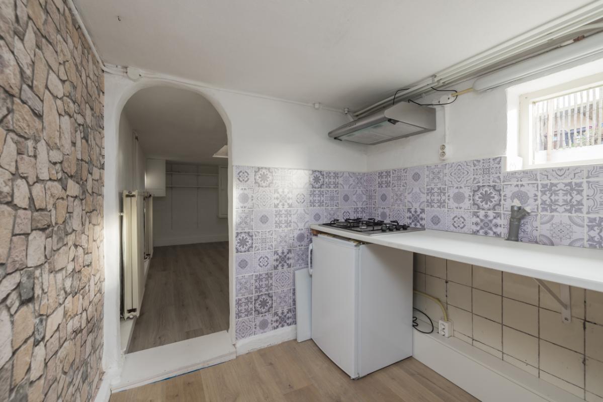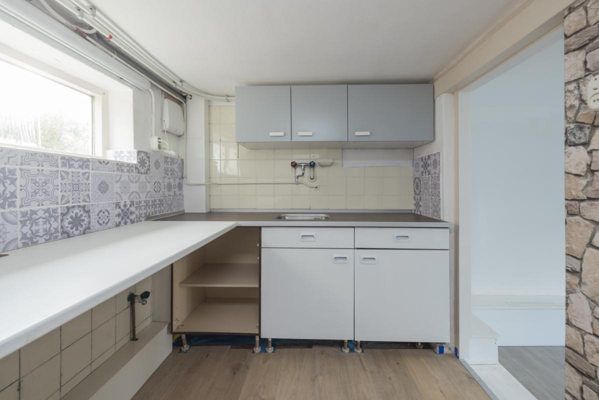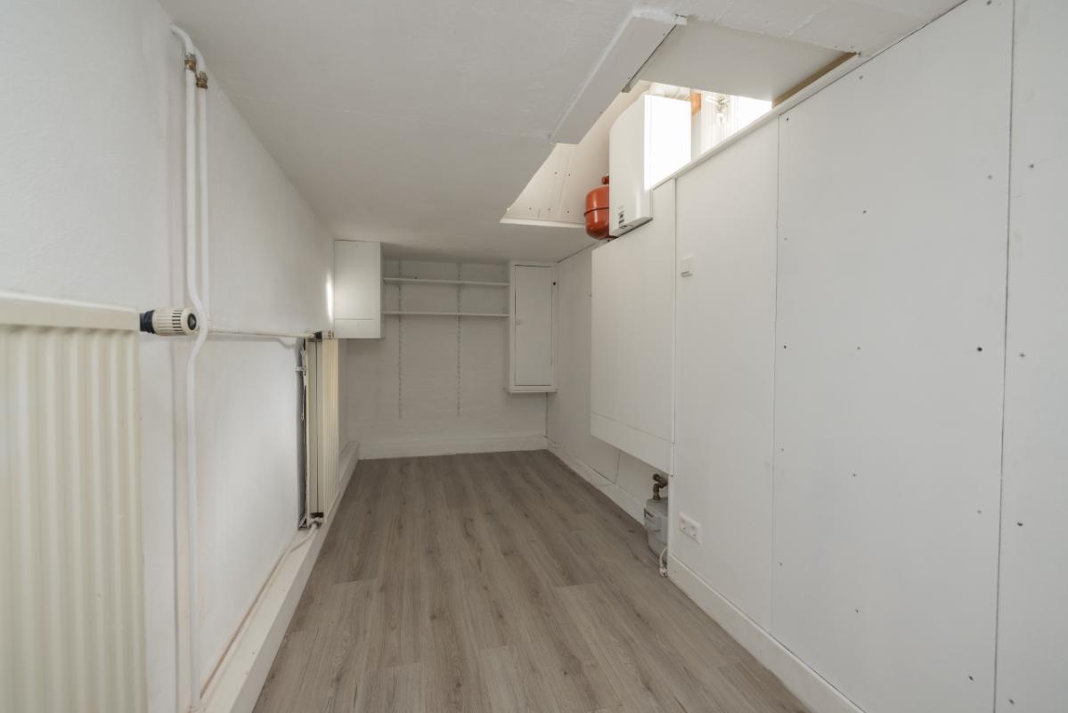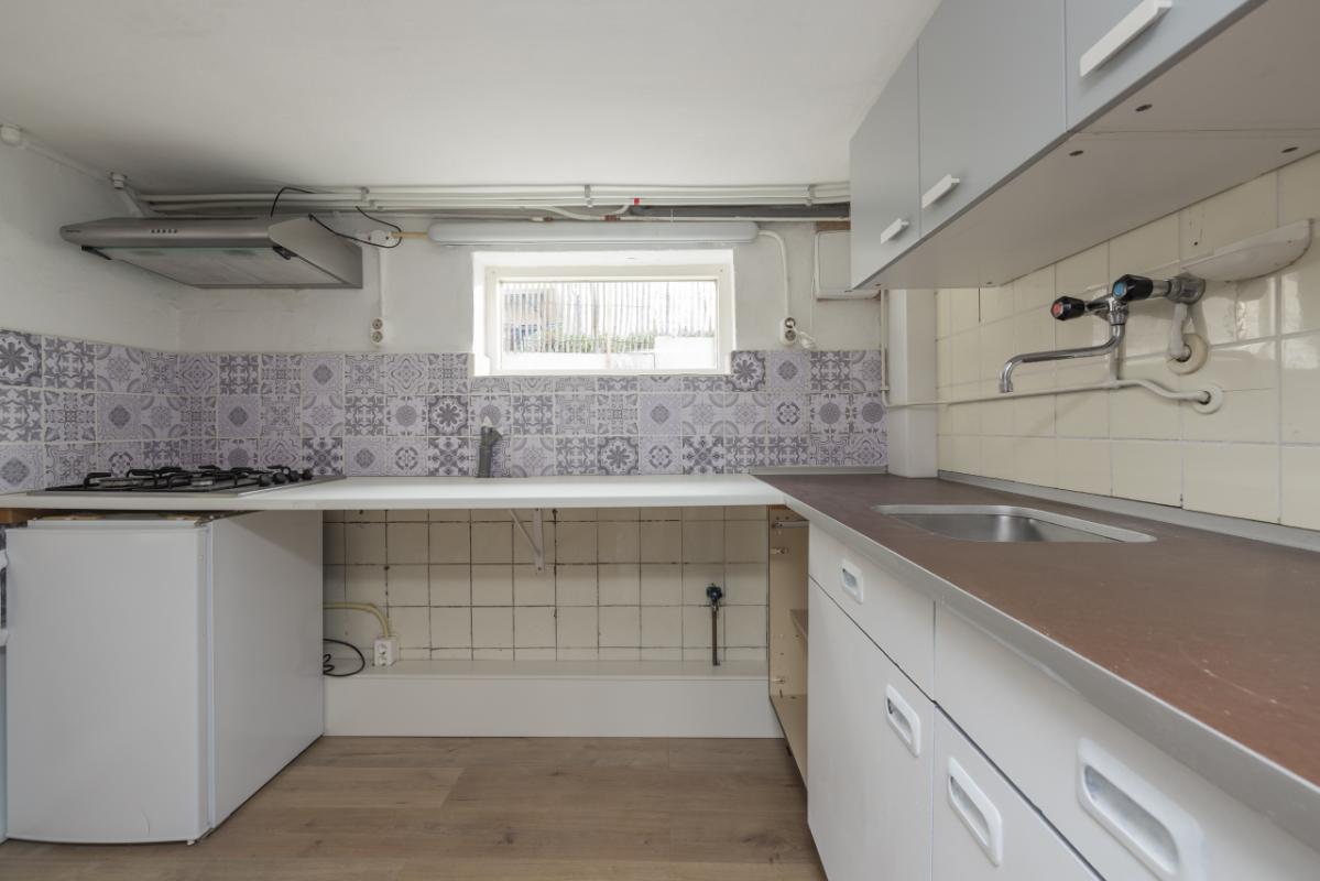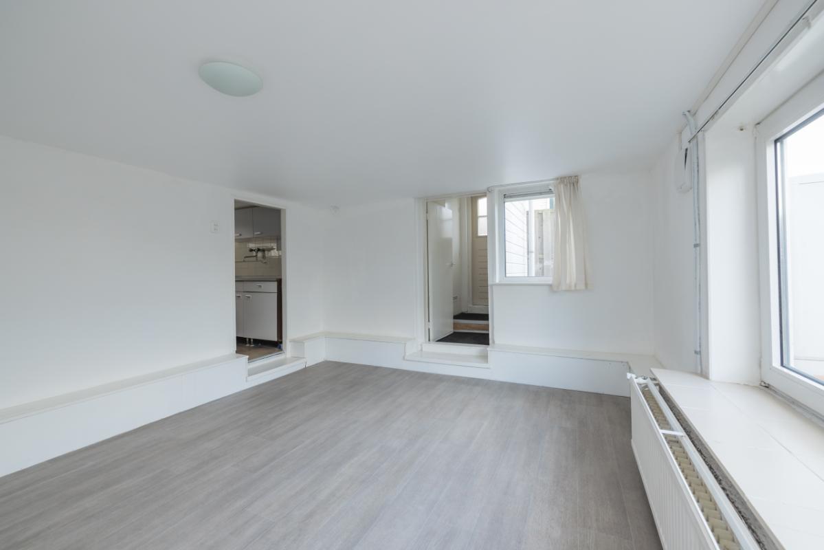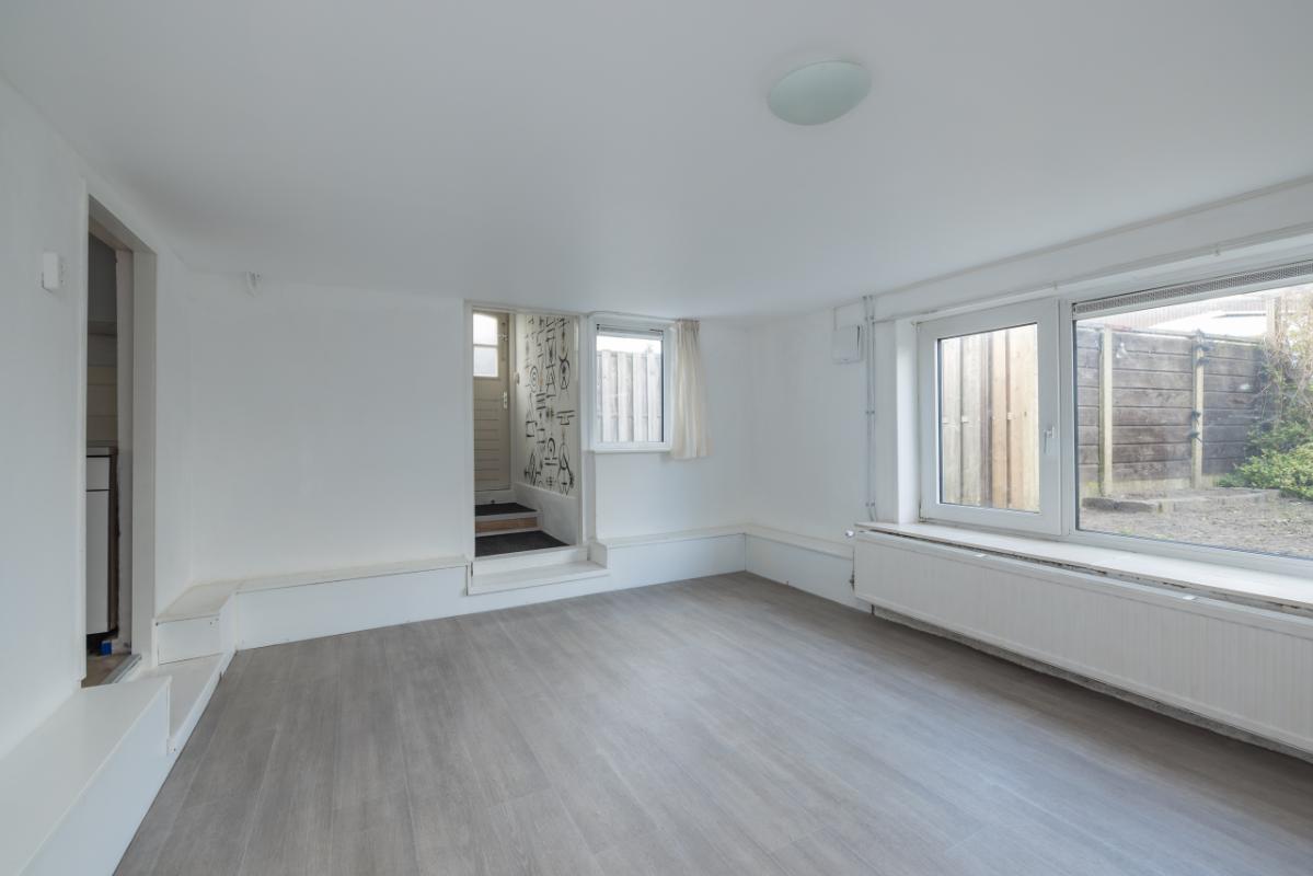 Benedenwoning (-1) De entree bevindt zich aan de achterzijde en is bereikbaar via de zijtuin. Vanuit de hal is er toegang tot de recent vernieuwde badkamer, uitgevoerd in zwart-wit kleurstelling en voorzien van een inloopdouche en toilet. De lichte woonkamer (circa 17 m²) heeft een groot raam met een uitzicht op de eigen zijtuin, wat zorgt voor veel natuurlijk lichtinval. Aansluitend bevindt zich een aparte, eenvoudige keukenruimte met daarachter een ruime bijkeuken/kantoor waar tevens de cv-combiketel (Remeha, ca. 2021) is opgesteld. De ruime slaapkamer (circa 11 m²) ligt aan de voorzijde van de woning en is bereikbaar via de woonkamer. Zowel de woonkamer als de slaapkamer zijn voorzien van kunststof kozijnen met dubbel glas.