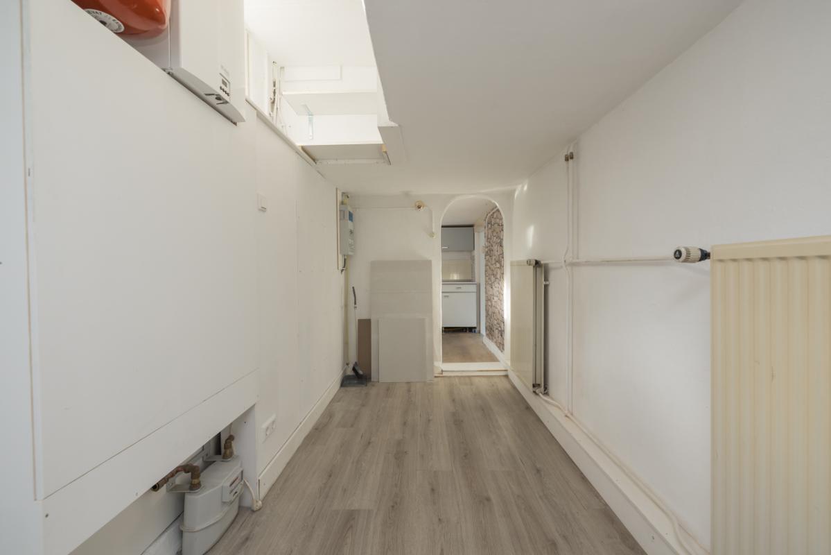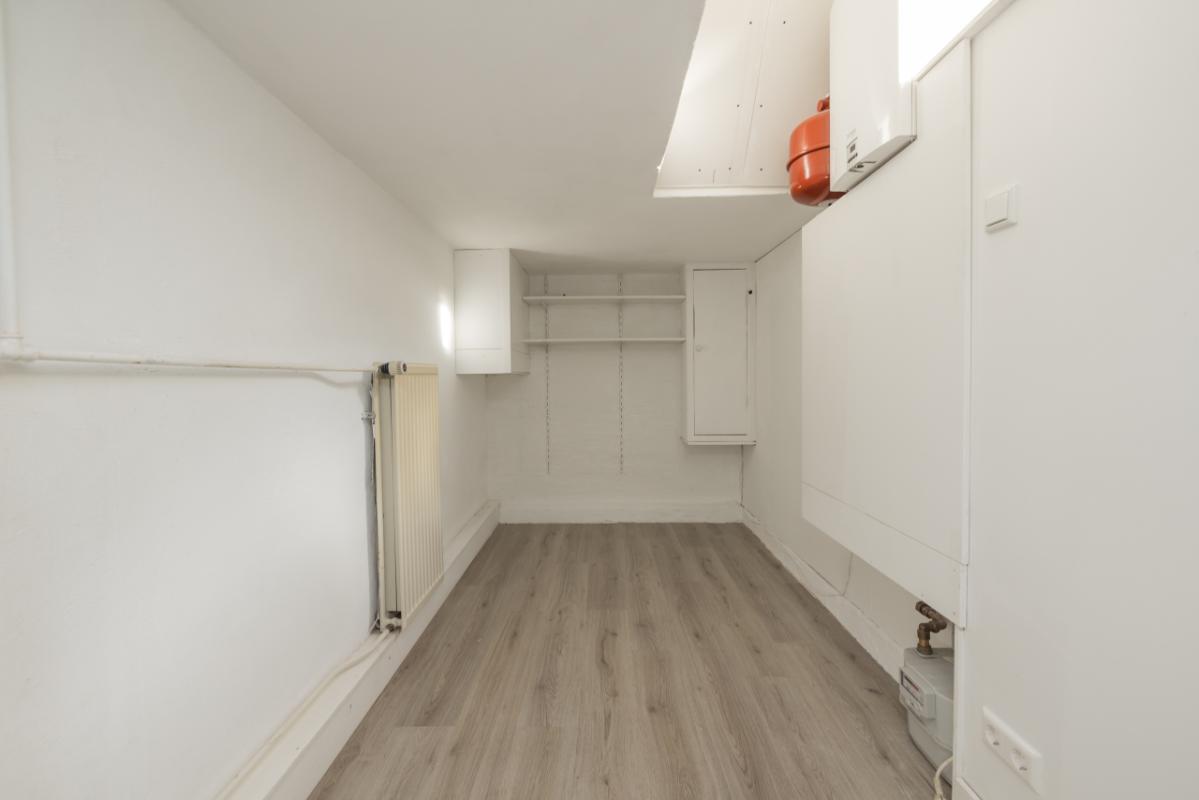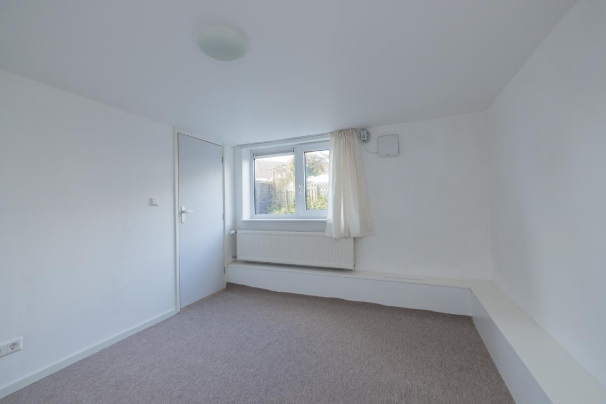 Lower apartment (-1) The entrance is at the rear, accessible via the side garden. From the hall there is access to the recently renovated bathroom in black-and-white colour scheme with walk-in shower and toilet. The bright living room (approx. 17 m²) has a large window overlooking the private side garden, providing plenty of natural light. Adjacent is a separate, simple kitchen area, with behind it a spacious utility room/office where the central heating boiler (Remeha, approx. 2021) is installed. The spacious bedroom (approx. 11 m²) is located at the front of the property and is accessed via the living room. Both the living room and bedroom have uPVC window frames with double glazing.