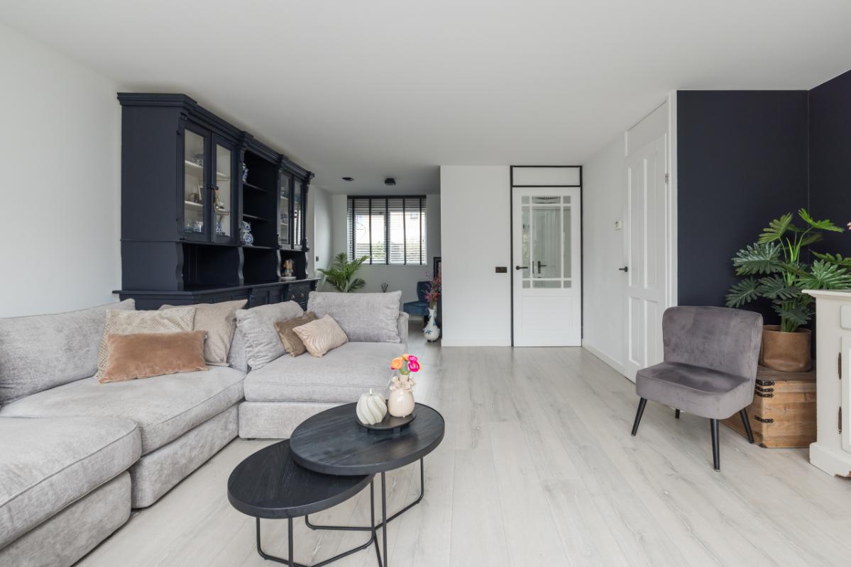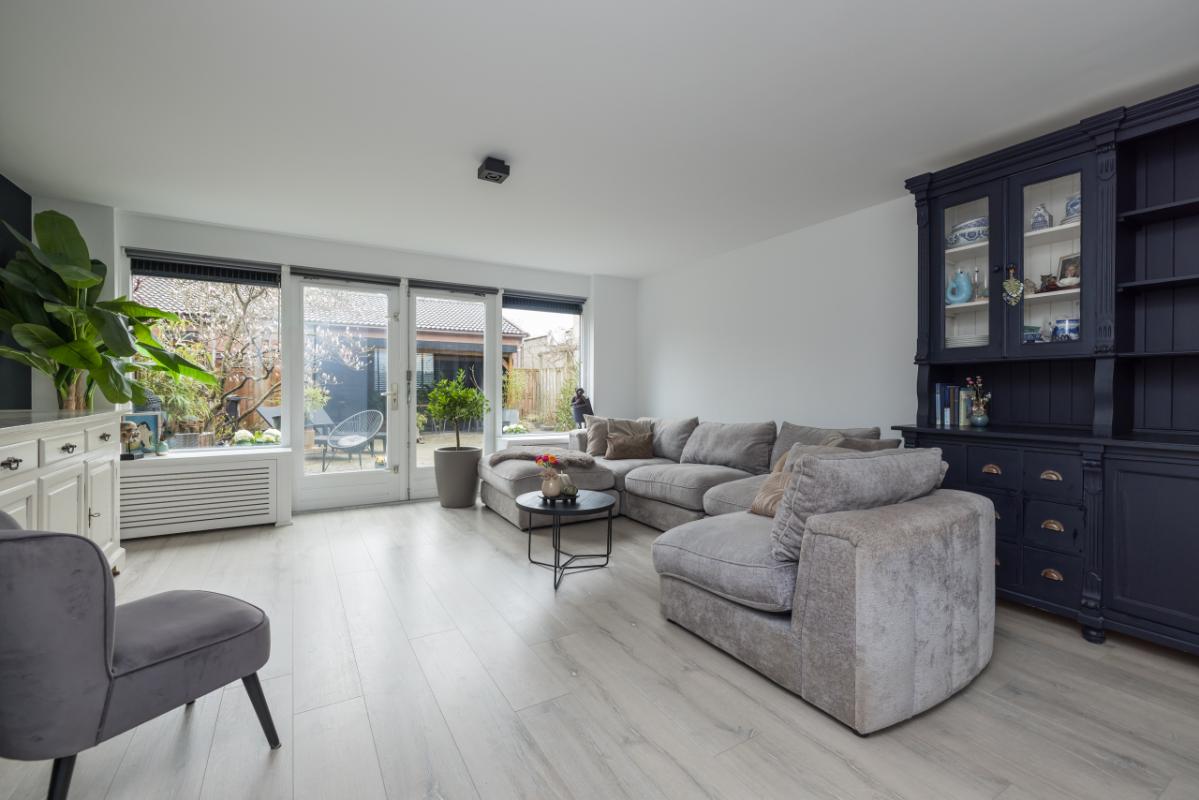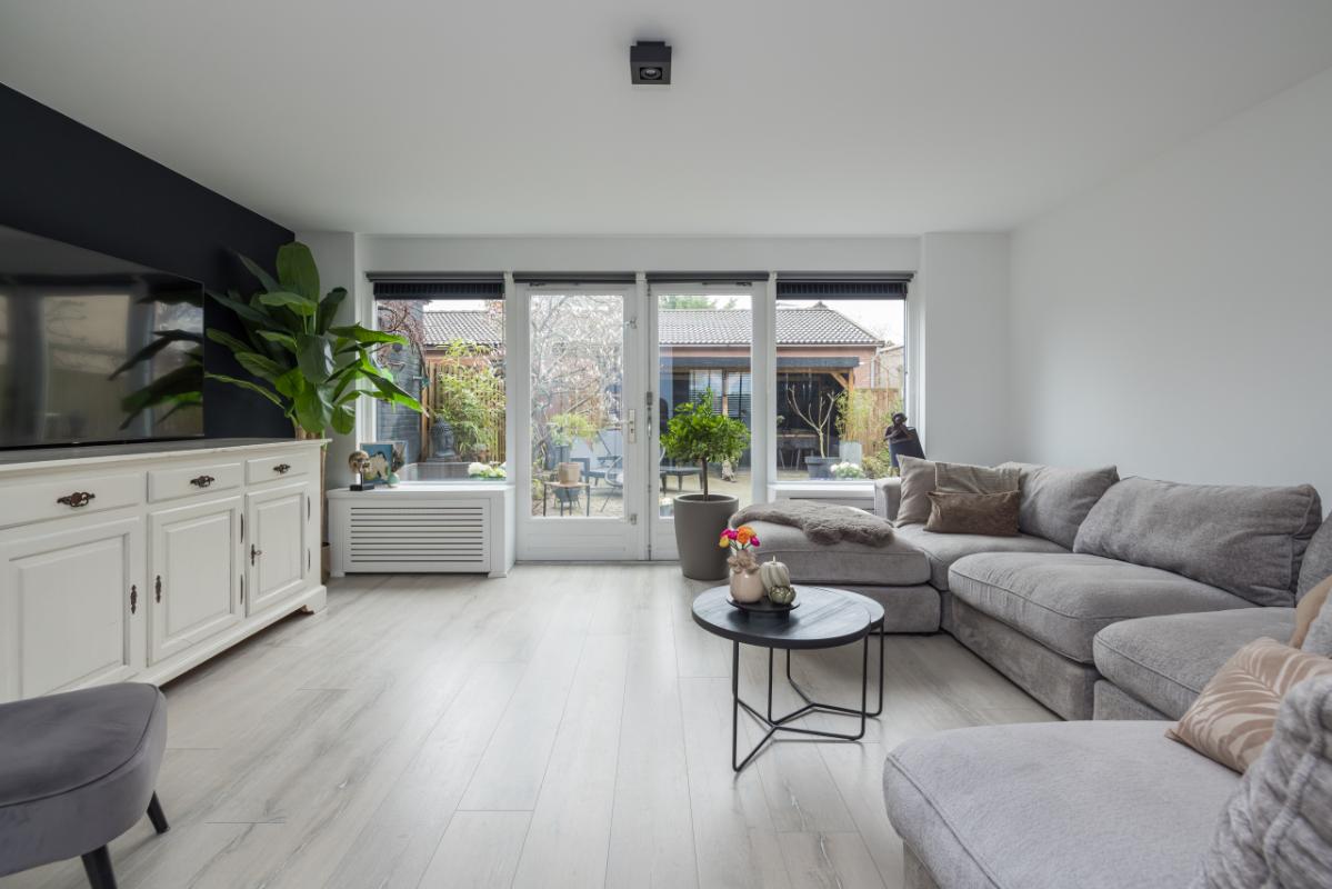 De ruime woonkamer is heerlijk licht en biedt dankzij de openslaande deuren direct toegang tot de achtertuin. Daarnaast is er een praktische trapkast aanwezig voor extra bergruimte.