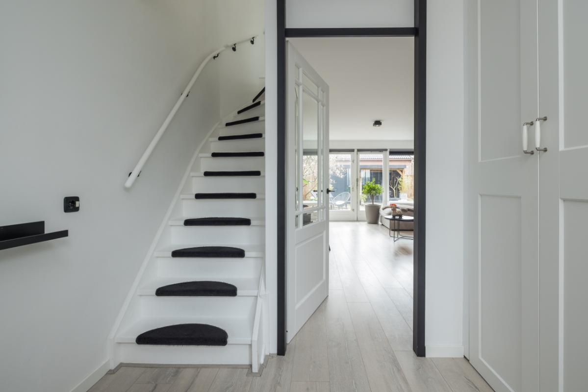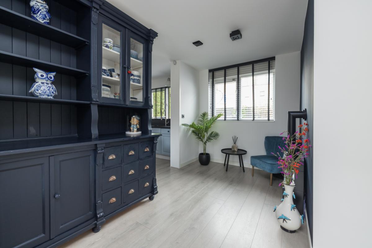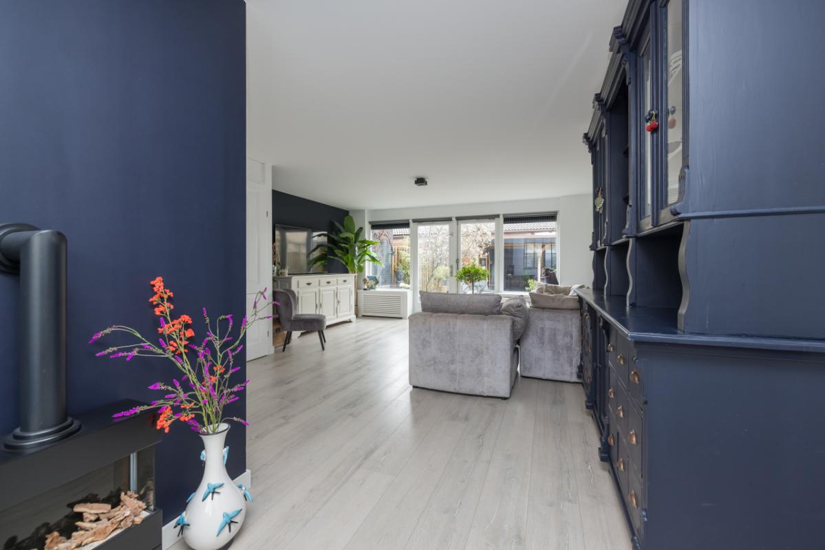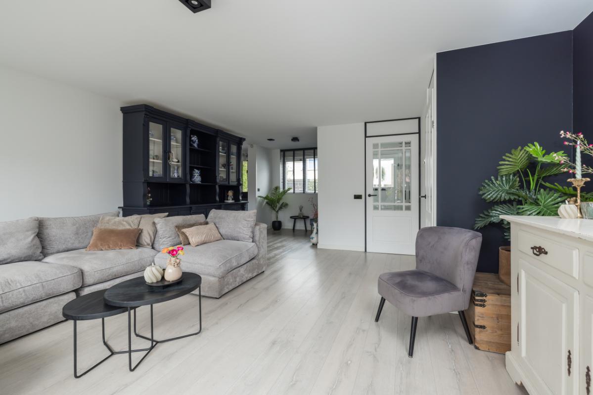 De ruime woonkamer is heerlijk licht en biedt dankzij de openslaande deuren direct toegang tot de achtertuin. Daarnaast is er een praktische trapkast aanwezig voor extra bergruimte.
