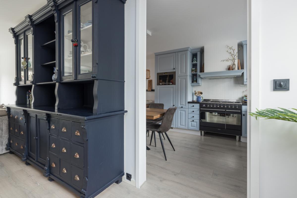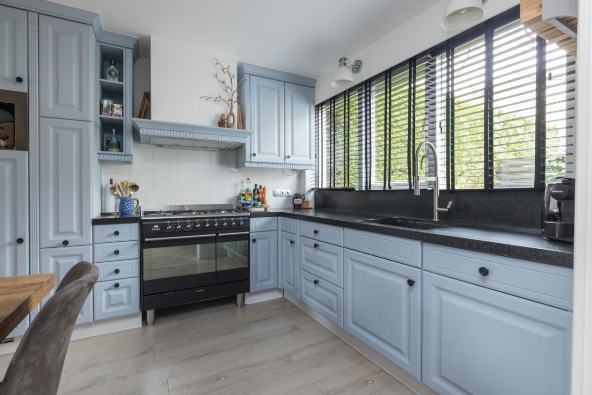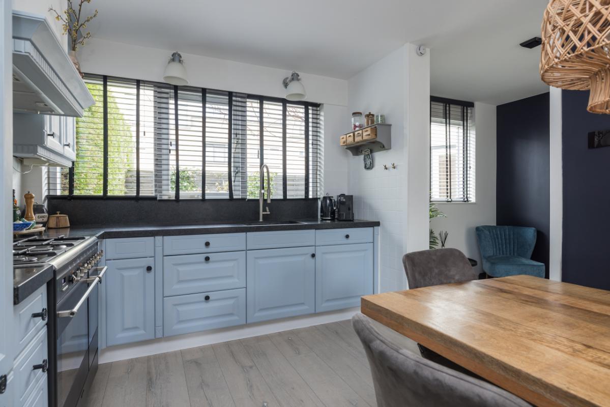 De ruime woon-eetkeuken vormt een fijne plek voor het dagelijkse gezinsleven en is voorzien van diverse inbouwapparatuur, waaronder een magnetron, een 6-pits fornuis, twee ovens, een vaatwasmachine en een praktische carrouselkast. Door de ruime opzet is er voldoende plaats voor een grote eettafel.