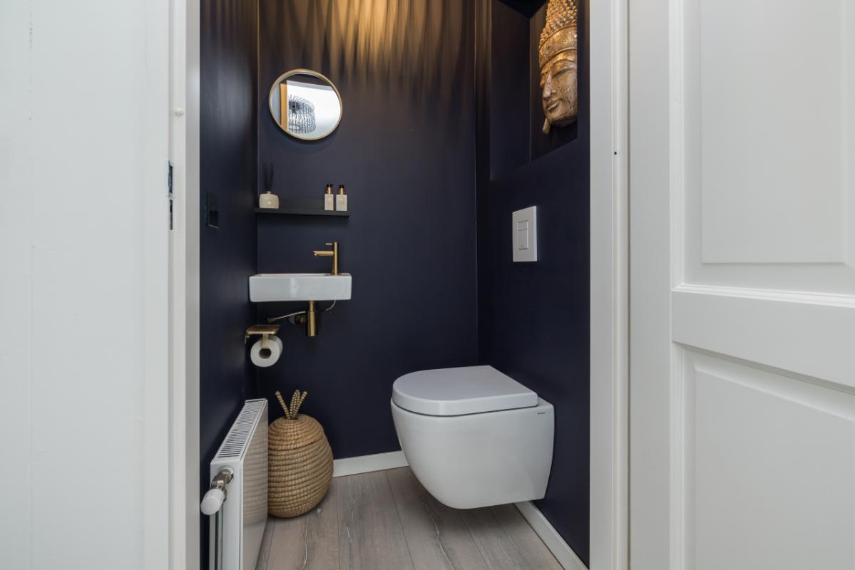 Begane grond Via de voortuin bereik je de entree van de woning. De lichte hal is voorzien van een moderne meterkast (13 groepen en glasvezelaansluiting) en een fraai afgewerkt zwevend toilet (2022) met wandcloset en fonteintje.