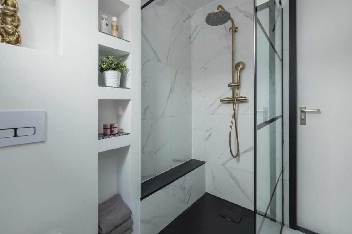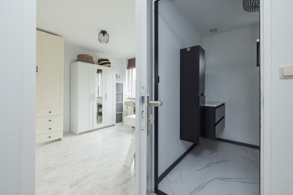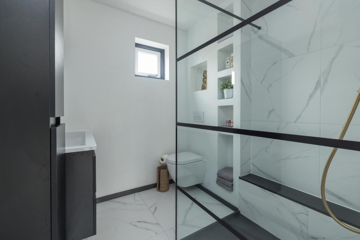 De moderne badkamer (2022) aan de voorzijde is stijlvol afgewerkt met een marmerlook en voorzien van een inloopdouche, wandcloset, wastafelmeubel en een verwarmde spiegel.