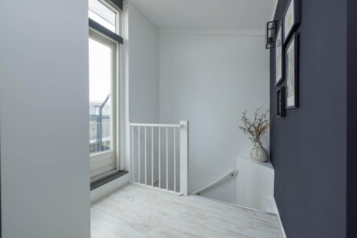 Tweede verdieping De tweede verdieping beschikt over een ruime overloop en een grote vijfde slaapkamer. Vanuit deze slaapkamer heb je via een deur toegang tot het zonnige dakterras, een heerlijke plek om in alle privacy van de buitenlucht te genieten.