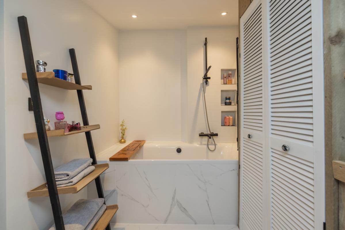 This floor also contains the second bathroom (2022). This bathroom is fitted with a bathtub with shower, a washbasin cabinet and a cupboard housing the central heating boiler (Nefit Topline) and the mechanical ventilation unit.