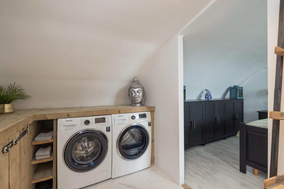 Op deze verdieping bevindt zich tevens de tweede badkamer (2022). Deze badkamer is voorzien van een ligbad met douche, een wastafelmeubel en een kast waarin de CV-ketel (Nefit Topline) en de mechanische ventilatiebox zijn geplaatst.