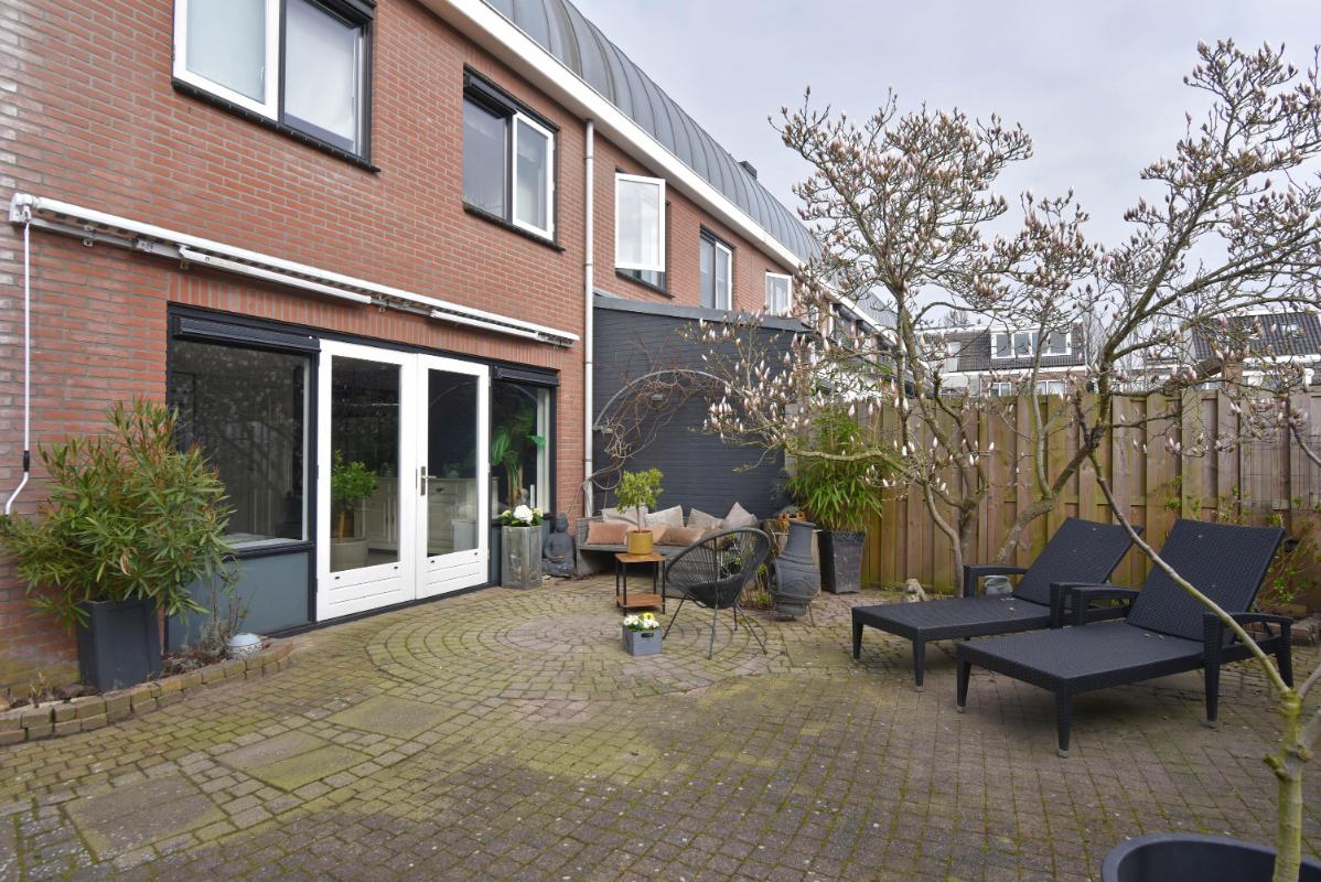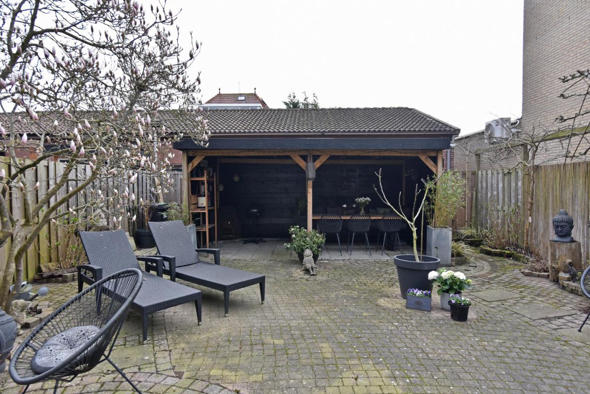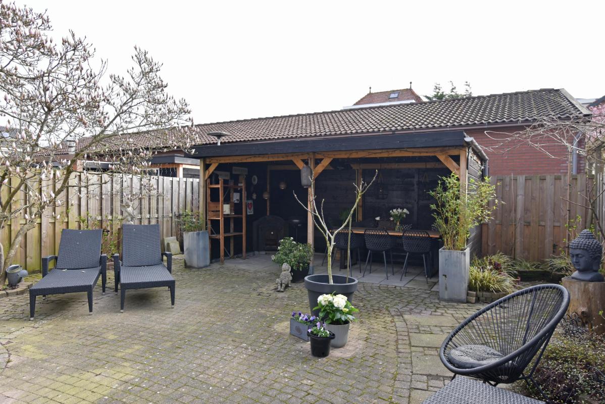 De zonnige achtertuin is verzorgd aangelegd met sierstraatwerk en beschikt over een fraaie veranda, waardoor je hier vrijwel het hele jaar door comfortabel buiten kunt zitten. Daarnaast is er een praktische achterom aanwezig.