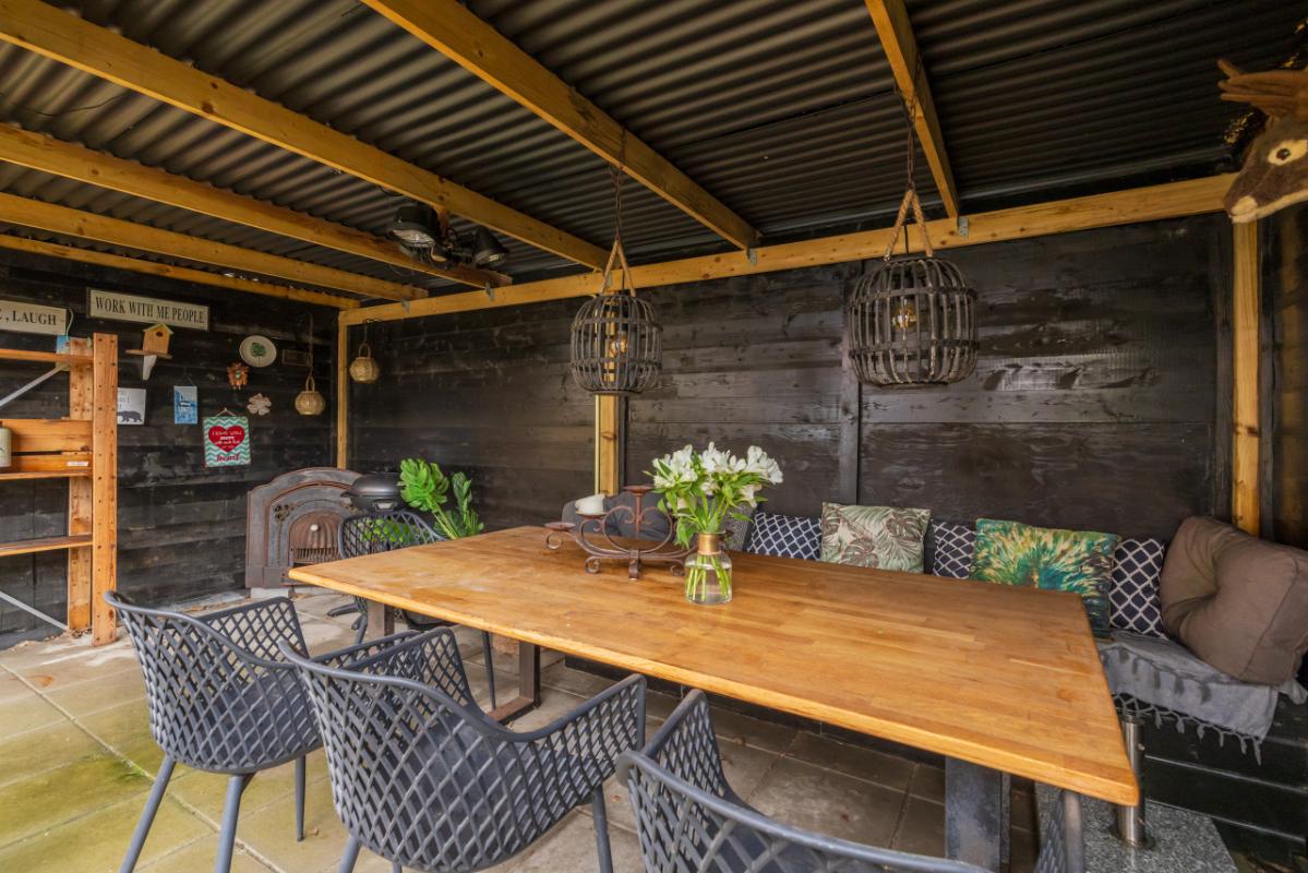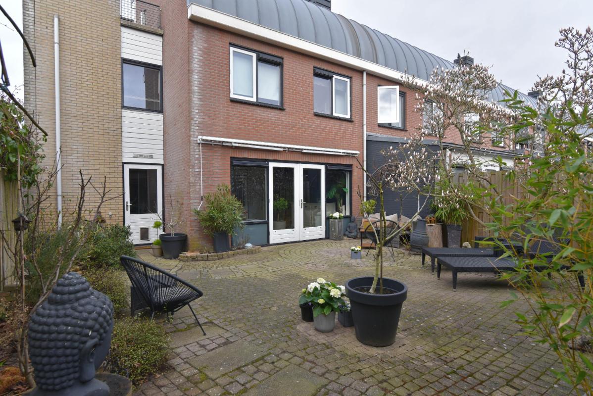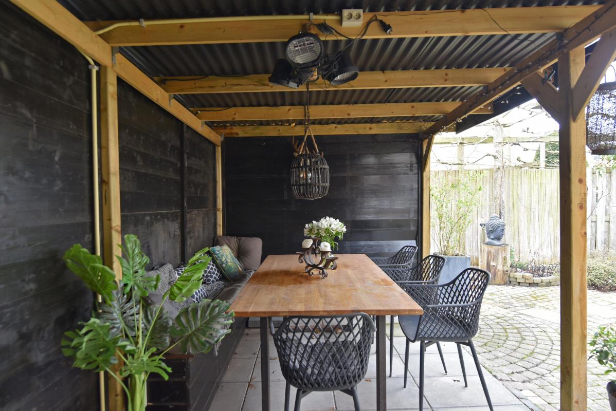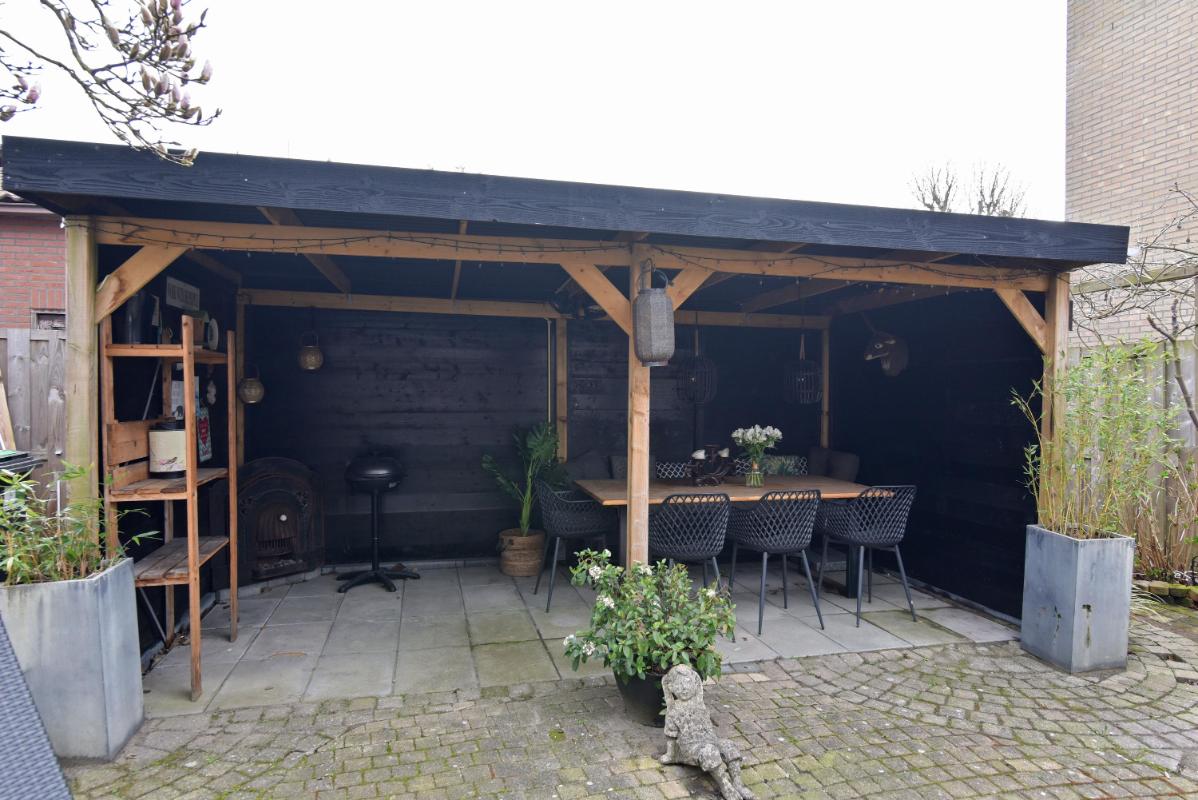De zonnige achtertuin is verzorgd aangelegd met sierstraatwerk en beschikt over een fraaie veranda, waardoor je hier vrijwel het hele jaar door comfortabel buiten kunt zitten. Daarnaast is er een praktische achterom aanwezig.