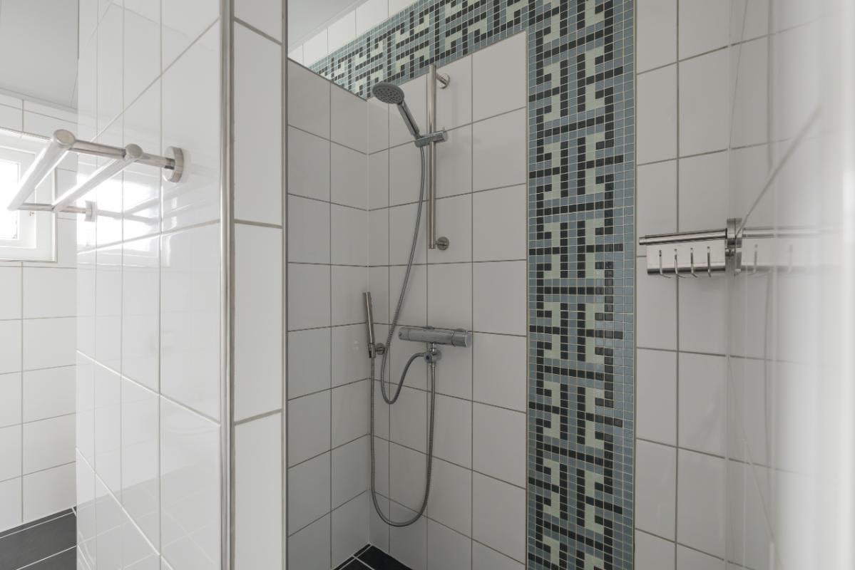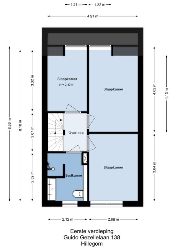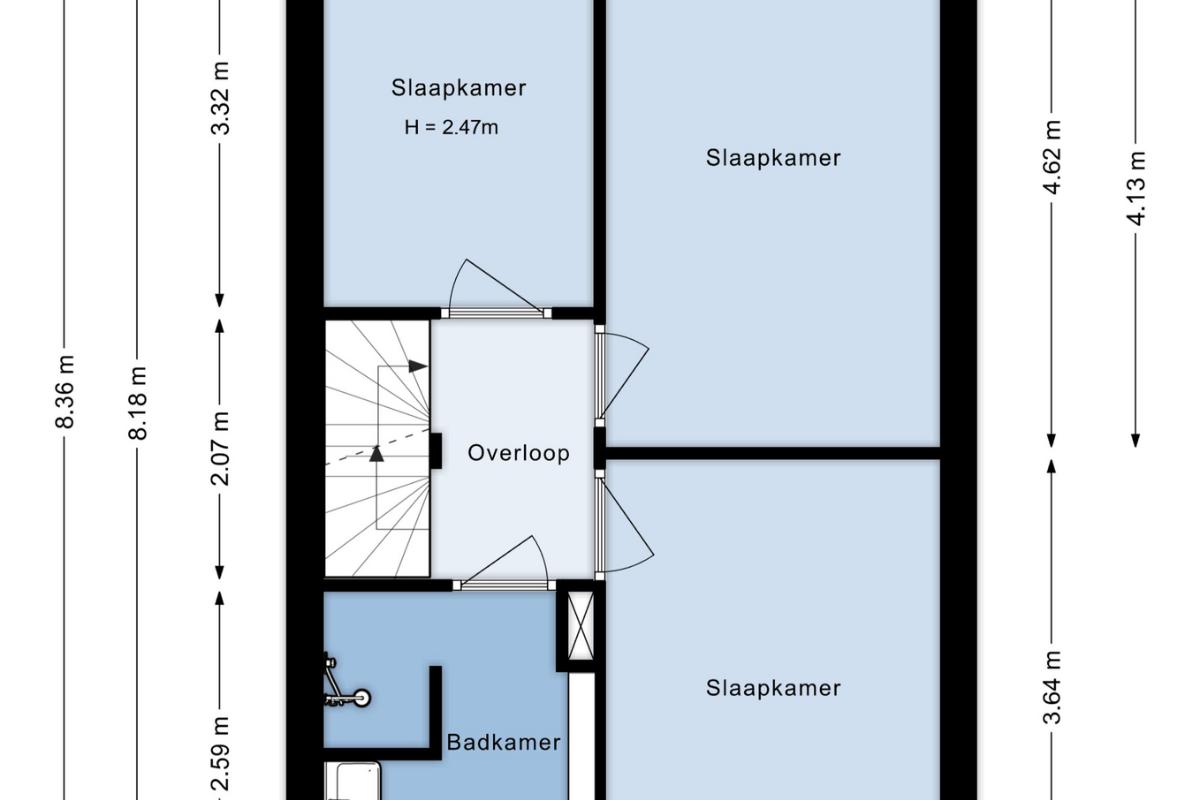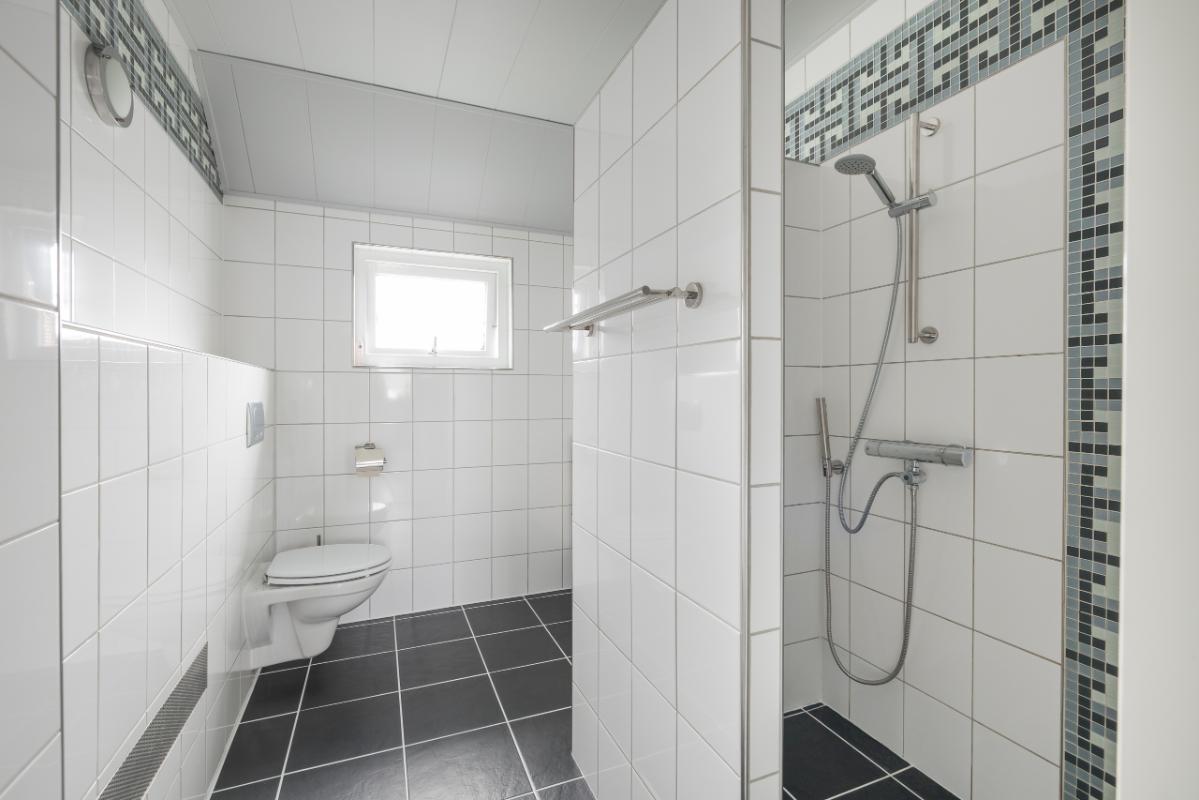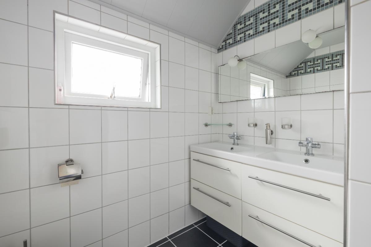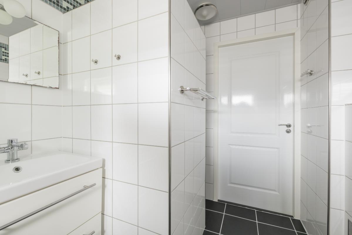 1e etage Overloop met toegang tot drie slaapkamers. Twee slaapkamers bevinden zich aan de achterzijde en zijn voorzien van een dakkapel, de derde slaapkamer ligt aan de voorzijde. De badkamer, eveneens aan de voorzijde gesitueerd, is uitgevoerd in een moderne wit/zwarte kleurstelling en beschikt over een ruime inloopdouche, een dubbel wastafelmeubel en een zwevend toilet. Op de gehele verdieping ligt een lichte plavuizen tegelvloer.